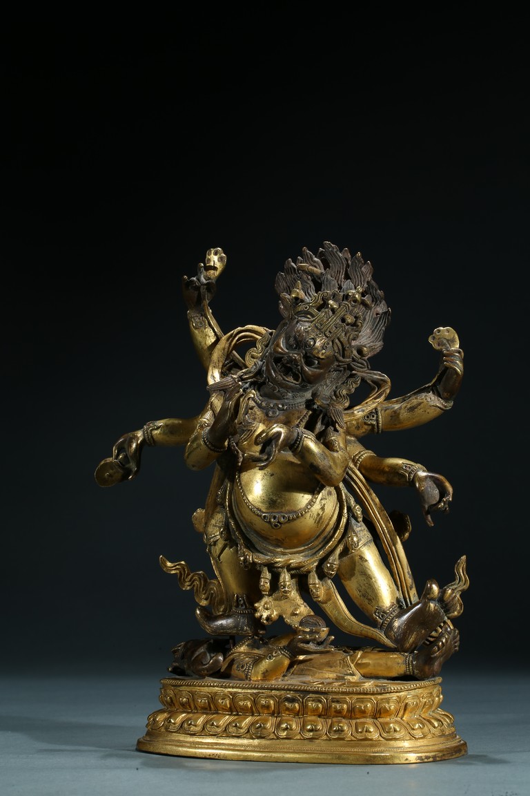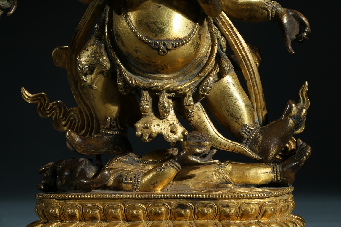 Shown standing on top of an elephant-headed prostrate figure on a oval double lotus throne, the bodhisattva holds a chopper on right primary hand, the remaining hands holding various attributes; his body adorned with beaded jewllery, a cord around waist hung with skulls, and a tiger skin skirt. His face is shown with ferocious expression with three painted bulging eyes, open mouth, and flame-like eyebrow. His head surmounted by skull tiara, the hair rising in flames. Qing Dynasty period.