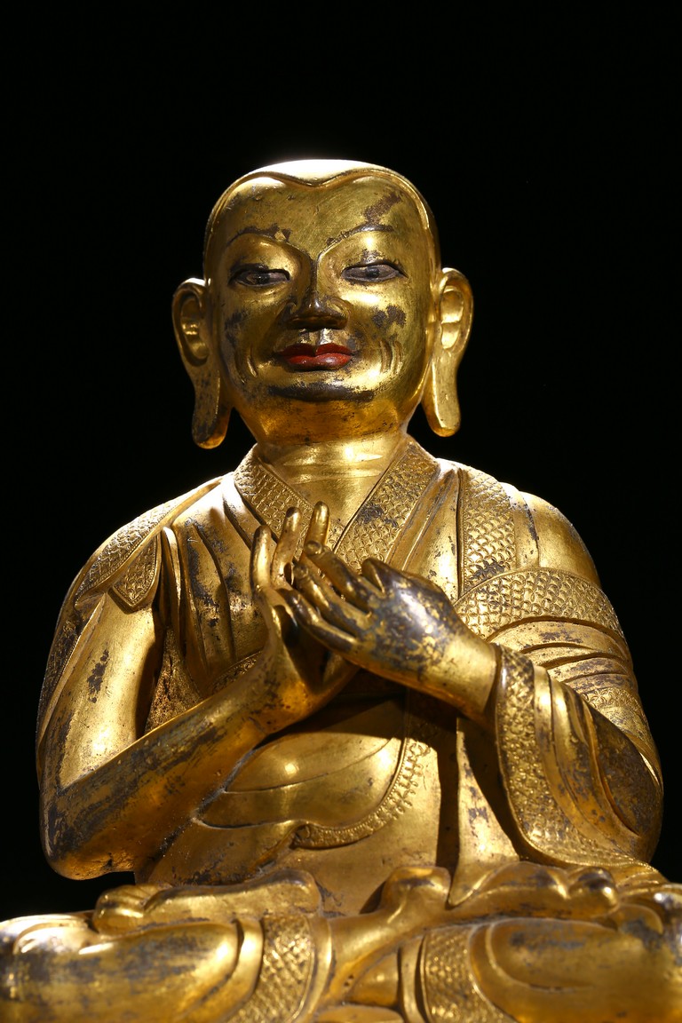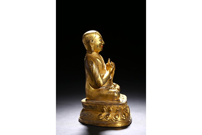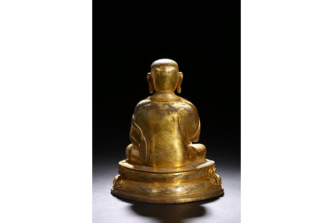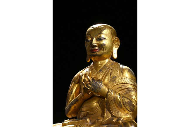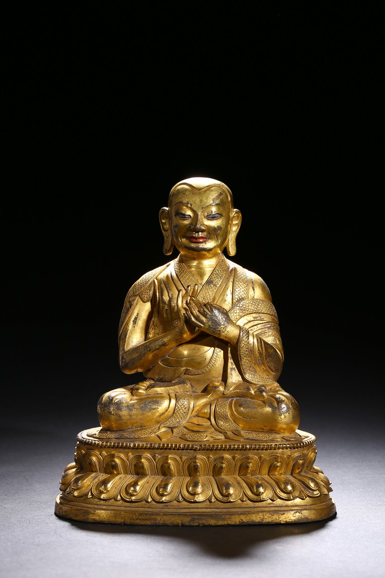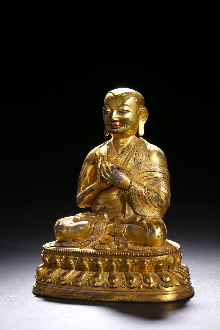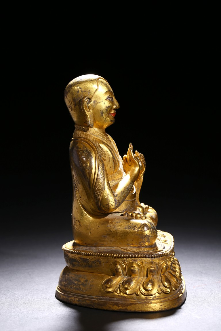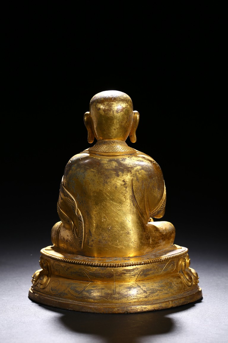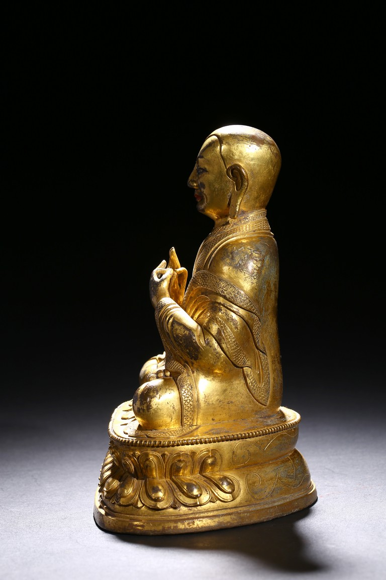 The Guru seated in vajra paryankasana on a double lotus throne, with receding hairline and cold-gilded face, the hands raised in dharmachakra mudra, wearing upper and lower robes incised with bands of rounded foliate motif. Qing Dynasty period.