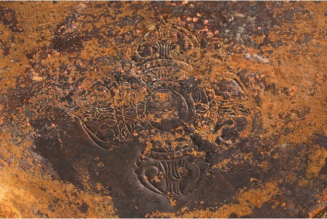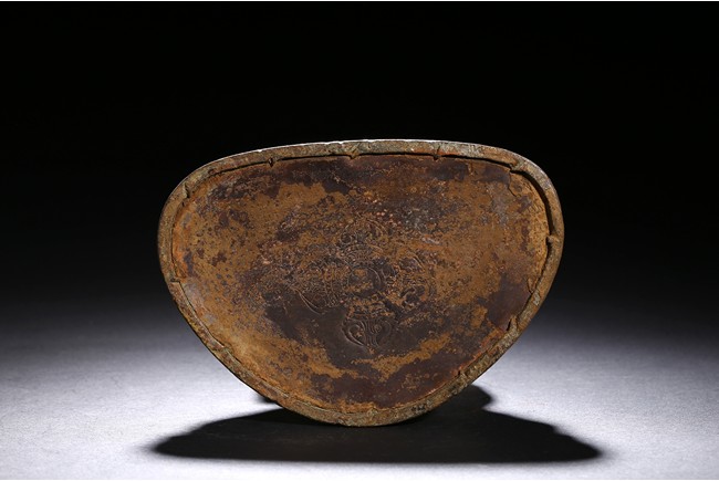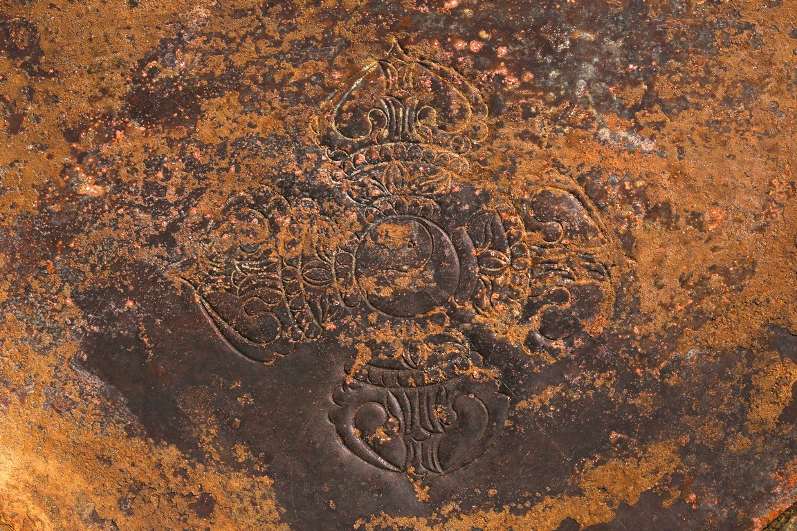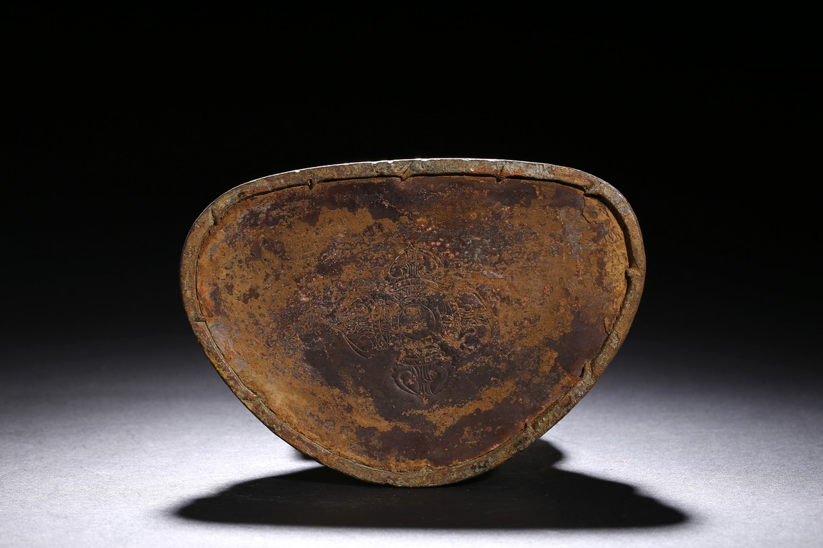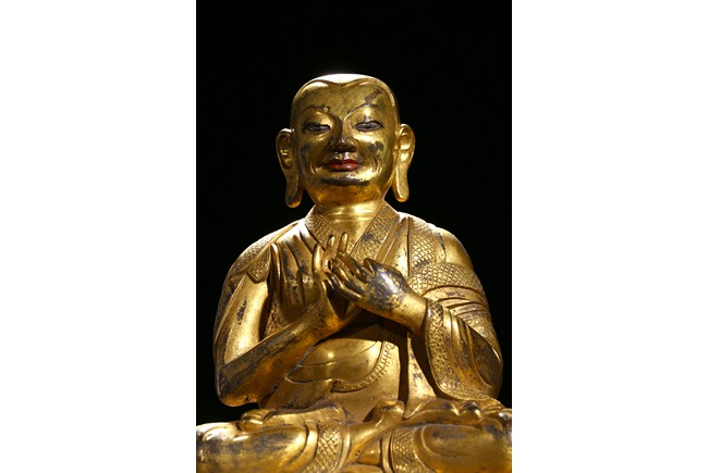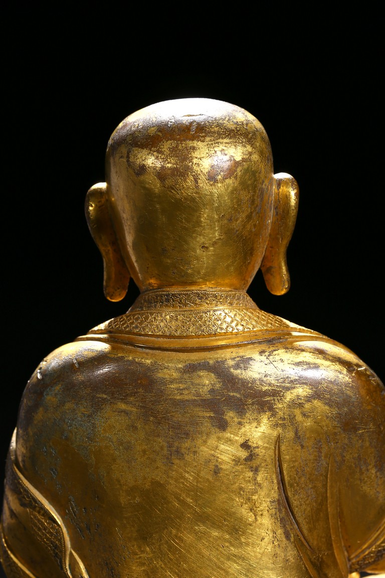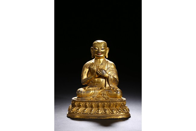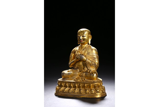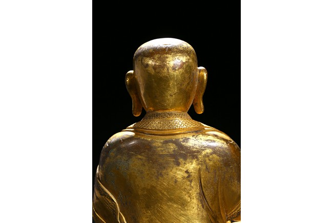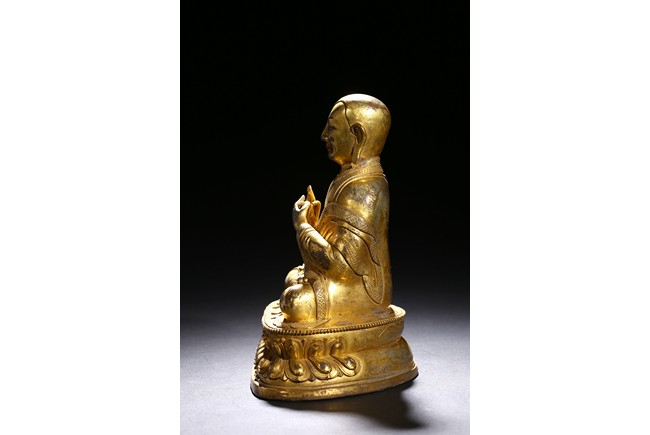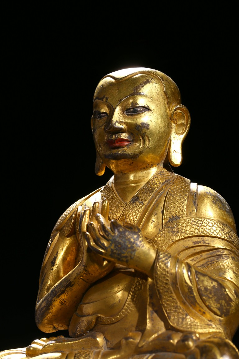 The Guru seated in vajra paryankasana on a double lotus throne, with receding hairline and cold-gilded face, the hands raised in dharmachakra mudra, wearing upper and lower robes incised with bands of rounded foliate motif. Qing Dynasty period.