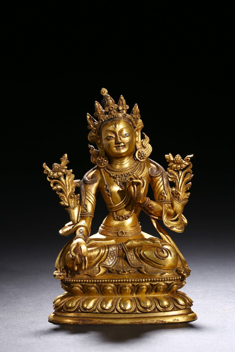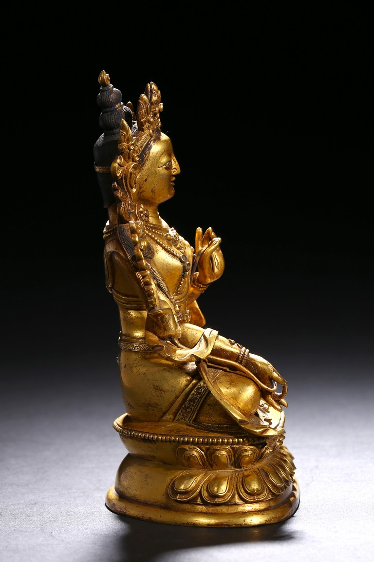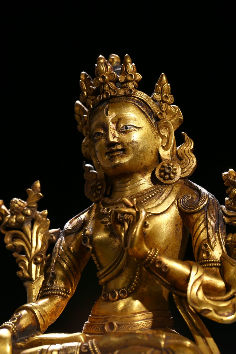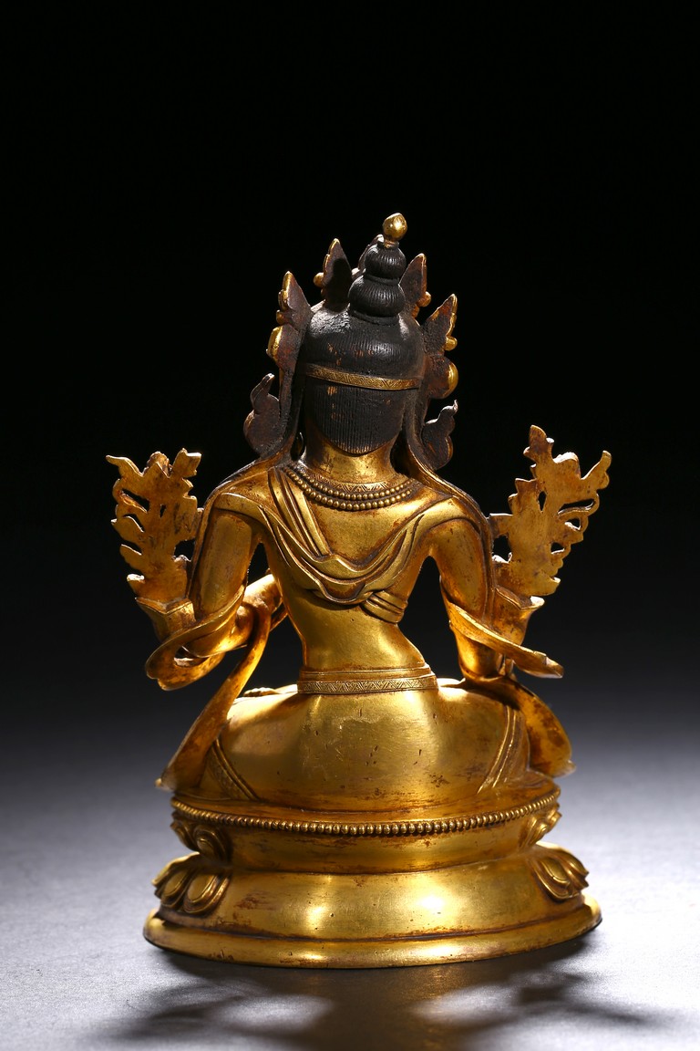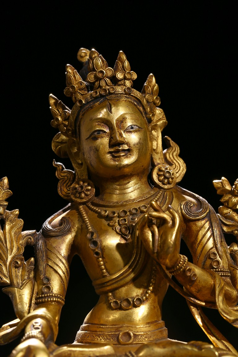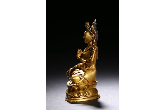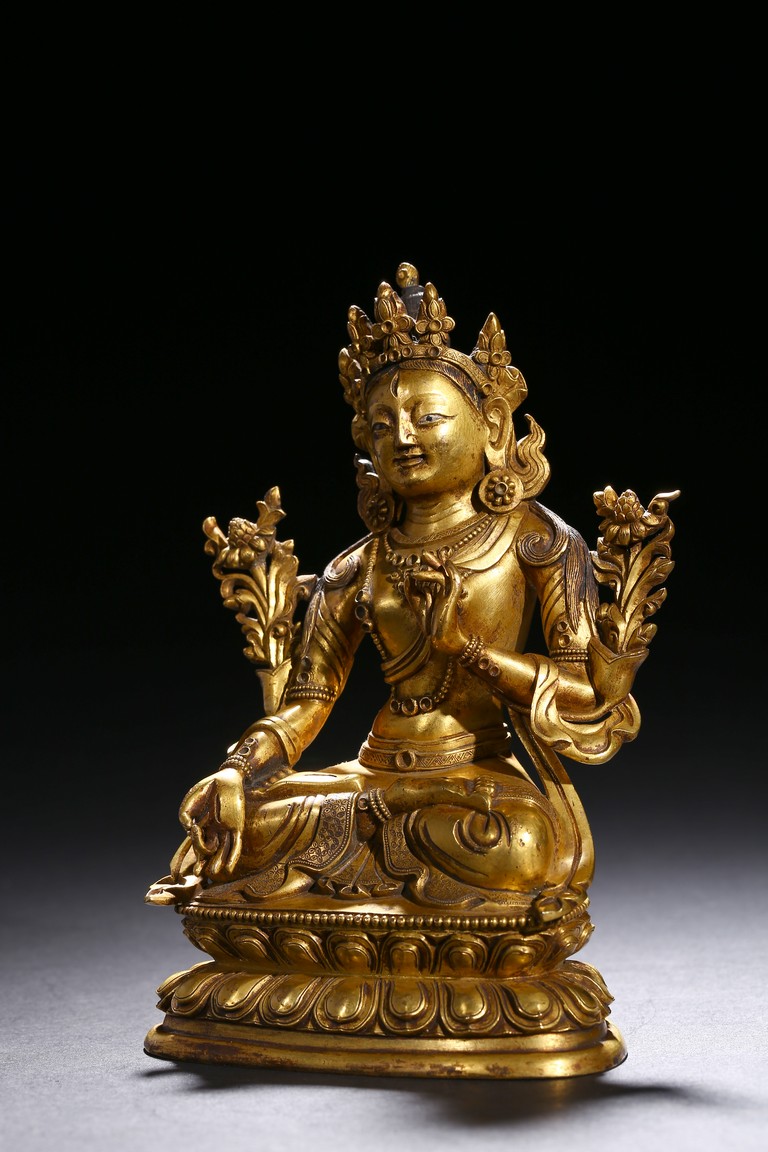 Cast seated in dhyanasana on a double lotus base, the right hand hold in varada mudra and the left hand raised to the chest in vitarkamudra, both supporting lotuses rising to the shoulders along the elbows, wearing a dhoti and a loose shawl over the shoulder, adorned with bejewelled necklace around the waist and the chest, the face with a benevolent expression, crowned with a leaf tiara in front of a high chignon. Qing Dynasty period.