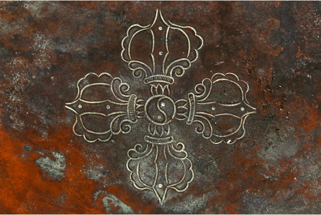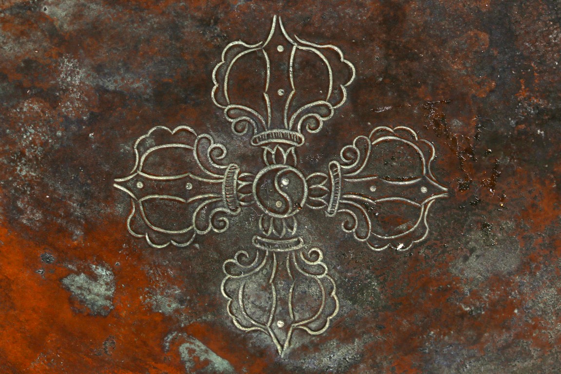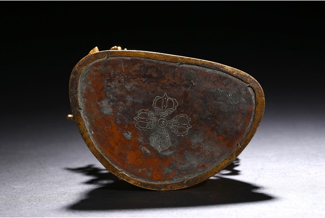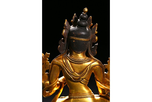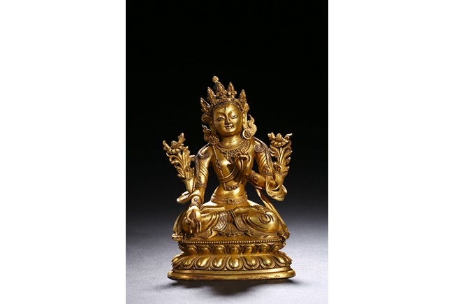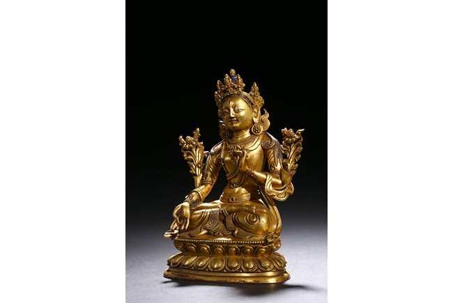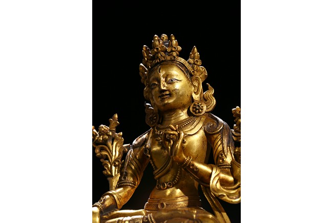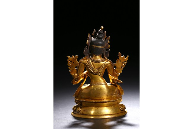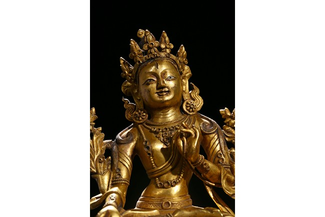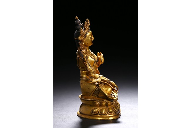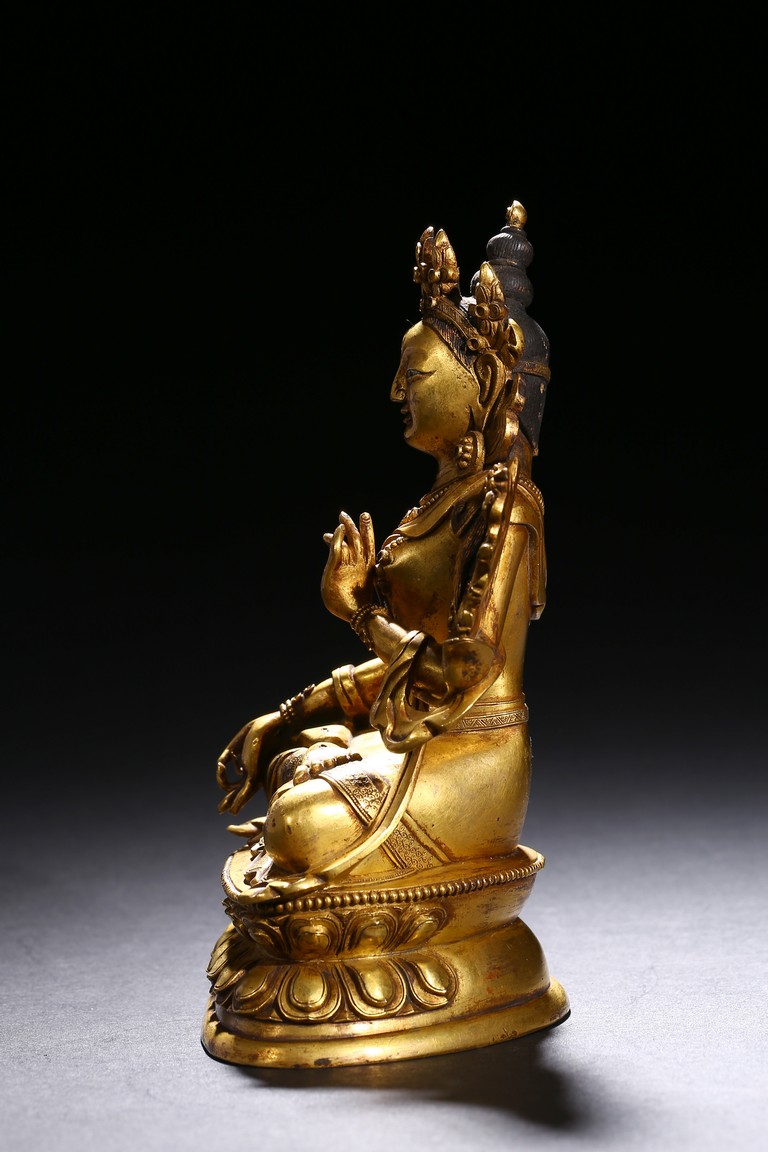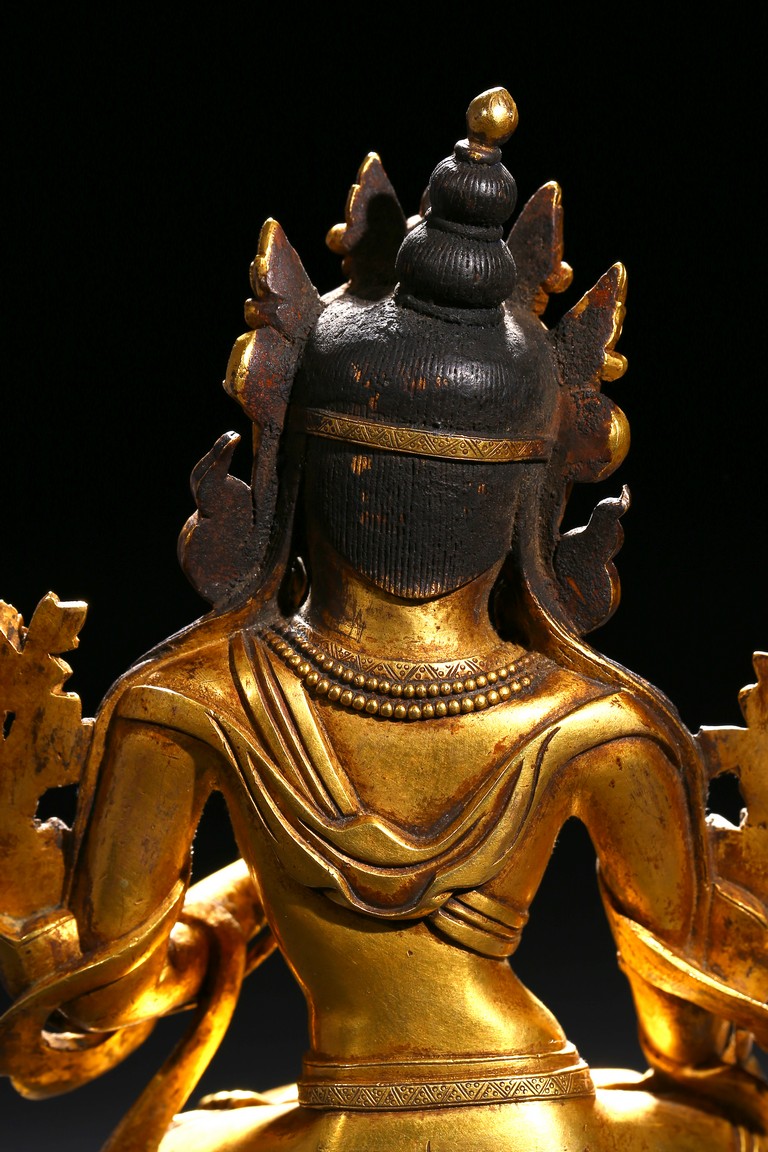 Cast seated in dhyanasana on a double lotus base, the right hand hold in varada mudra and the left hand raised to the chest in vitarkamudra, both supporting lotuses rising to the shoulders along the elbows, wearing a dhoti and a loose shawl over the shoulder, adorned with bejewelled necklace around the waist and the chest, the face with a benevolent expression, crowned with a leaf tiara in front of a high chignon. Qing Dynasty period.