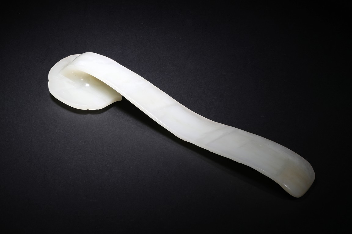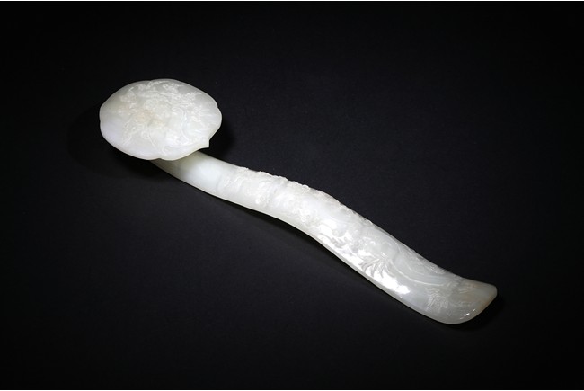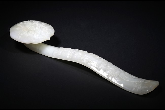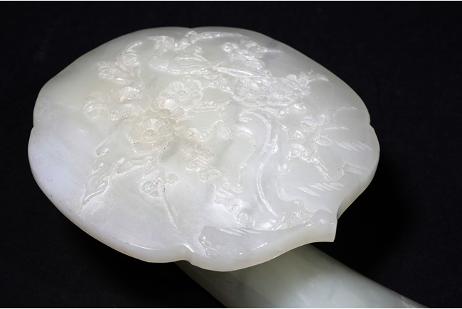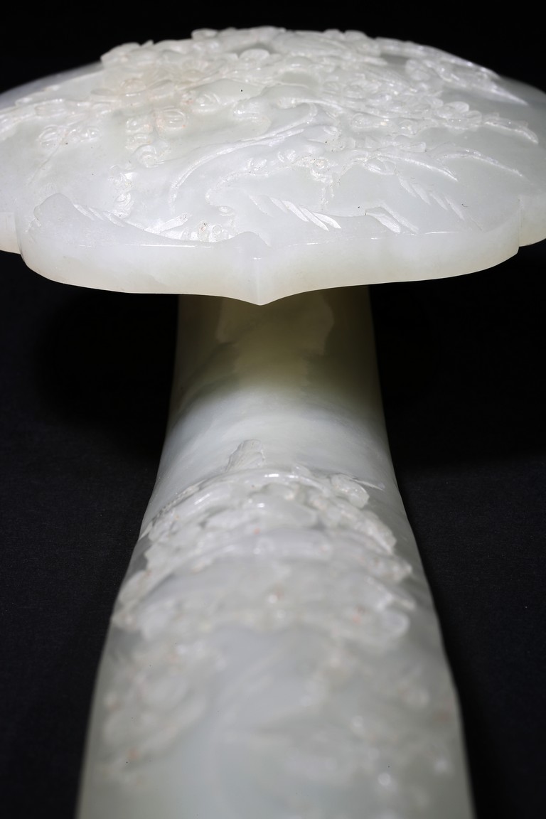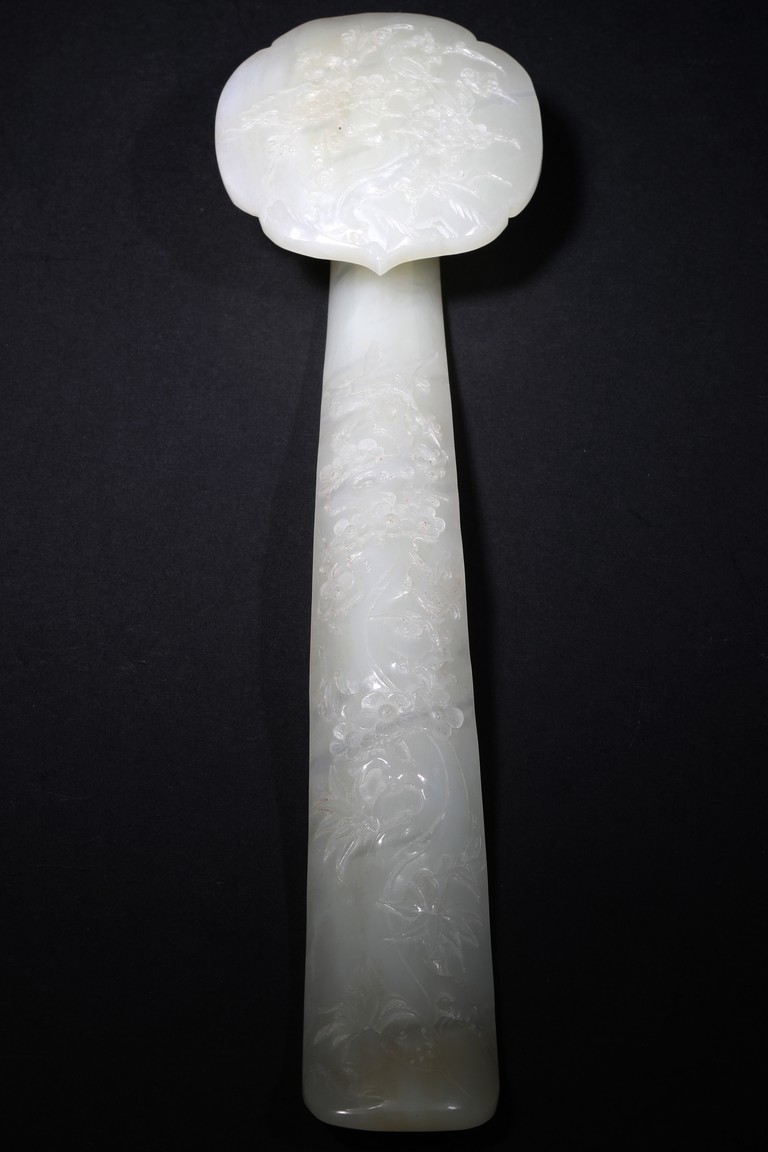 The head finely carved in low relief with two birds perching on blossoming plum flowers enclosed in ruyi-shaped border, along the shaft carved with flowers issuing from the grove, the translucent stone of an even pale white tone with slight greyish and russet inclusion.
