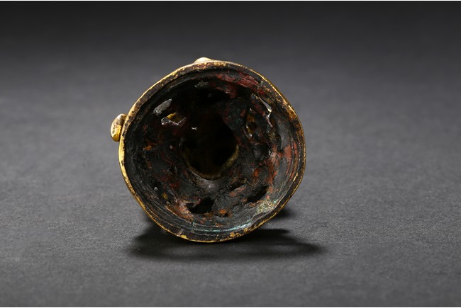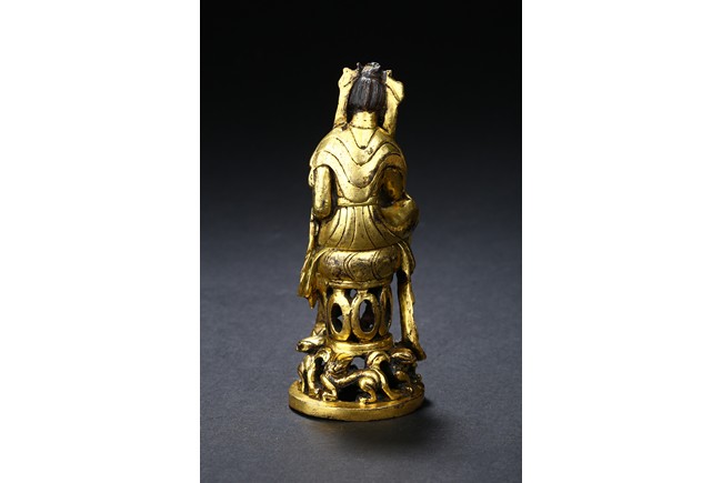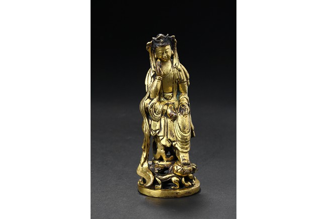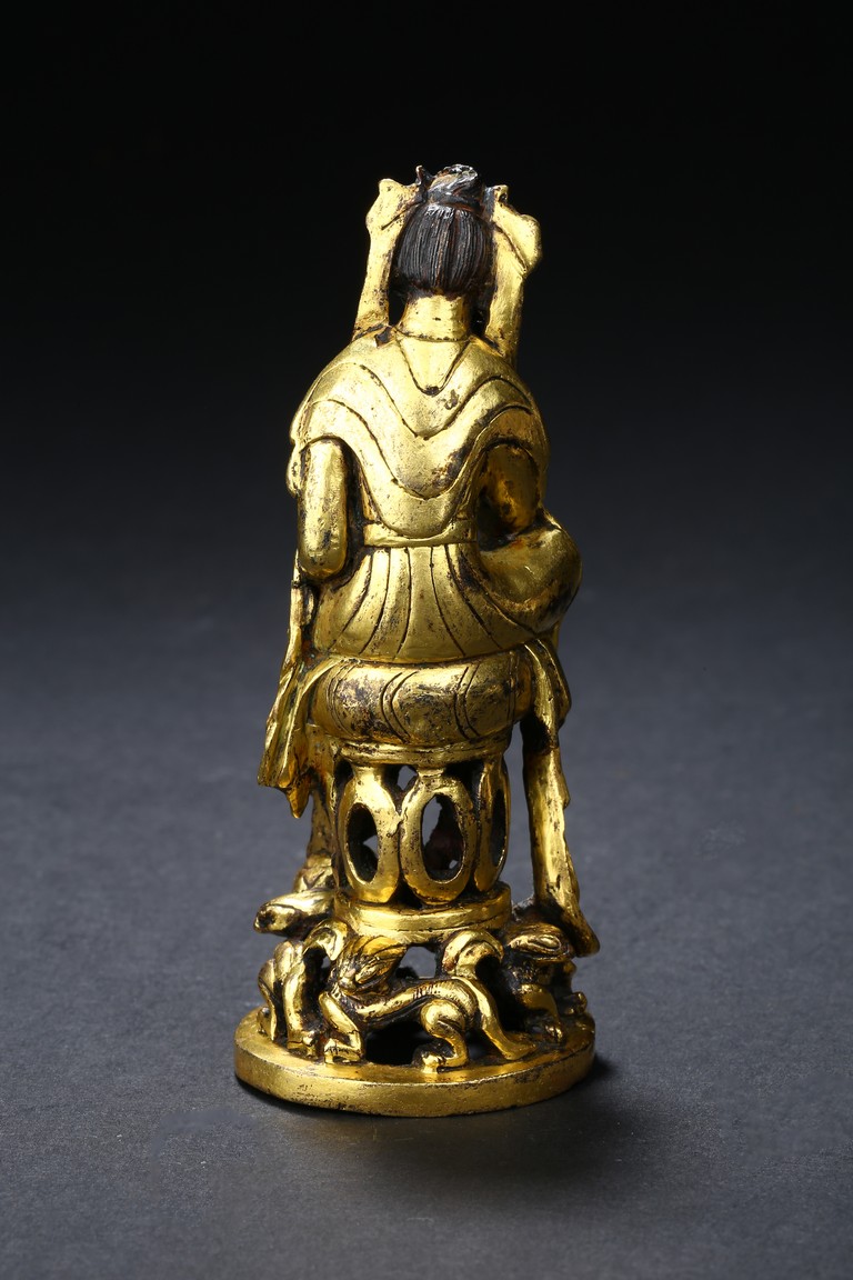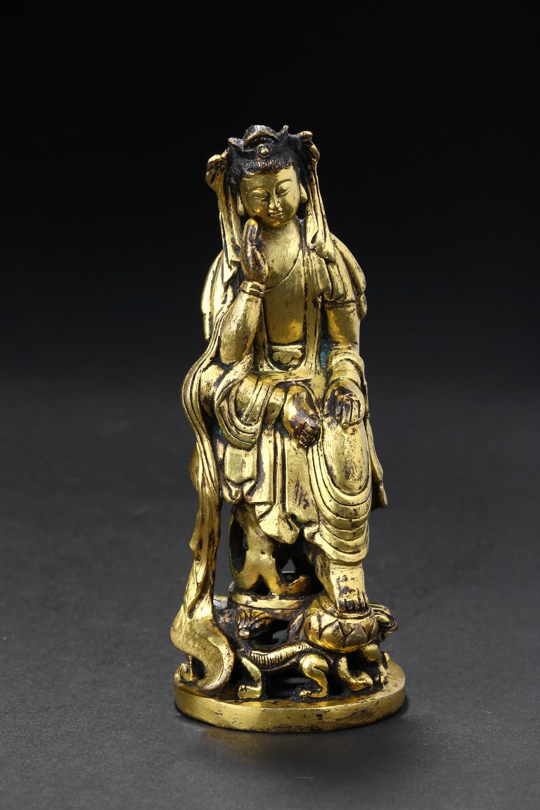 The deity cast raising one hand to his chin and with pensive expression, seated on a cushioned barrel-form seat, one leg resting on a lotus bud. Qing Dynasty period.