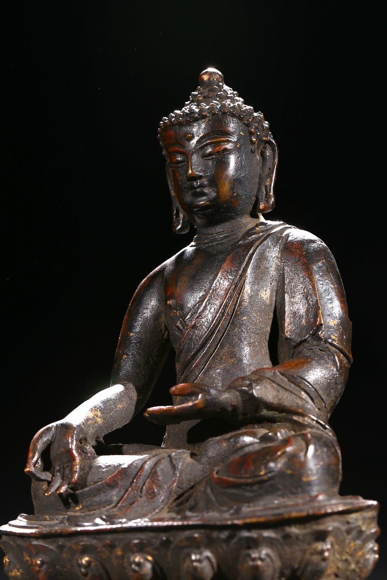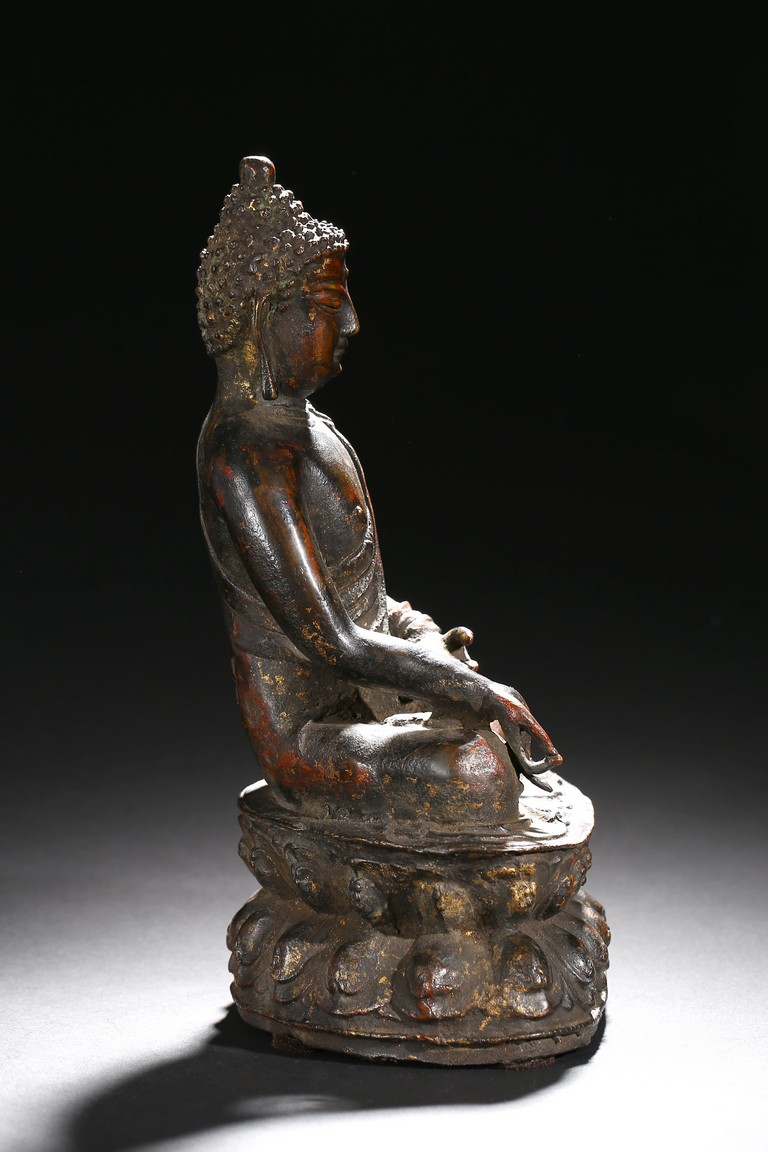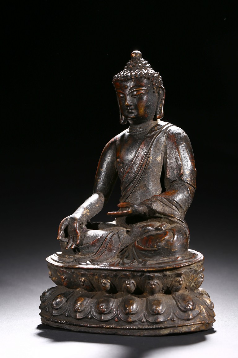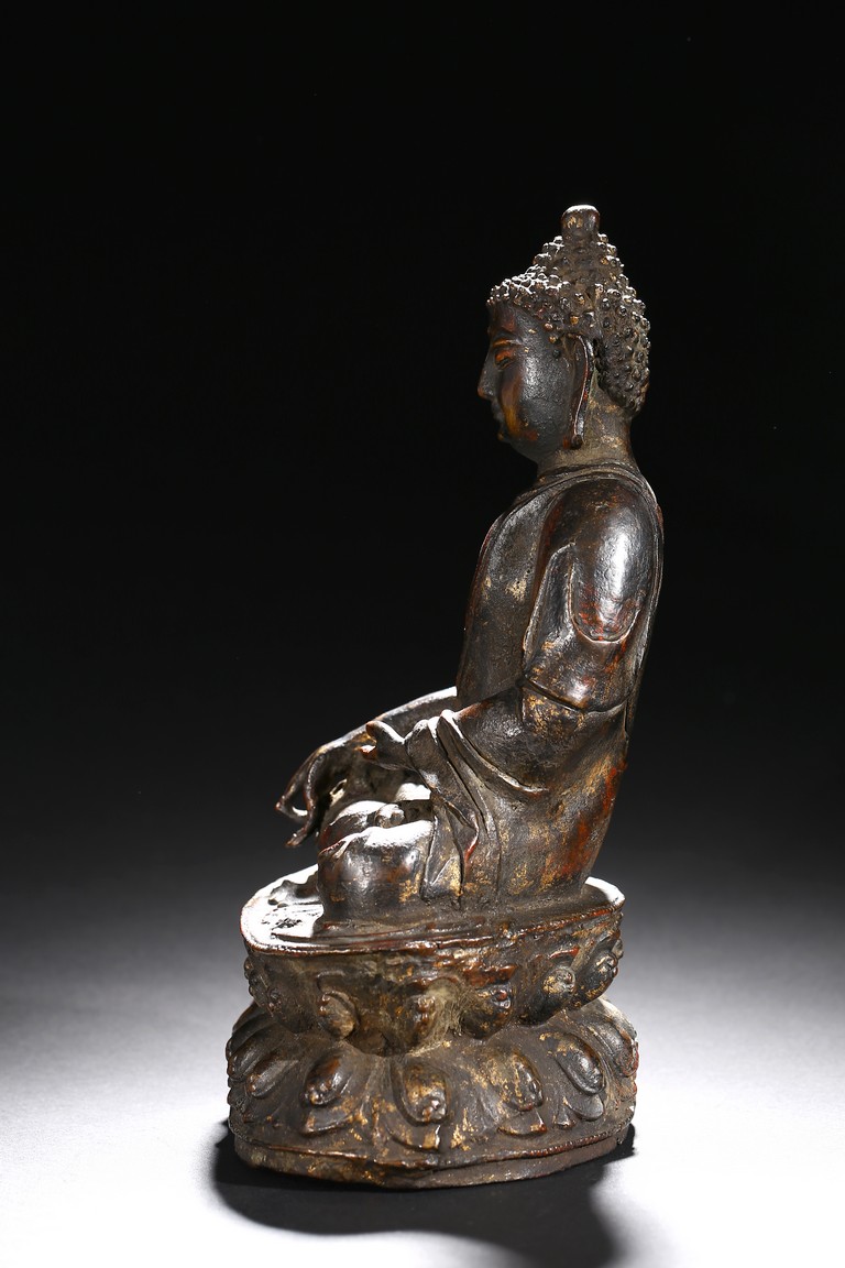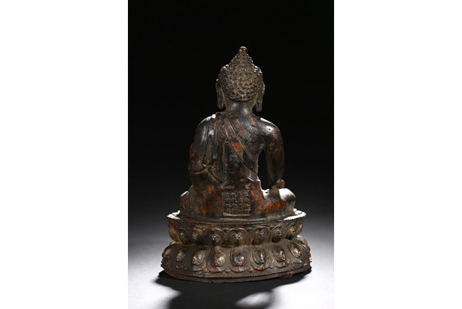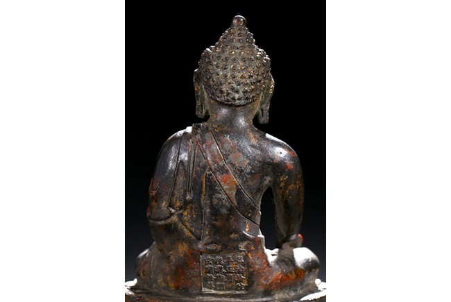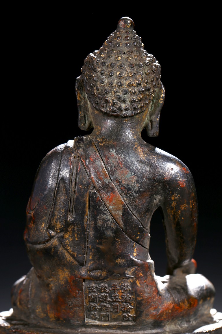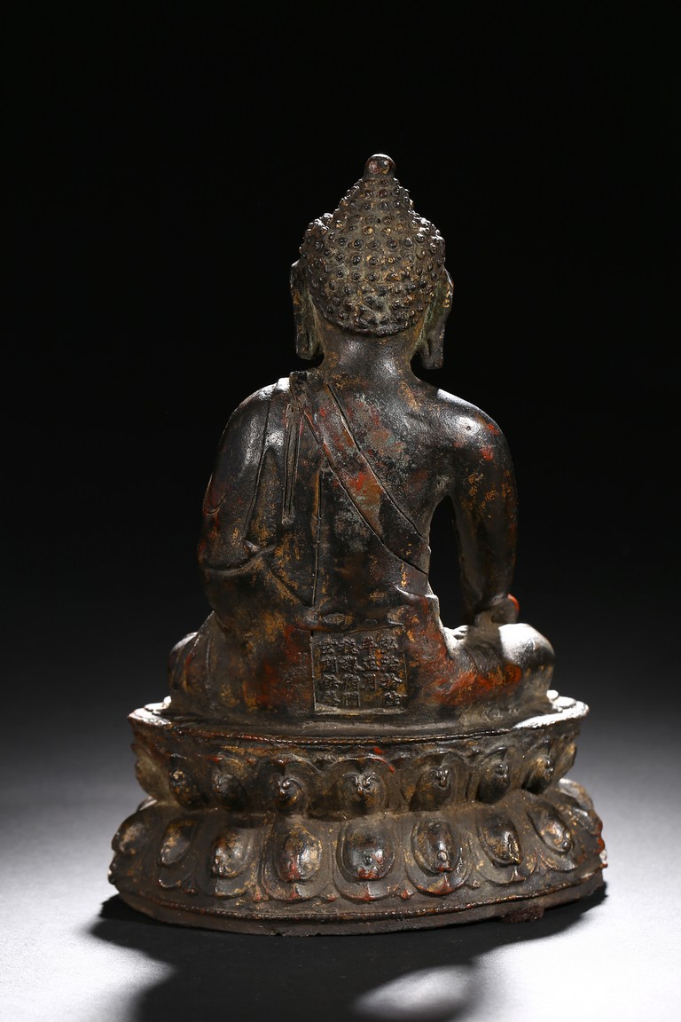 Shown seated upon a double lotus throne, wearing flowing robes, face with meditative expression, back with inscriptions. Ming Dynasty period or later.
