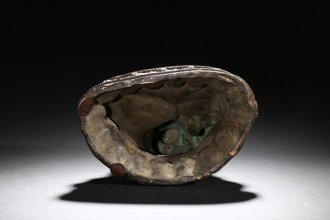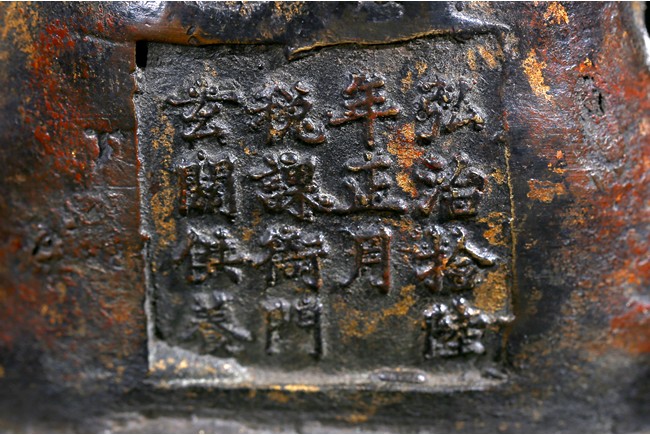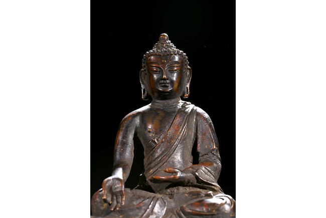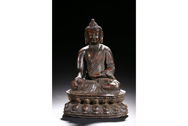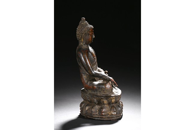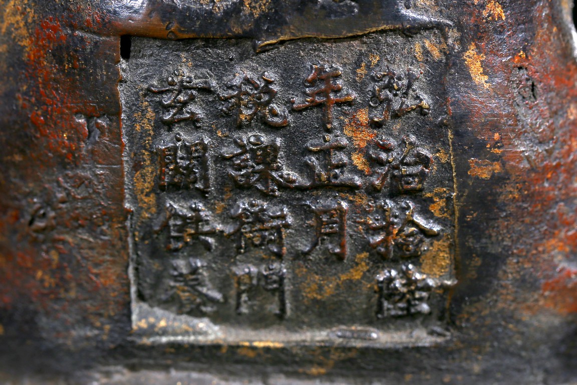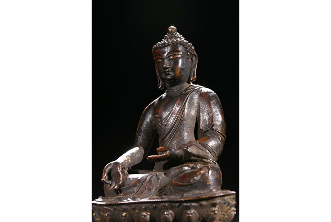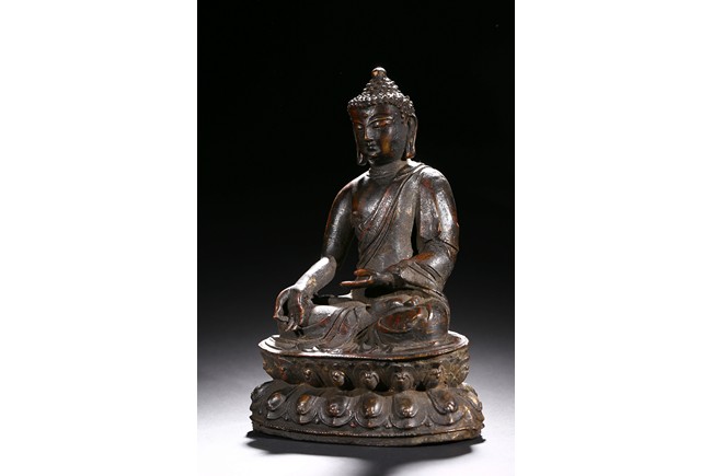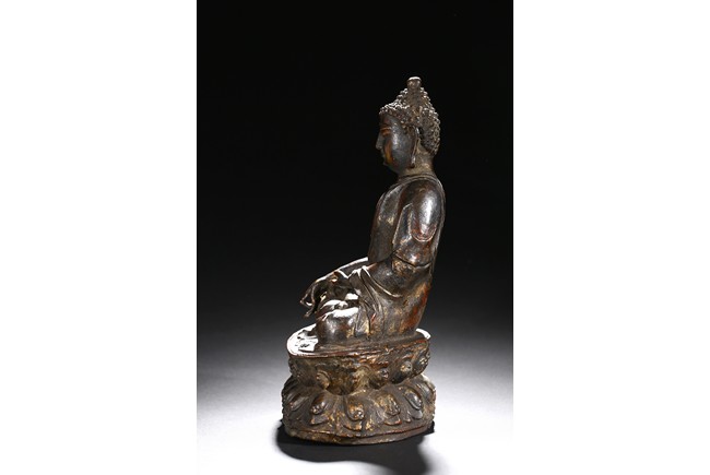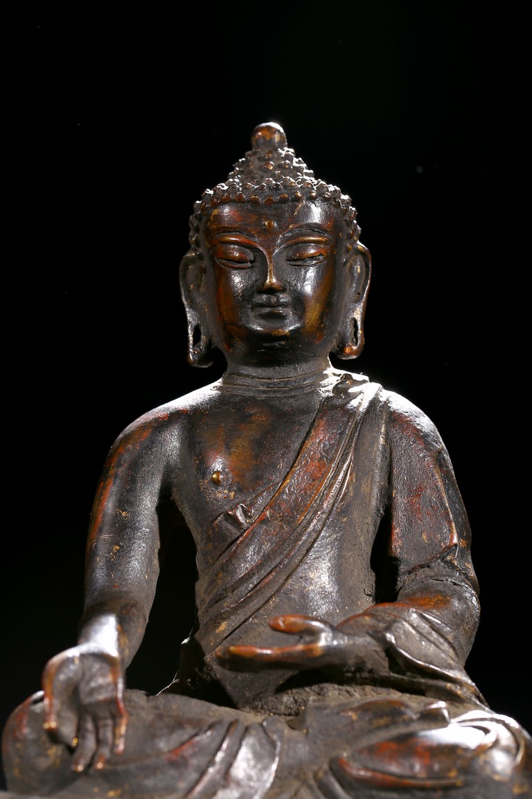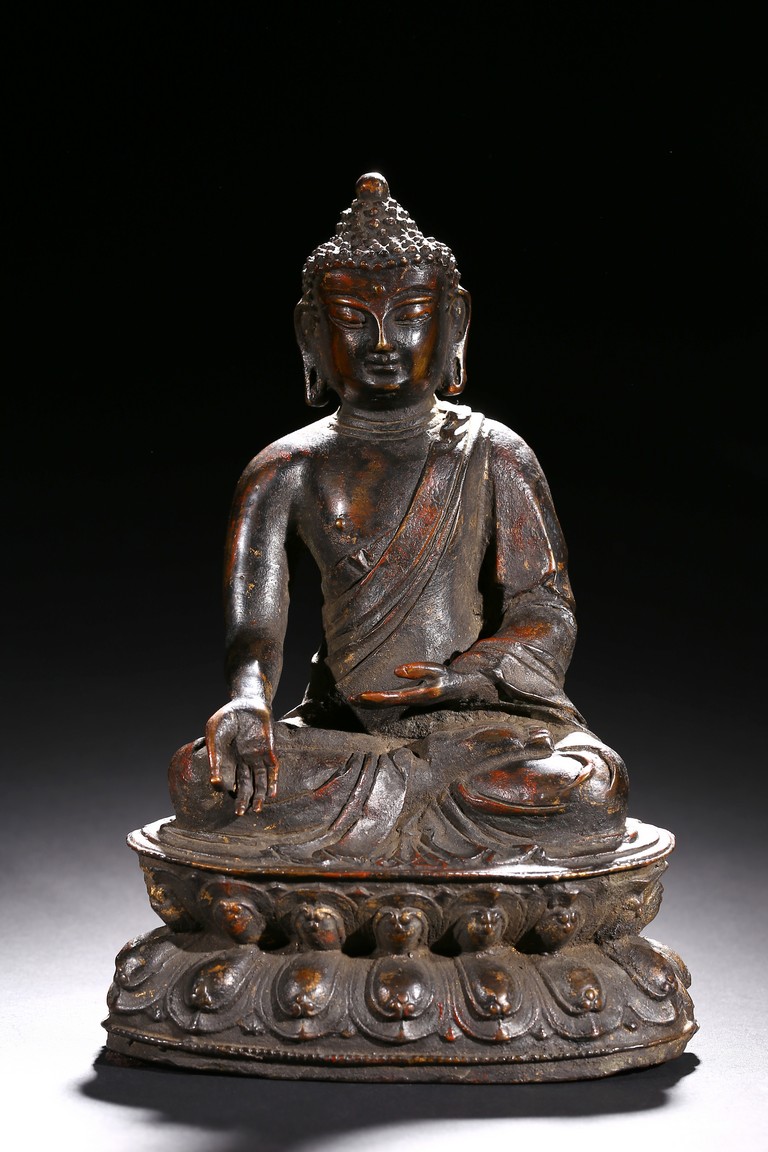 Shown seated upon a double lotus throne, wearing flowing robes, face with meditative expression, back with inscriptions. Ming Dynasty period or later.