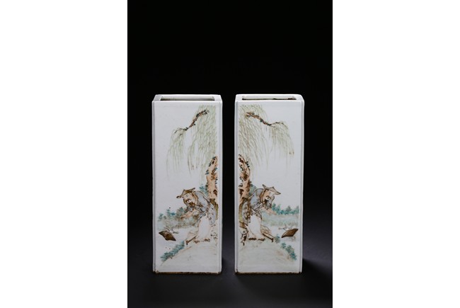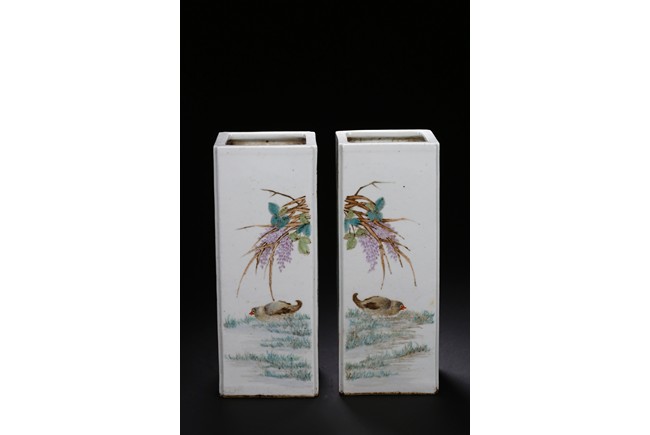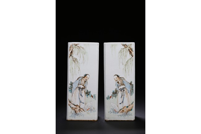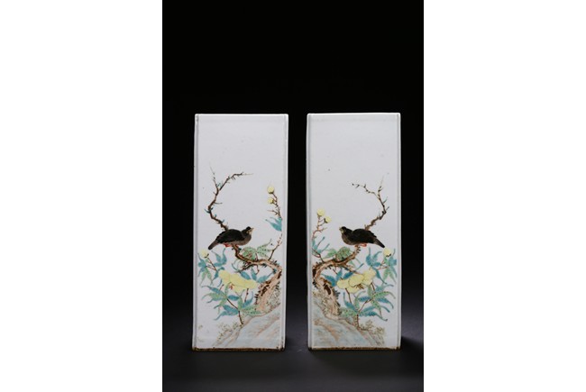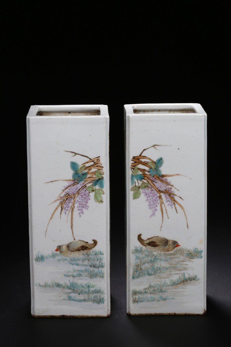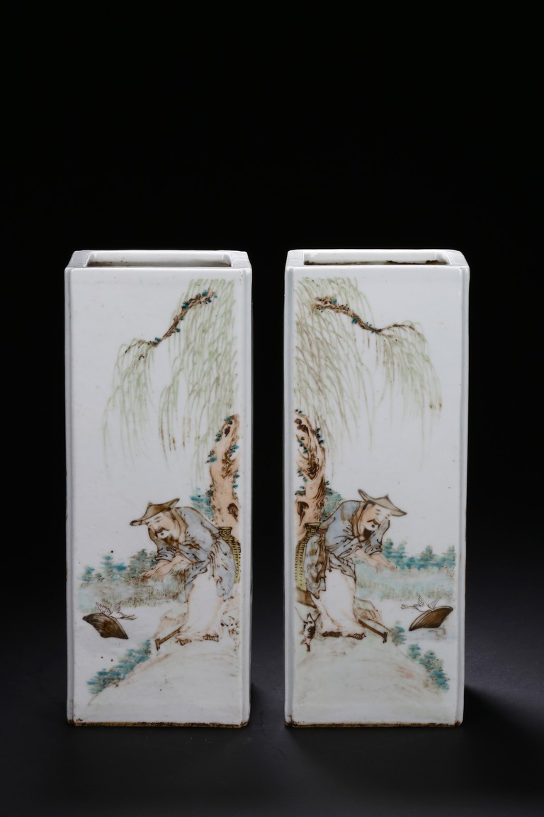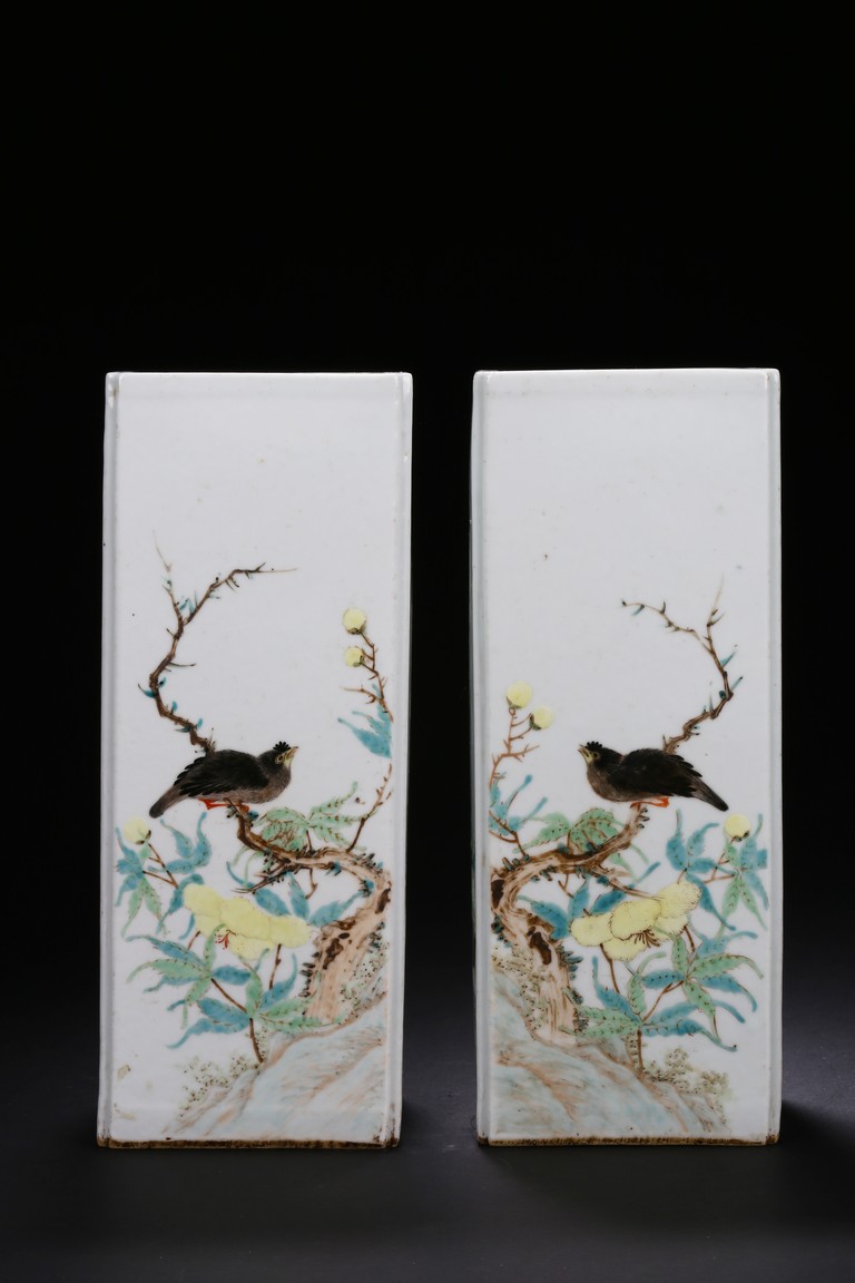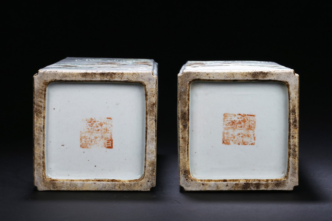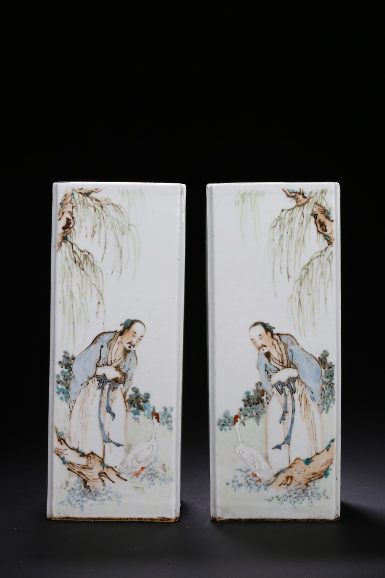Each of elongated square form, the front side finely enamelled with an elder wearing loose robe under tall willow tree staring at a standing white goose, the reverse with similar setting depicted a farmer bending his waist to feed a white pigeon, the other two sides enamelled with a lack bird perching on gnarled tree branch or a brownish fledgling ramble on the grassy land, the base with a six character mark.