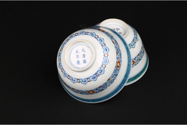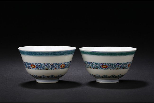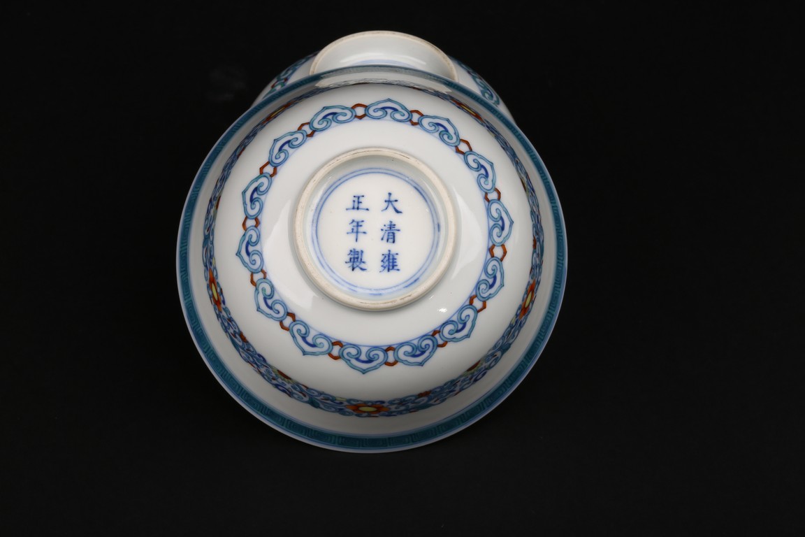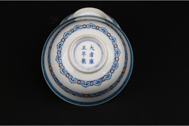 Well potted, the wine cup rising from a short foot ring to a slightly everted rim, the body decorated with a band of floral scrolling underneath a key-fret border around the mouth rim and above ruyi-head band. The base with six character 'YONGZHENG' mark. Qing Dynasty period.
