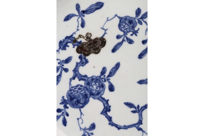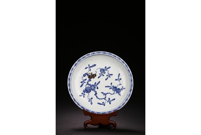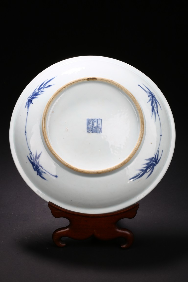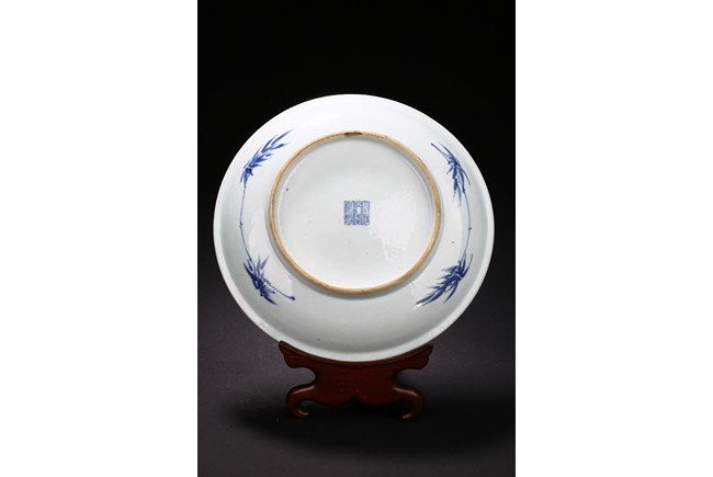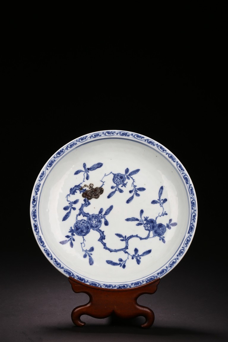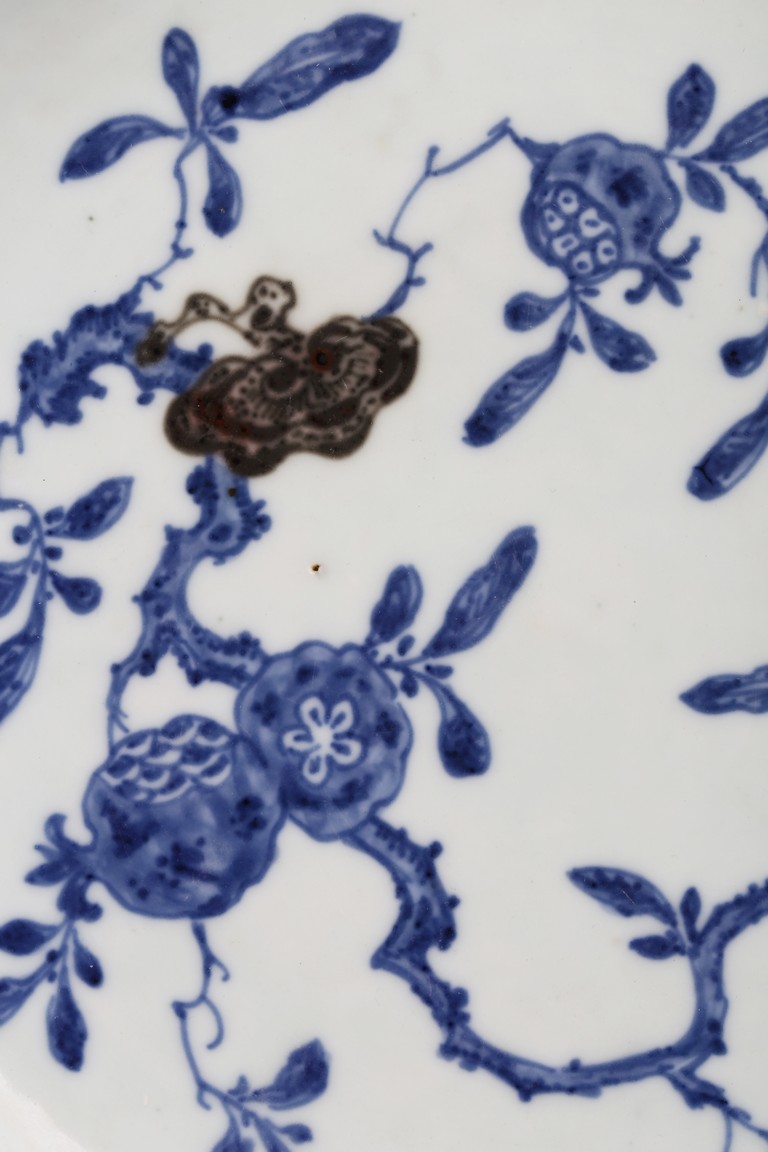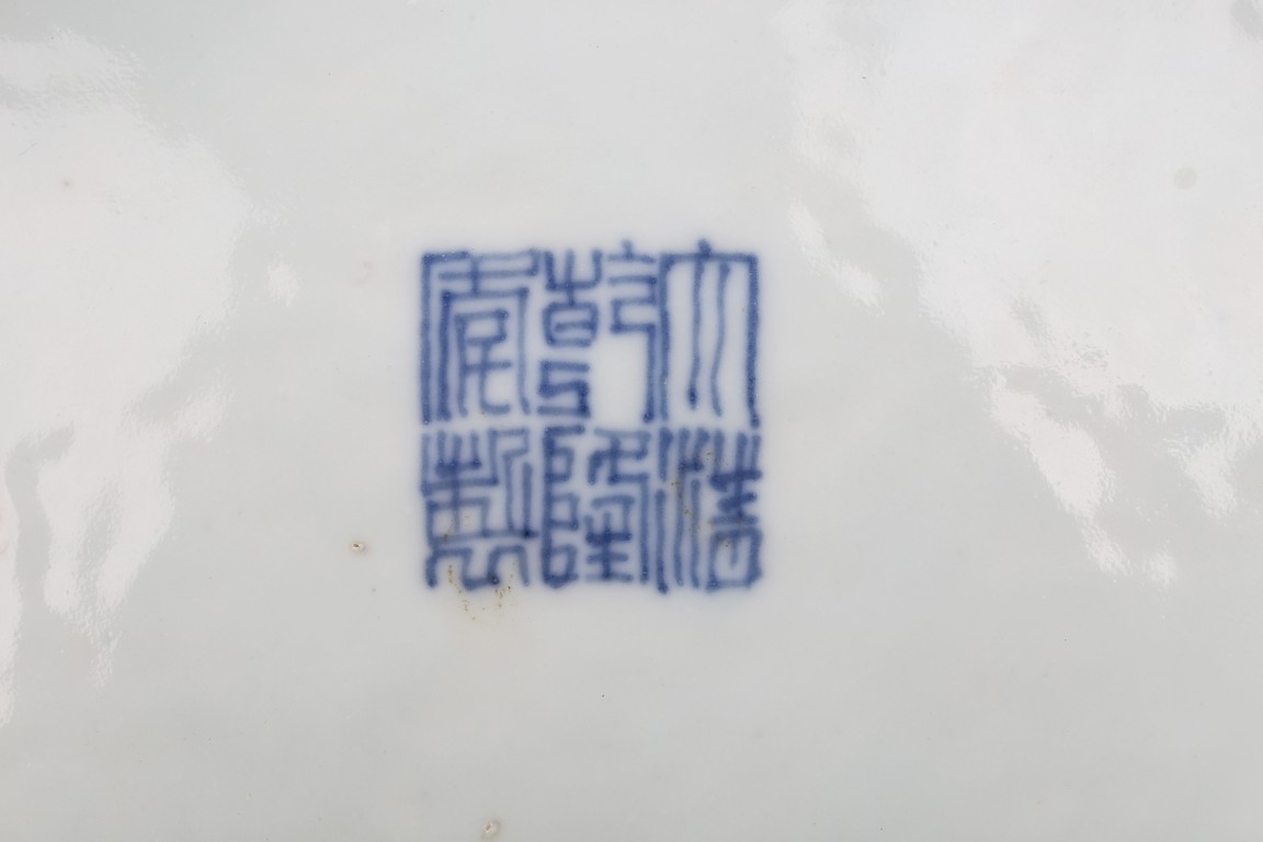 The dish finely decorated with a pomegranate leafy branch and a lingzhi in the interior, the rim with a band of scrolled pattern, the base with six character 'QIANLONG' mark. Qing Dynasty period.