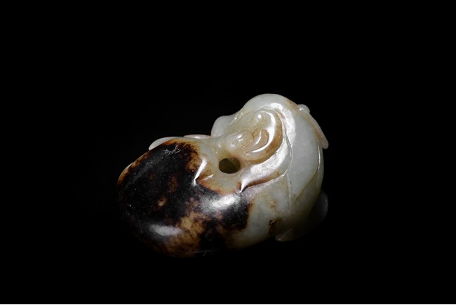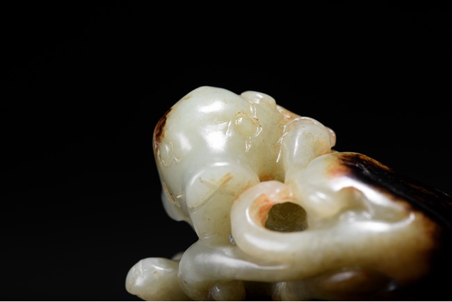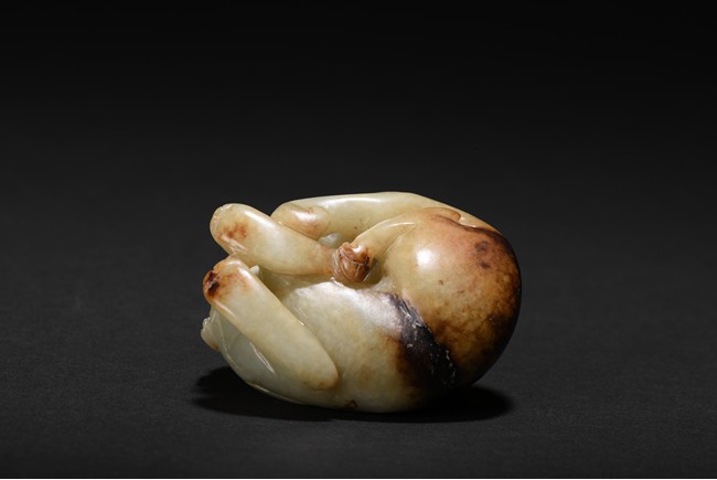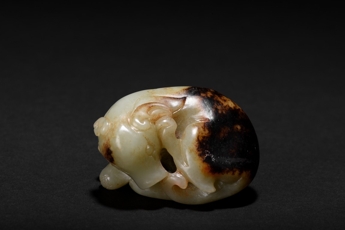 The stone is finely carved in the form of a recumbent dog, its head turned back to lick his tail, its eyes rendered in two indented circles, the stone is greenish-white tone with extensive black and russet inclusions on the back. Qing Dynasty period.