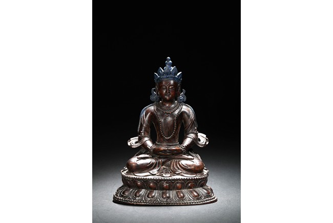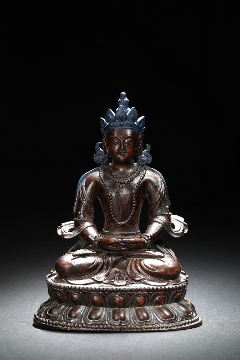 Seated in dhyanasana upon double lotus throne, with hands folded in dhyana sutra, the bodhisattva is shown wearing a shawl and dhoti, richly adorned with elaborate necklace, the face with meditative expression, with celestial ribbon around both arms, flanked by elongated earlobes, the hair pulled up in a topknot behind pointed crown. Qing Dynasty period.