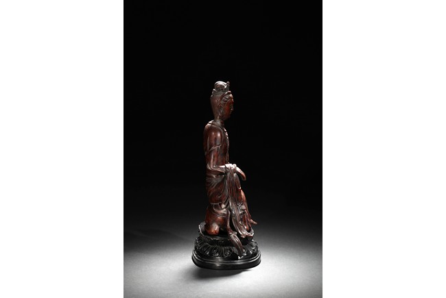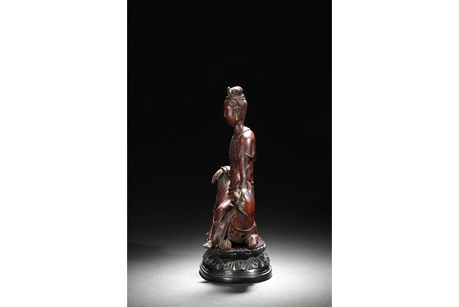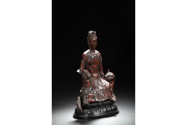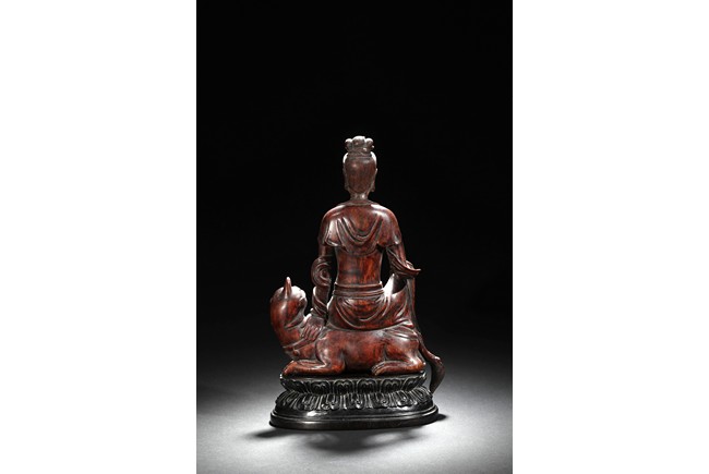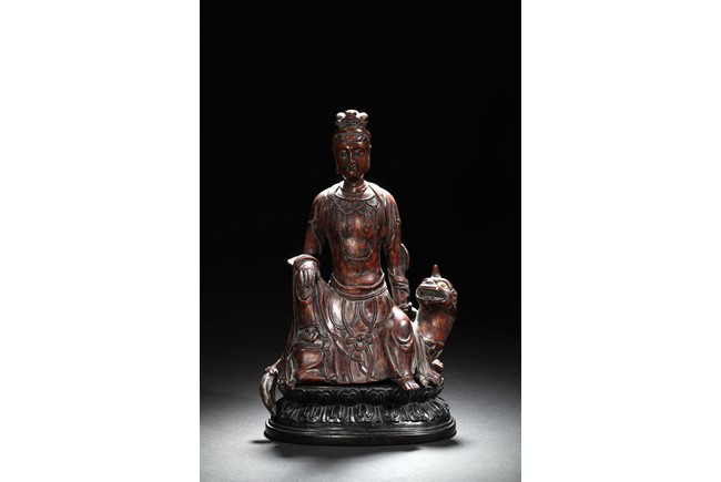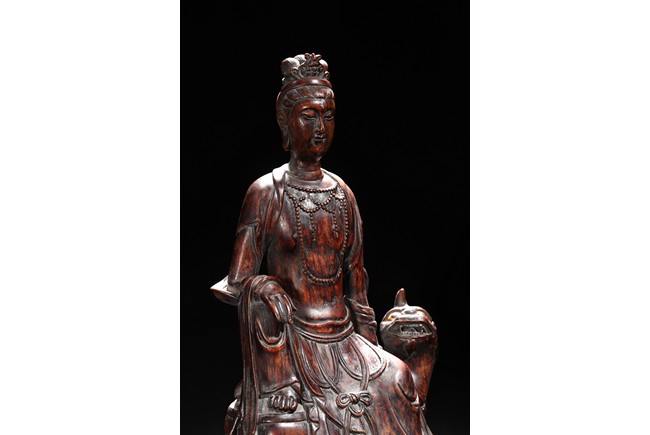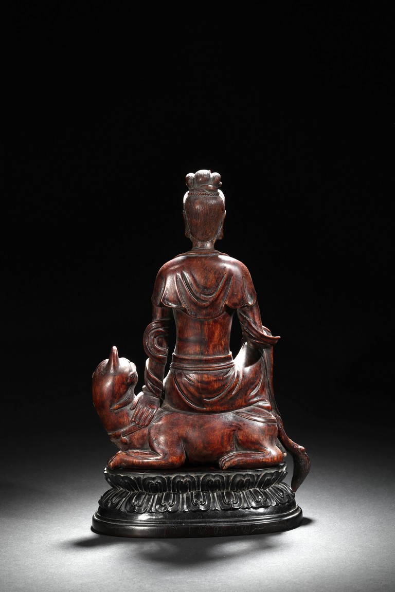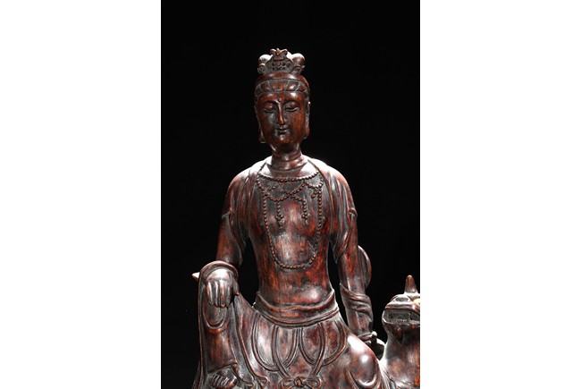 The bodhisattva is shown seated upon a lion, his right hand rested on raised right knee, adorned with beaded necklace, face with serene expression, hair pulled into a chignon. Qing Dynasty period.