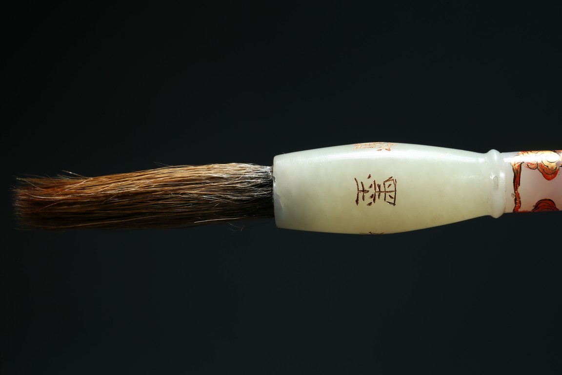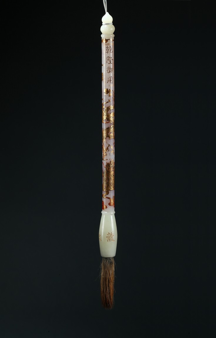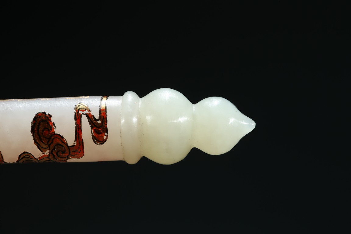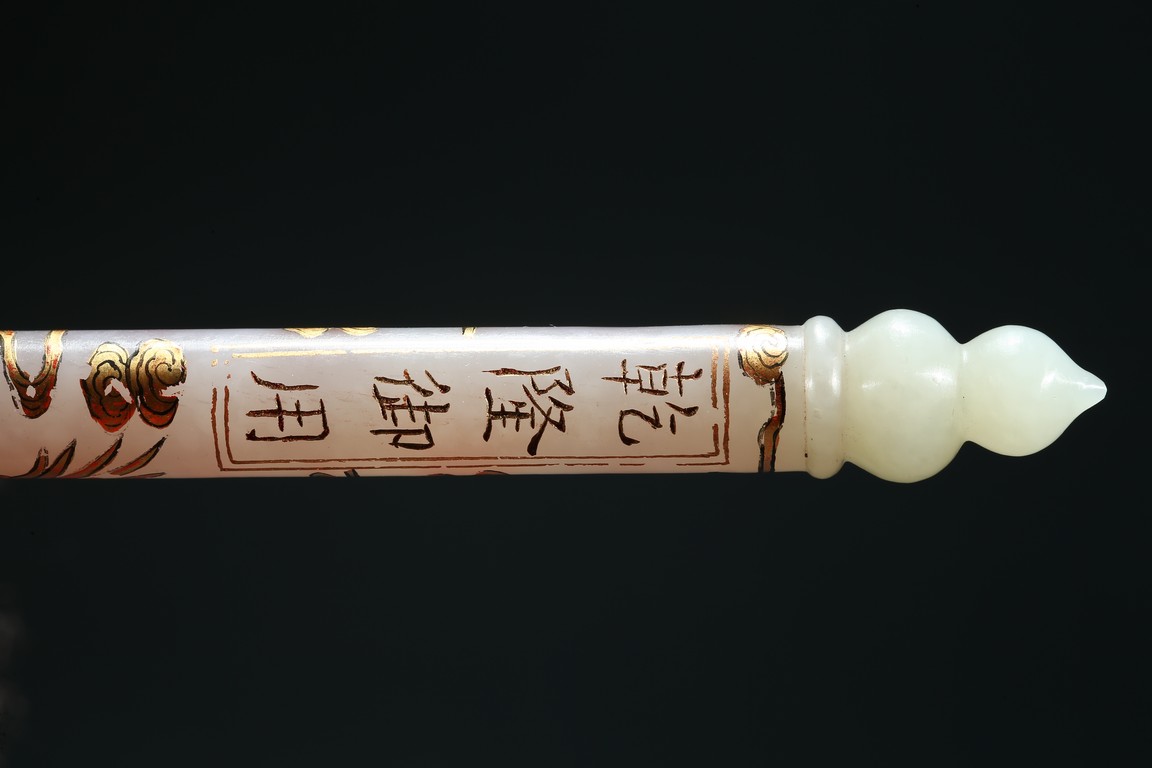 Of cylindrical form, well painted in gilt on white jade with a dragon writhing amongst cloud swirls, close to the end with a inscription of 'Qian Long Yu Yong'. The stone is of well-polished translucent white tone.