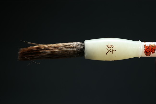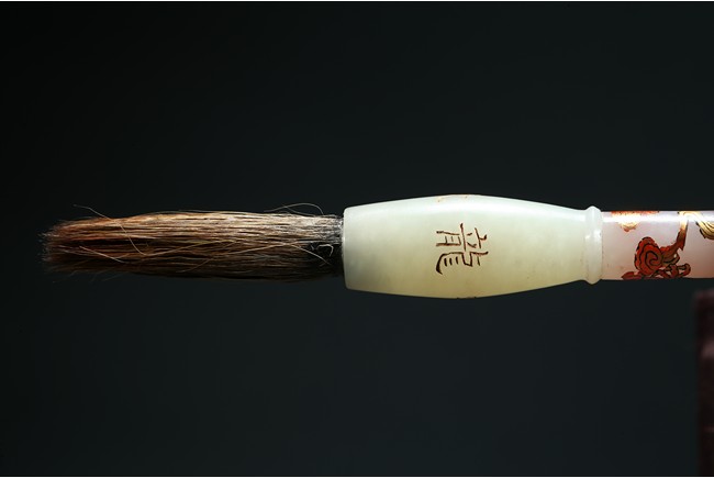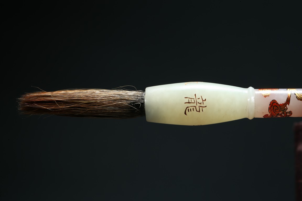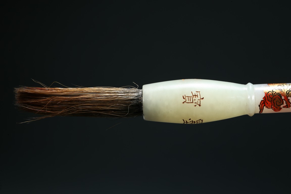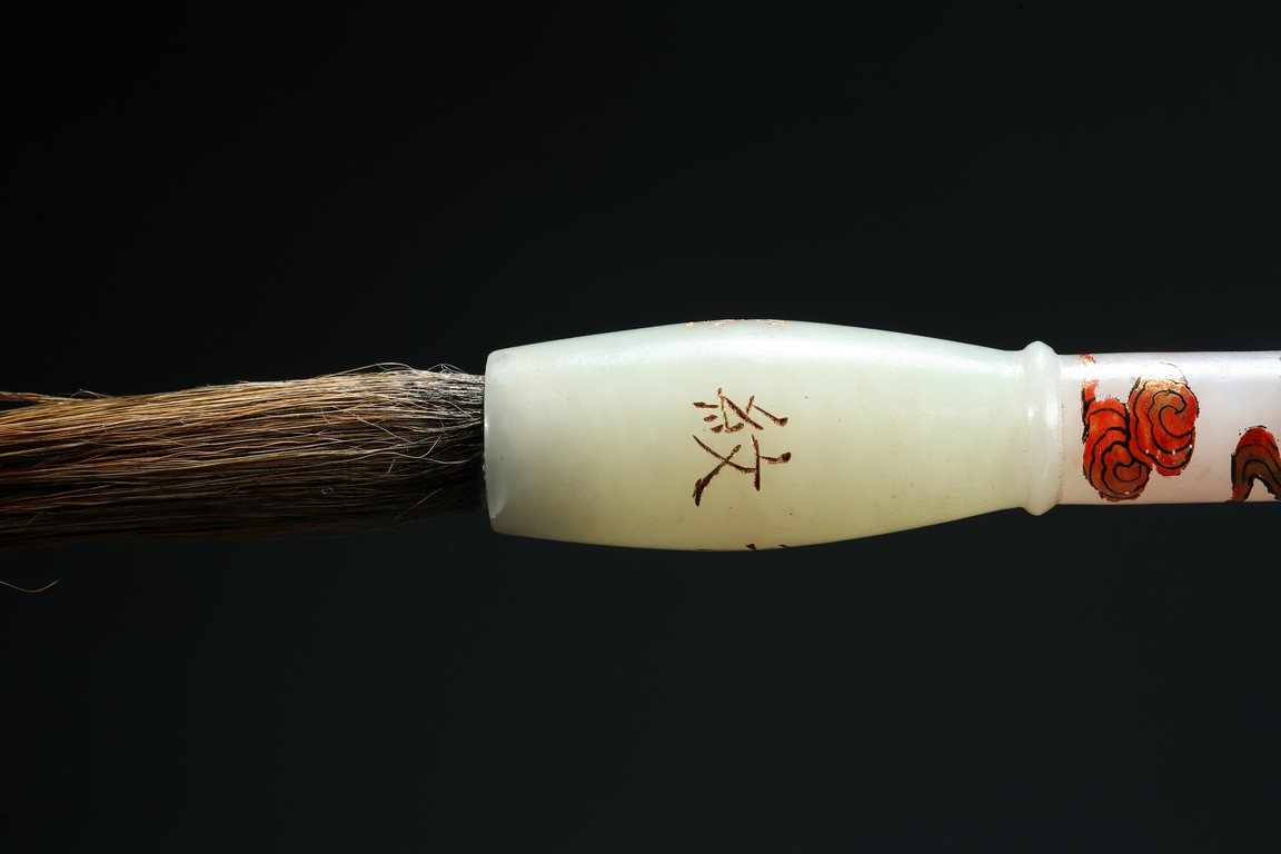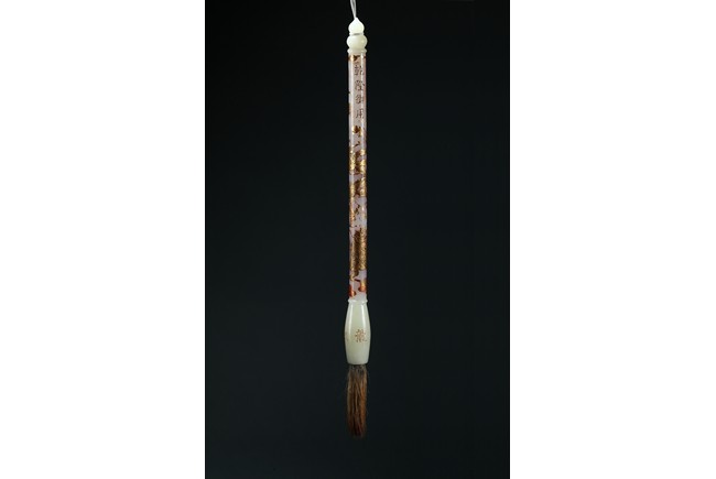 Of cylindrical form, well painted in gilt on white jade with a dragon writhing amongst cloud swirls, close to the end with a inscription of 'Qian Long Yu Yong'. The stone is of well-polished translucent white tone.