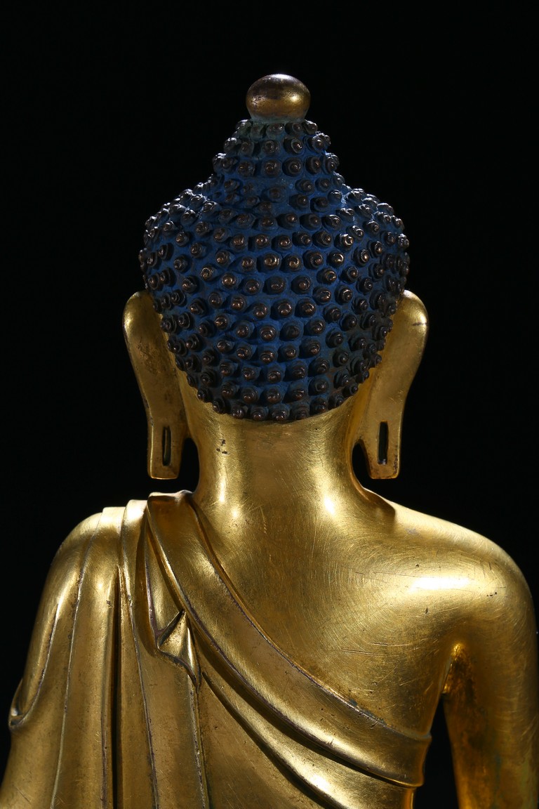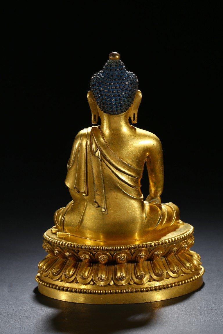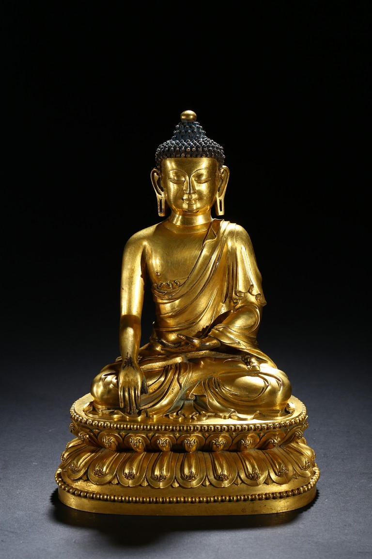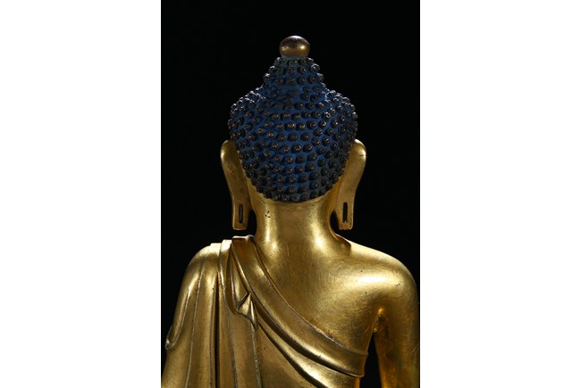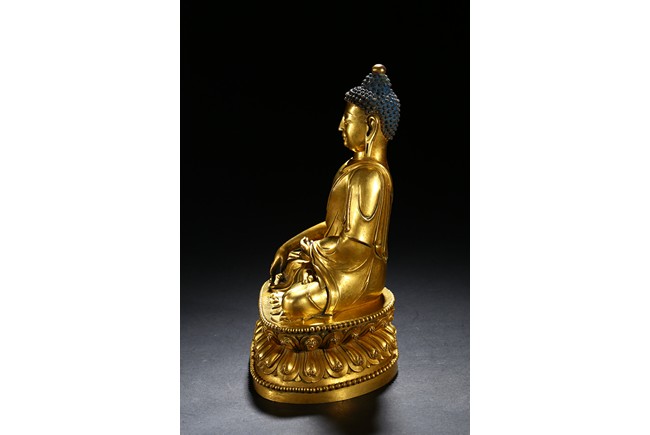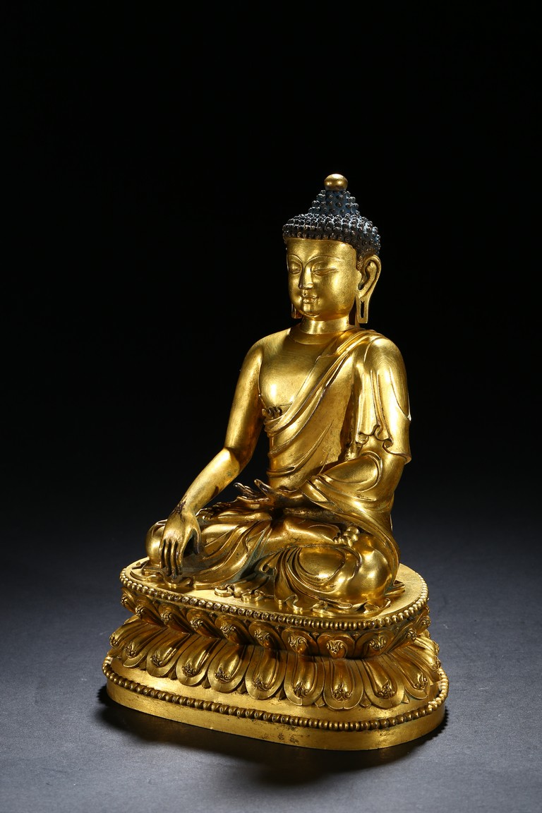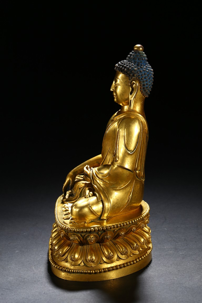 Seated in dhyanasana with his right hand in bhumisparsamudra, wearing finely delineated robes over a well-modelled torso leaving the chest and one arm bare, the serene face framed by long pendulous earlobes and the tightly curled hair rising to a prominent ushnisha with blue pigment, all supported on a double lotus base with beaded borders, the front incised with six character 'YONGLE' Mark. Ming Dynasty period.