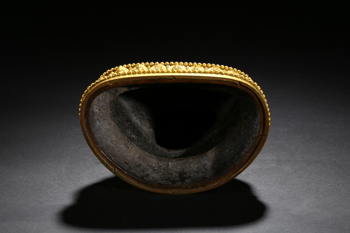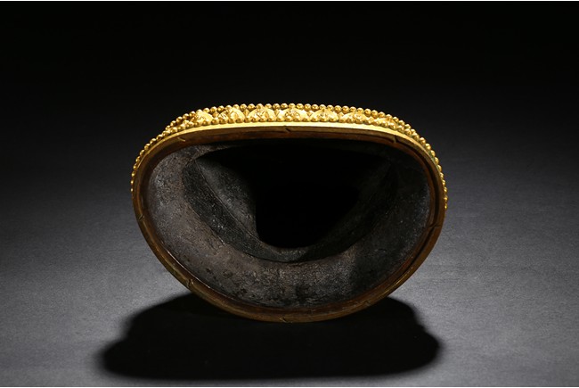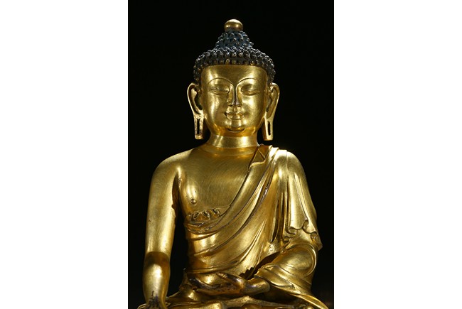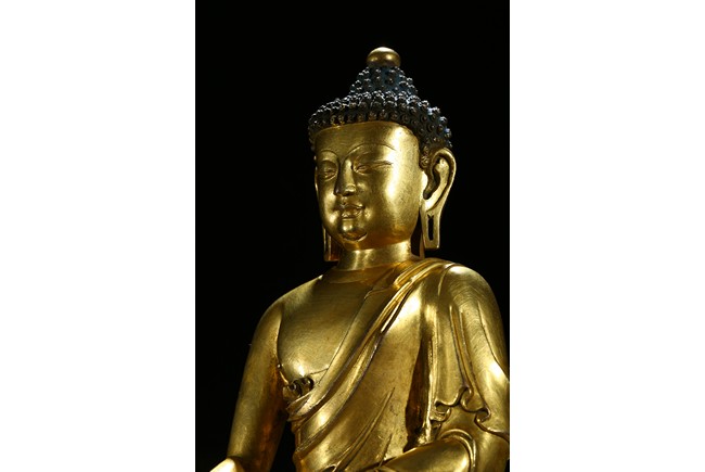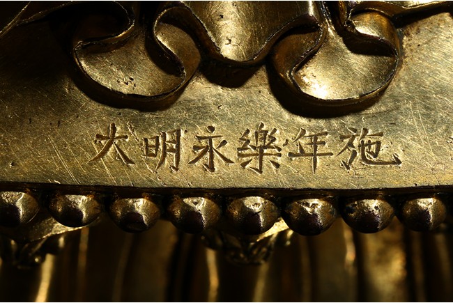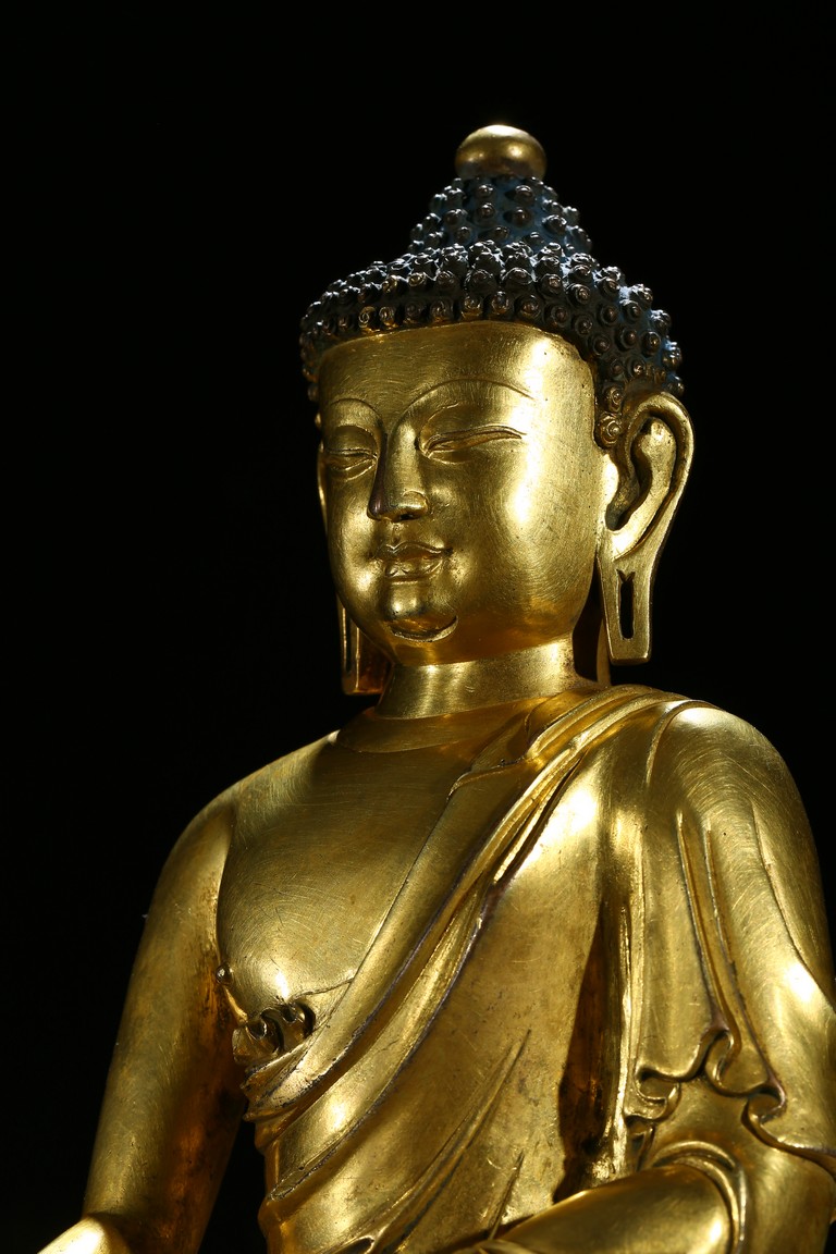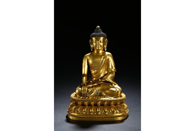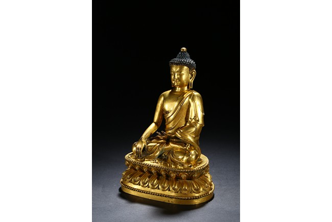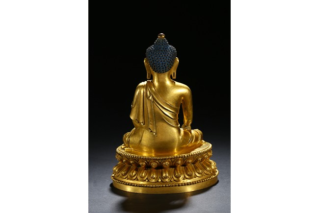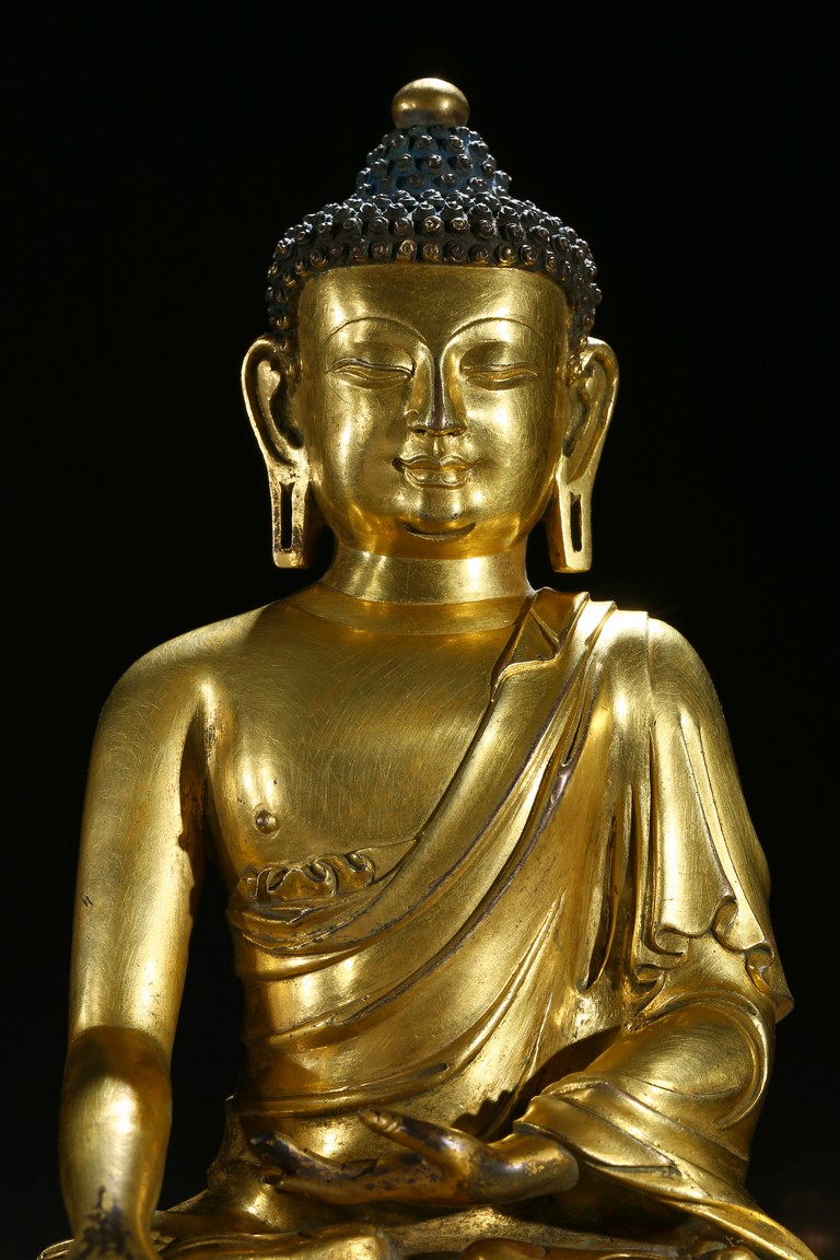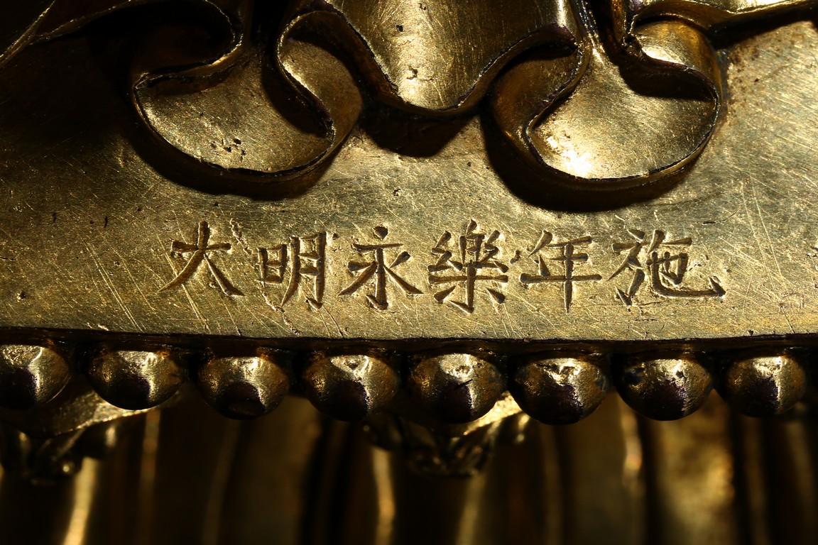 Seated in dhyanasana with his right hand in bhumisparsamudra, wearing finely delineated robes over a well-modelled torso leaving the chest and one arm bare, the serene face framed by long pendulous earlobes and the tightly curled hair rising to a prominent ushnisha with blue pigment, all supported on a double lotus base with beaded borders, the front incised with six character 'YONGLE' Mark. Ming Dynasty period.