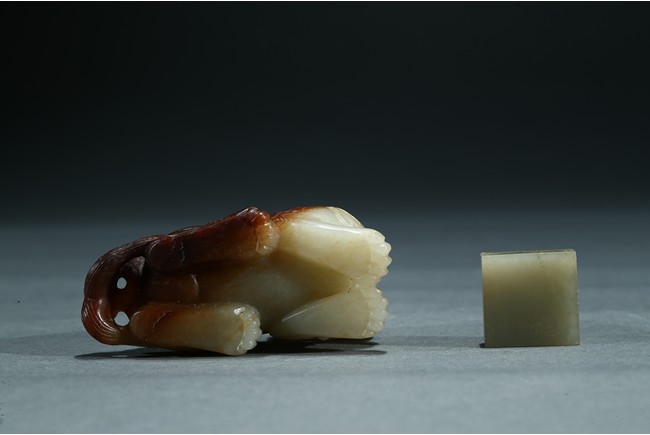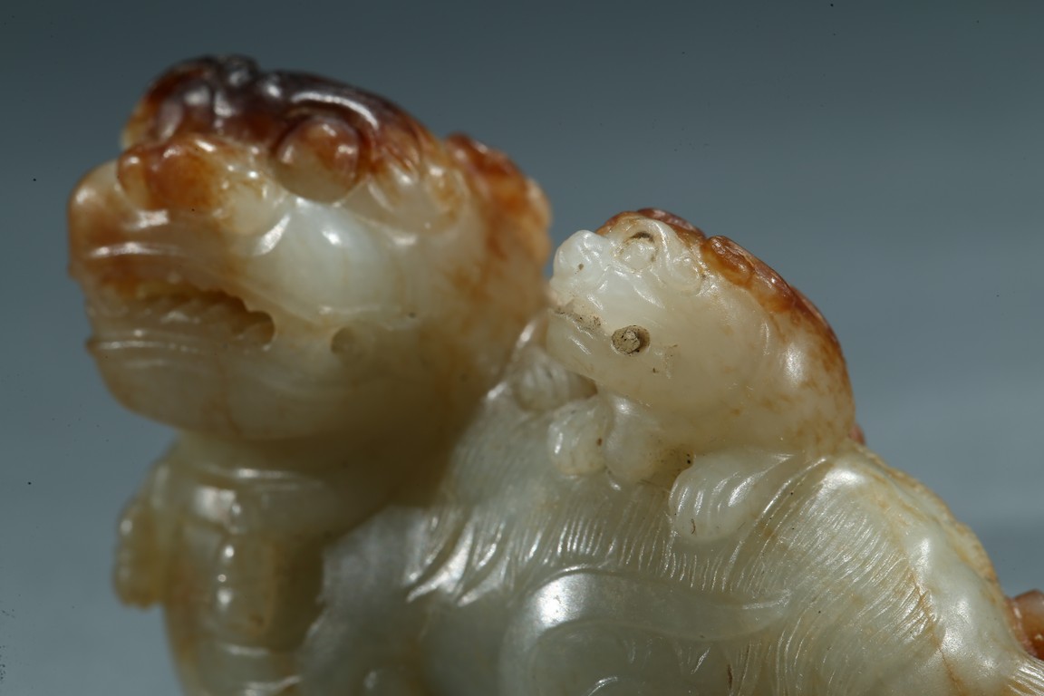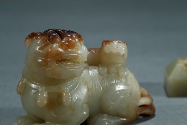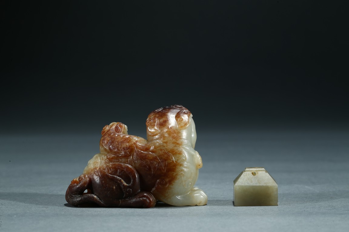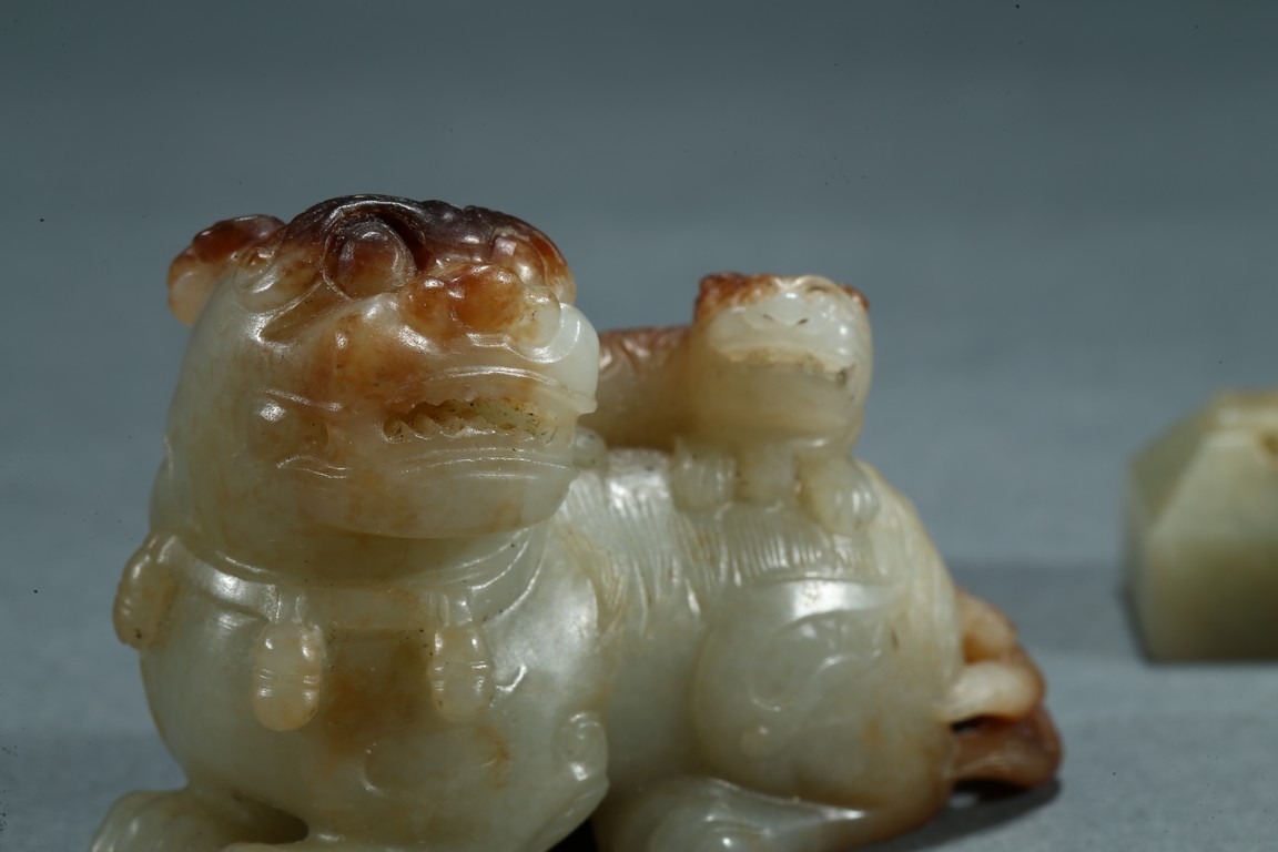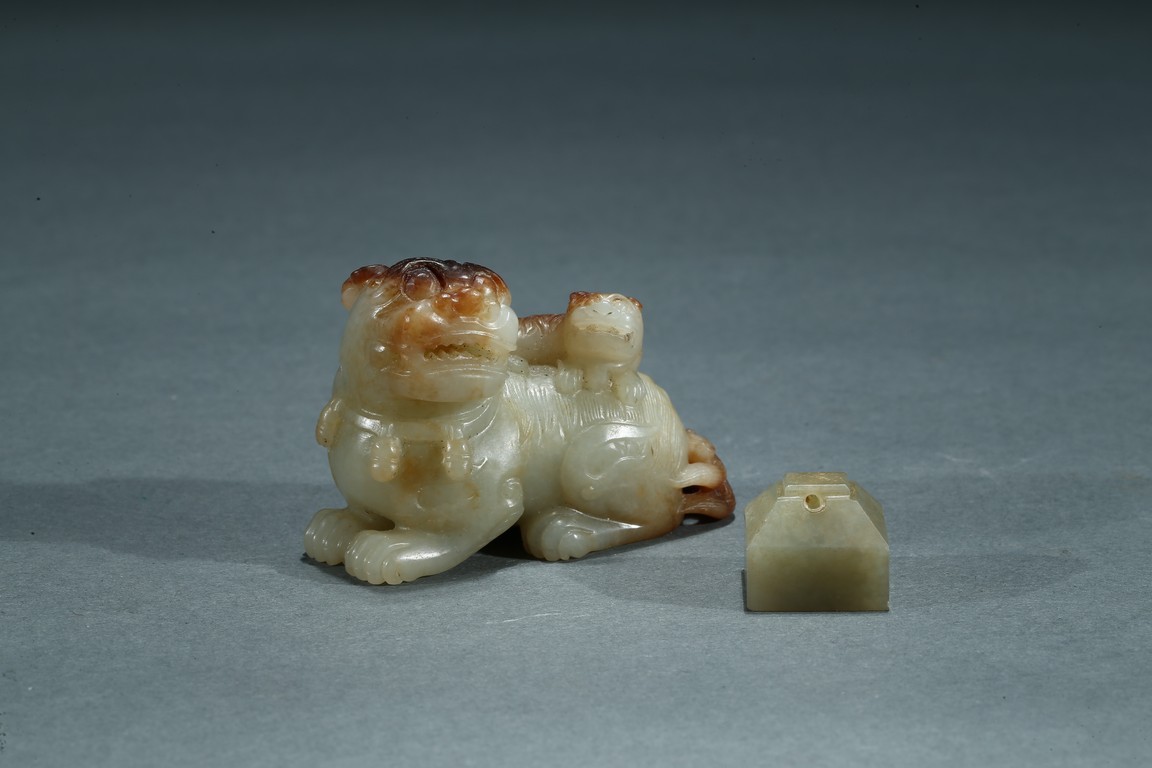 Comprising of a white and russet jade carving of a large recumbent Buddhist lion with a child lion on its back and a small similar square pale celadon jade cube, the Buddhist lions with round bulging eyes below thick brows and mane defined in tight curls,the stone of even celadon white tone with russet inclusions. Ming Dynasty period.