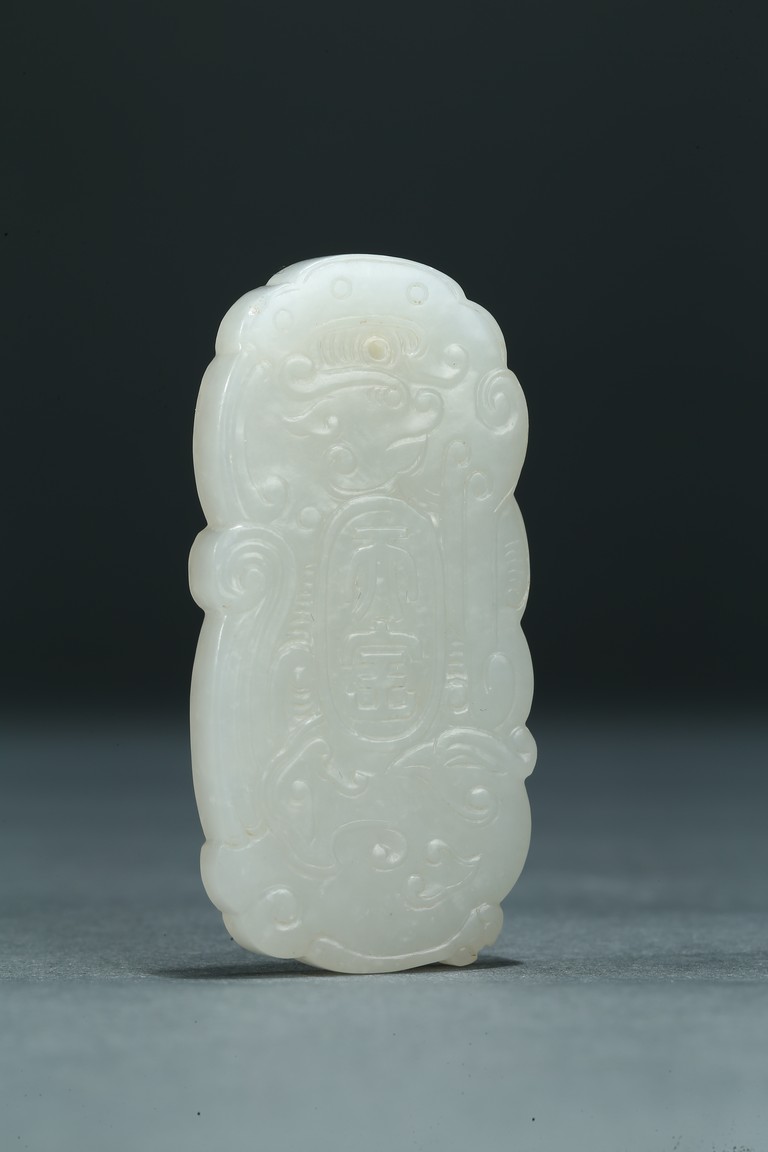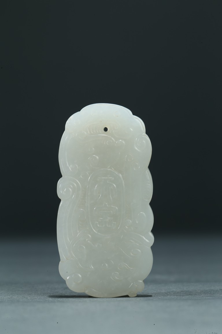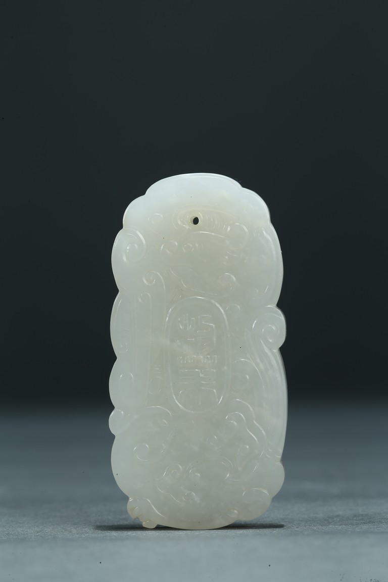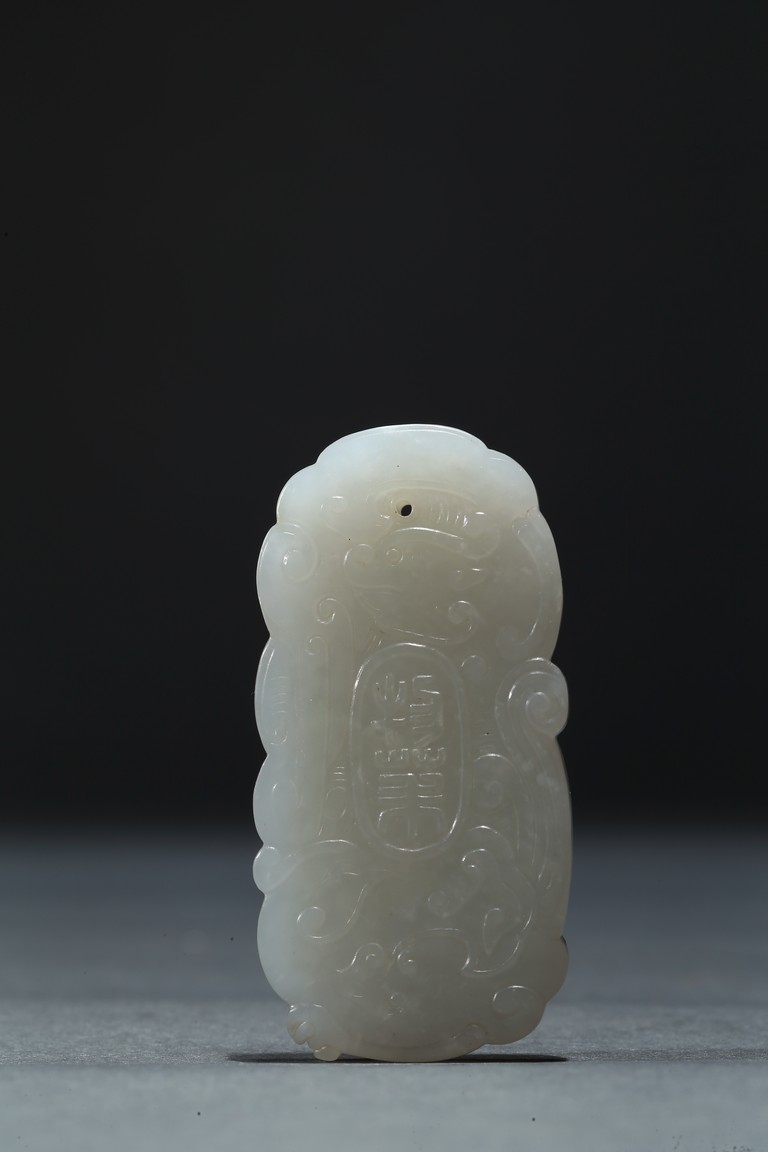 The white jade pendant of shaped oval form, carved with two character within a roundel surrounded by stylized mythical beasts, the reverse similarly carved. Qing Dynasty period.