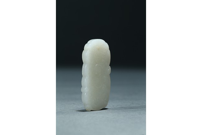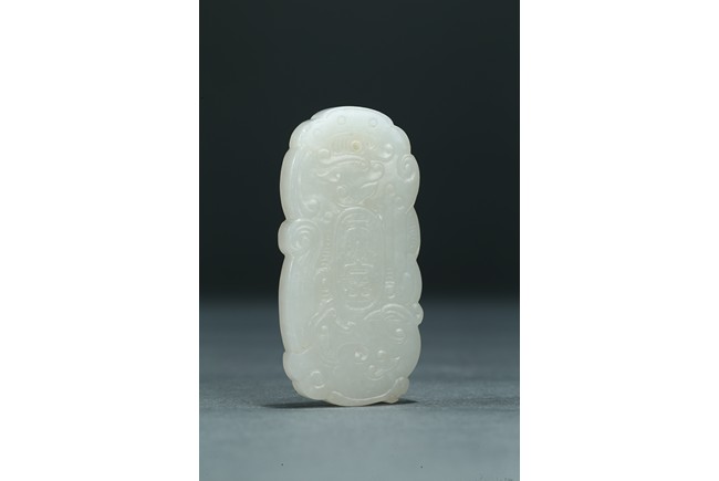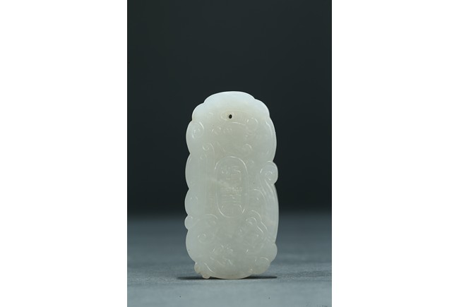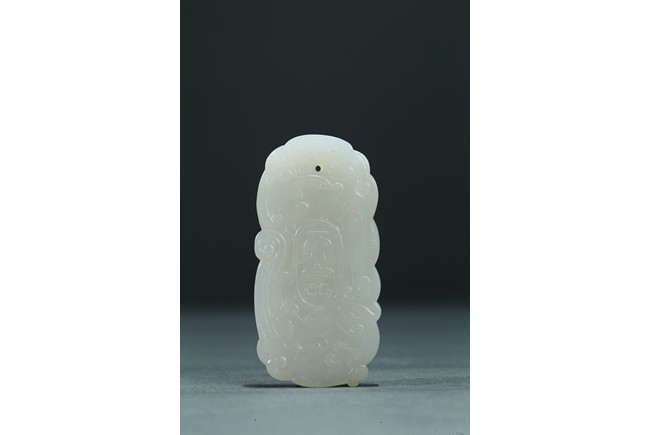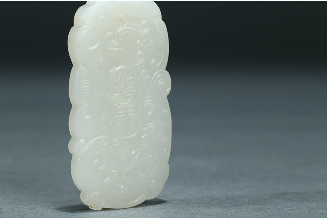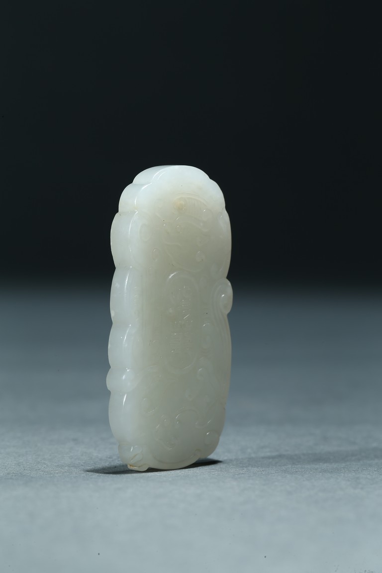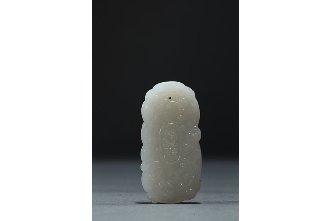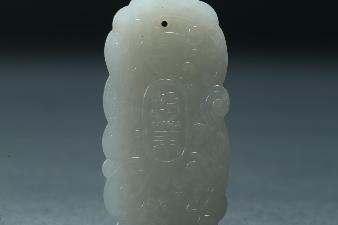The white jade pendant of shaped oval form, carved with two character within a roundel surrounded by stylized mythical beasts, the reverse similarly carved. Qing Dynasty period.