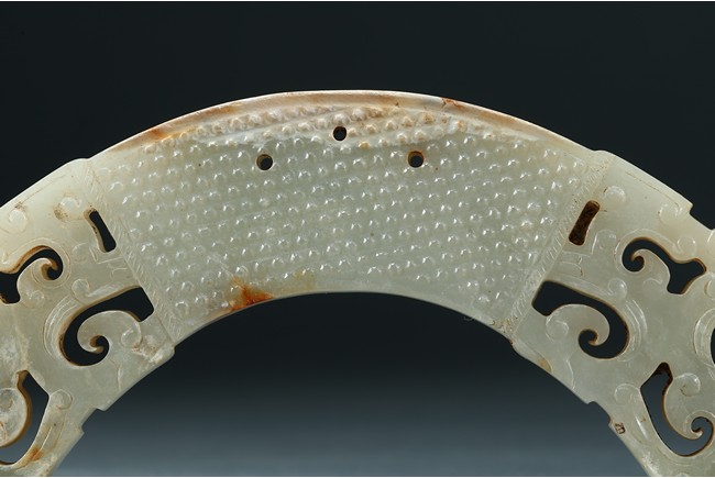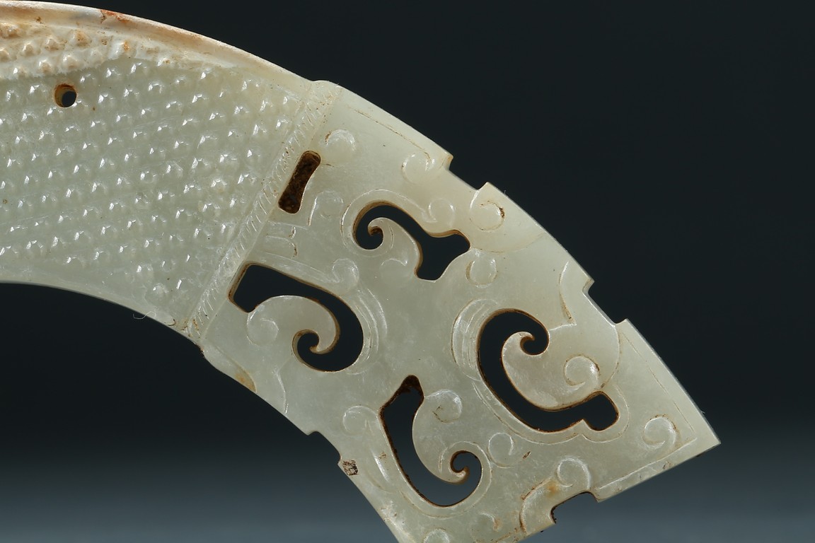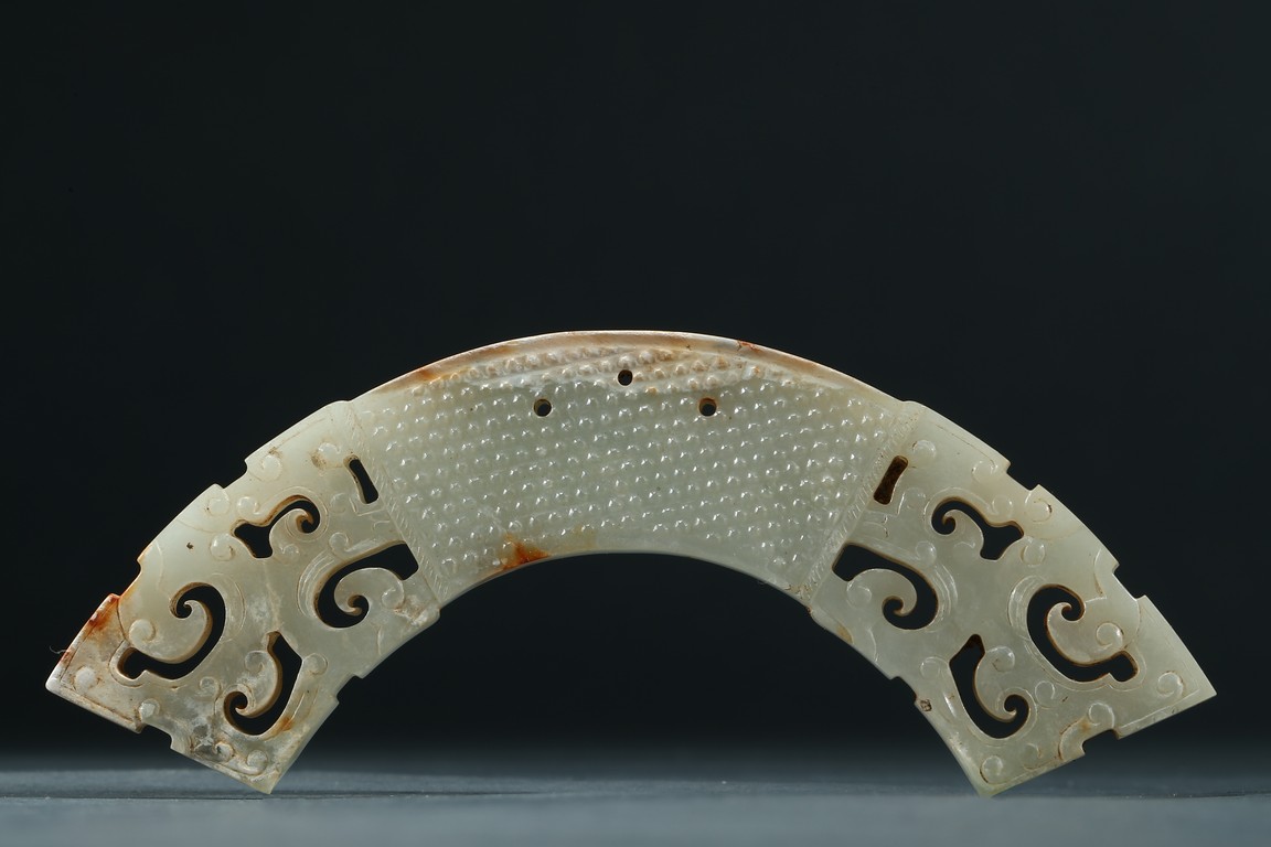 Of arched form, each center finely carved with small commas to front and reverse, with three small circular opening for suspension, terminating with openwork stylized scrolled pattern, the stone is of pale white tone with minor russet inclusions here and there. Warring State period.