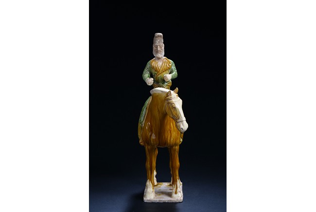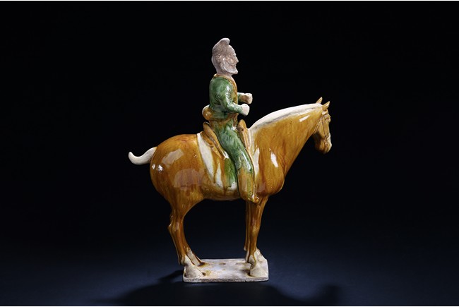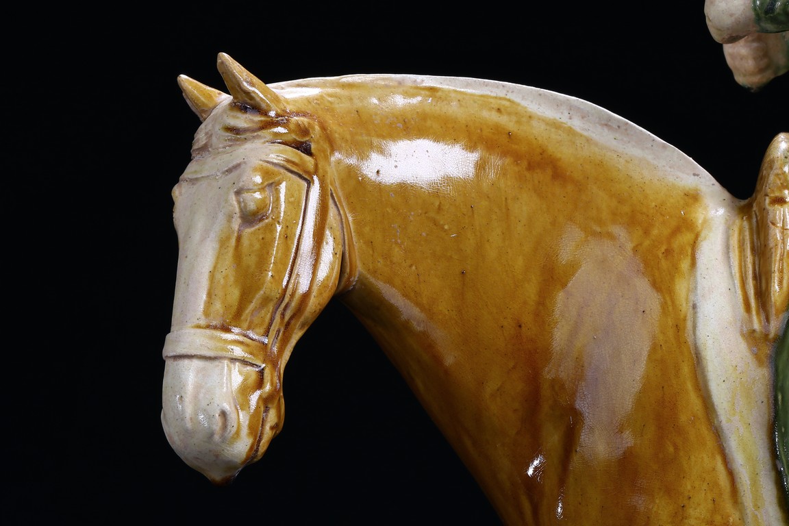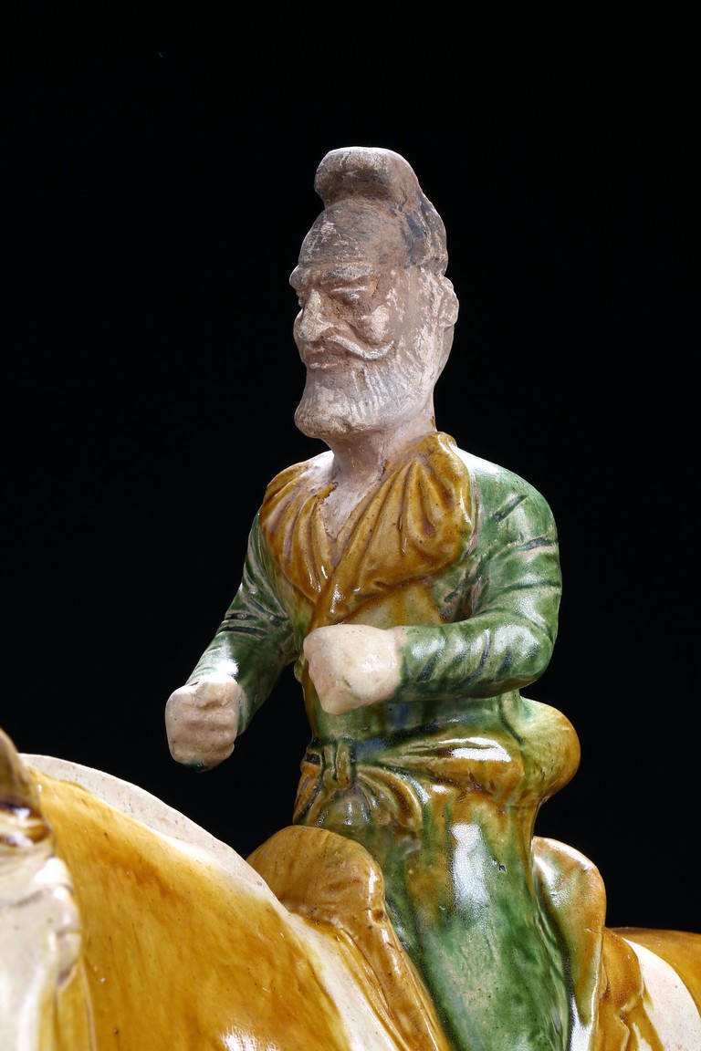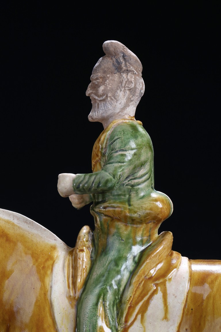 The foreigner rider with both hands raised as if holding reins, wearing a long green-glazed robe with a sash tied around the waist, the face well-defined with details picked out in pale white, the horse standing four square with head slightly turn left, with pricked ears and bulging eyes, covered with a polished amber glaze, with the head, mane and tail highlighted in creamy-white, the saddle streaked in white, amber and yellow. Tang Dynasty period.