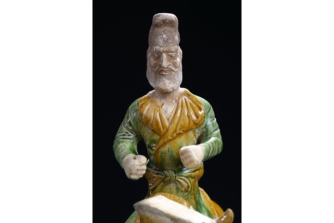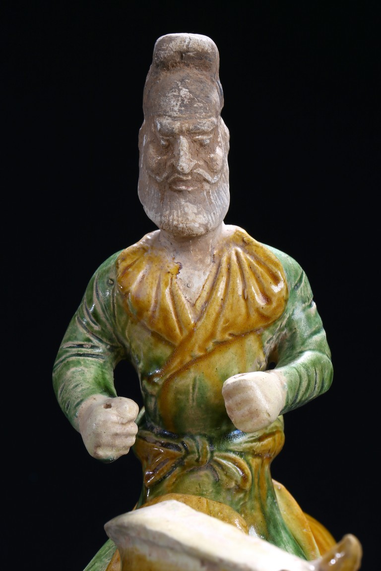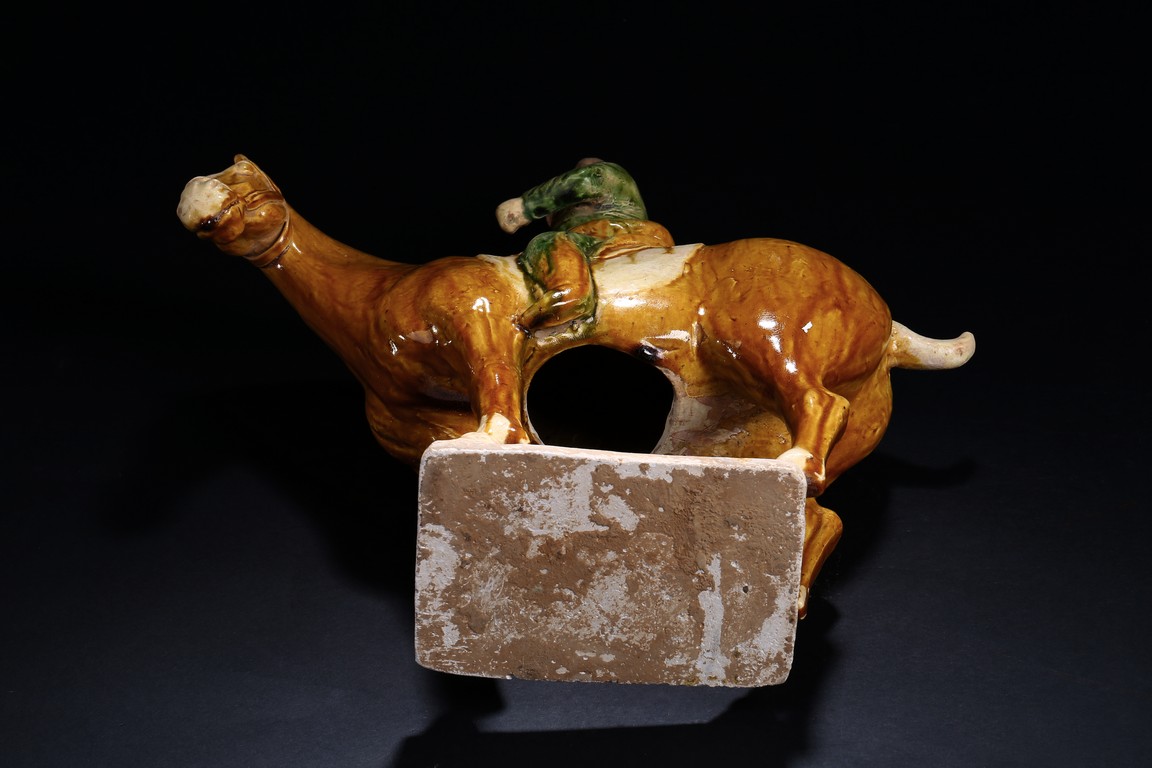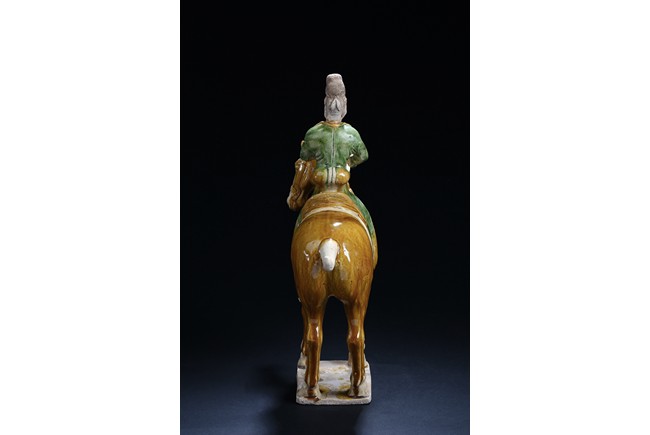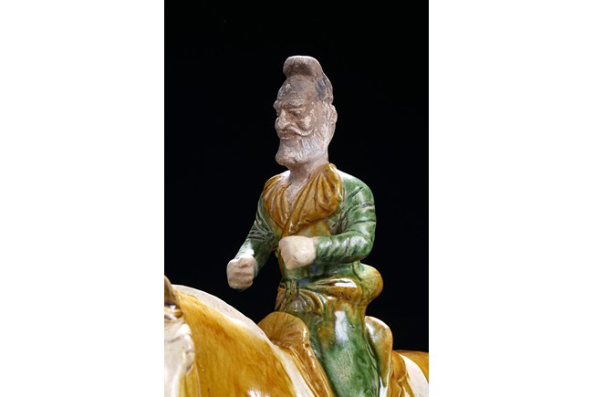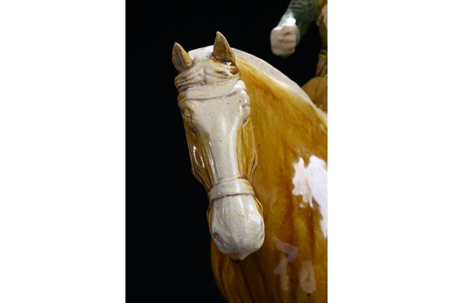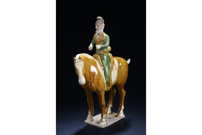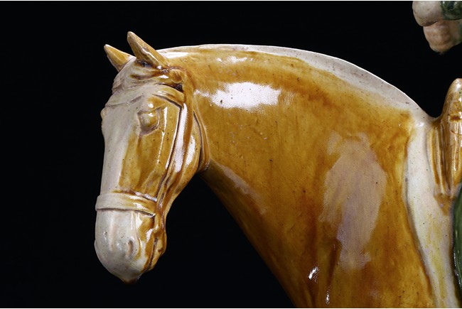 The foreigner rider with both hands raised as if holding reins, wearing a long green-glazed robe with a sash tied around the waist, the face well-defined with details picked out in pale white, the horse standing four square with head slightly turn left, with pricked ears and bulging eyes, covered with a polished amber glaze, with the head, mane and tail highlighted in creamy-white, the saddle streaked in white, amber and yellow. Tang Dynasty period.