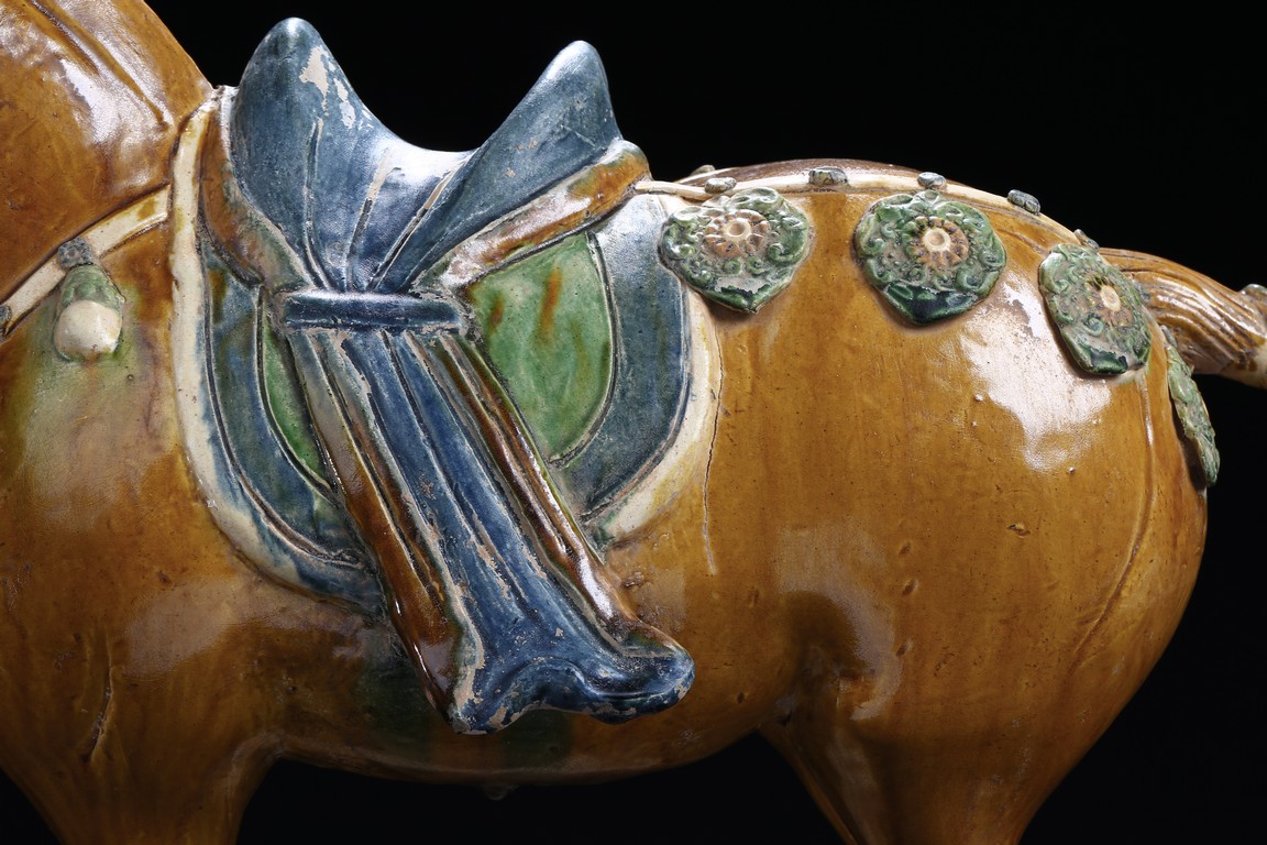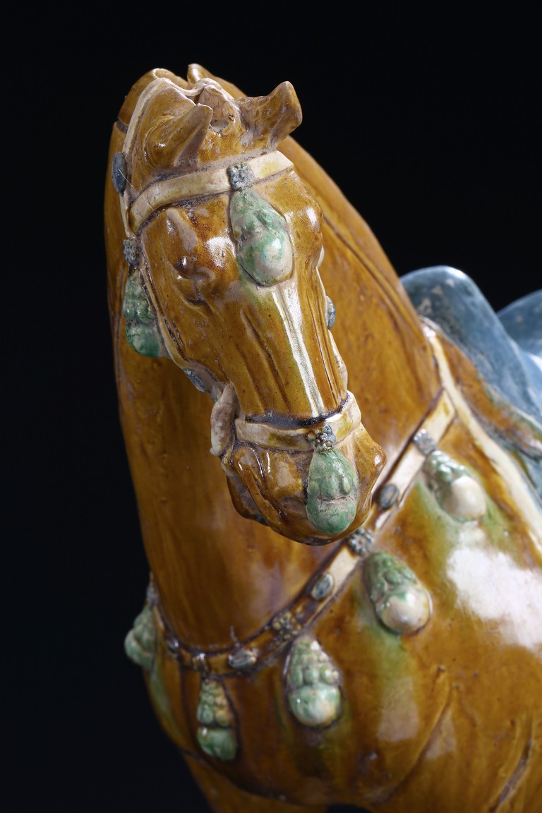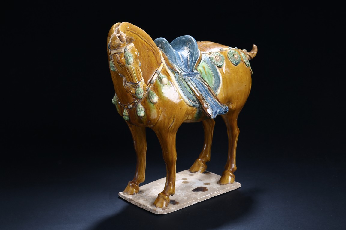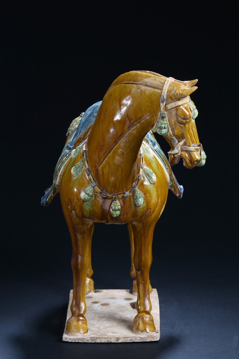 Well-modeled, standing foursquare on a flat base, the head slightly lowered and turned leftward with crisply modeled features including bulging eyes, open mouth, flared nostrils, strapped in a bridle with green, blue and amber floret trappings on the forehead, nose and flanking the jaw continuing around the neck and resting on the rump, finished with a pleated blue painted saddle resting on a mottled green, blue and amber glaze saddle blanket on the back. Tang Dynasty period.