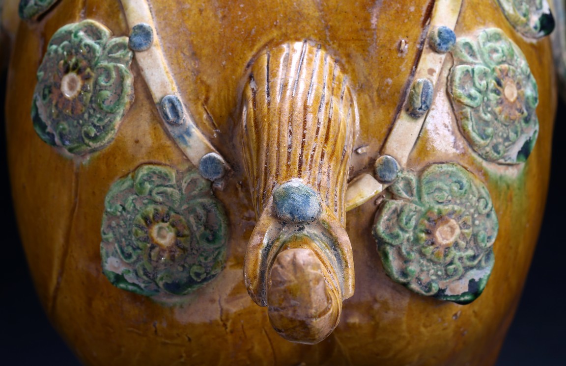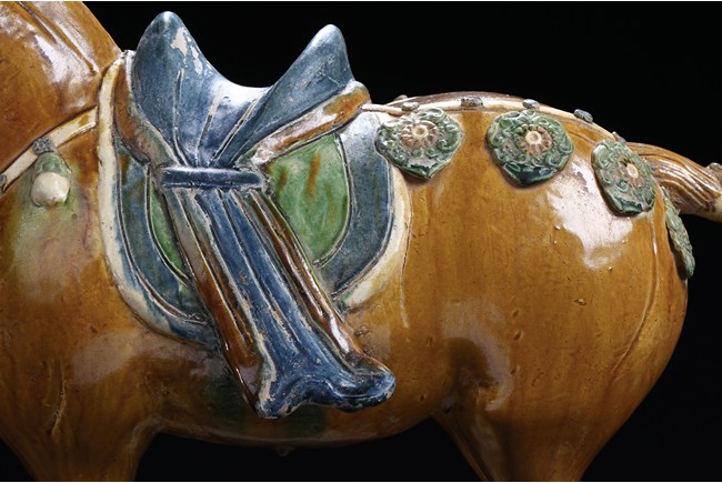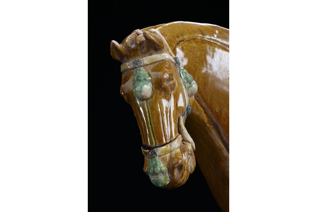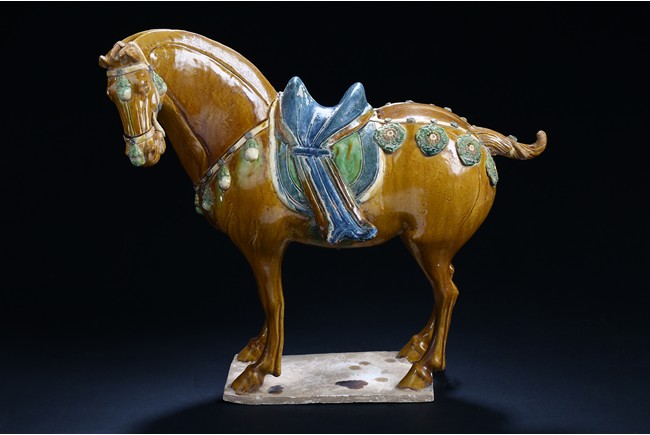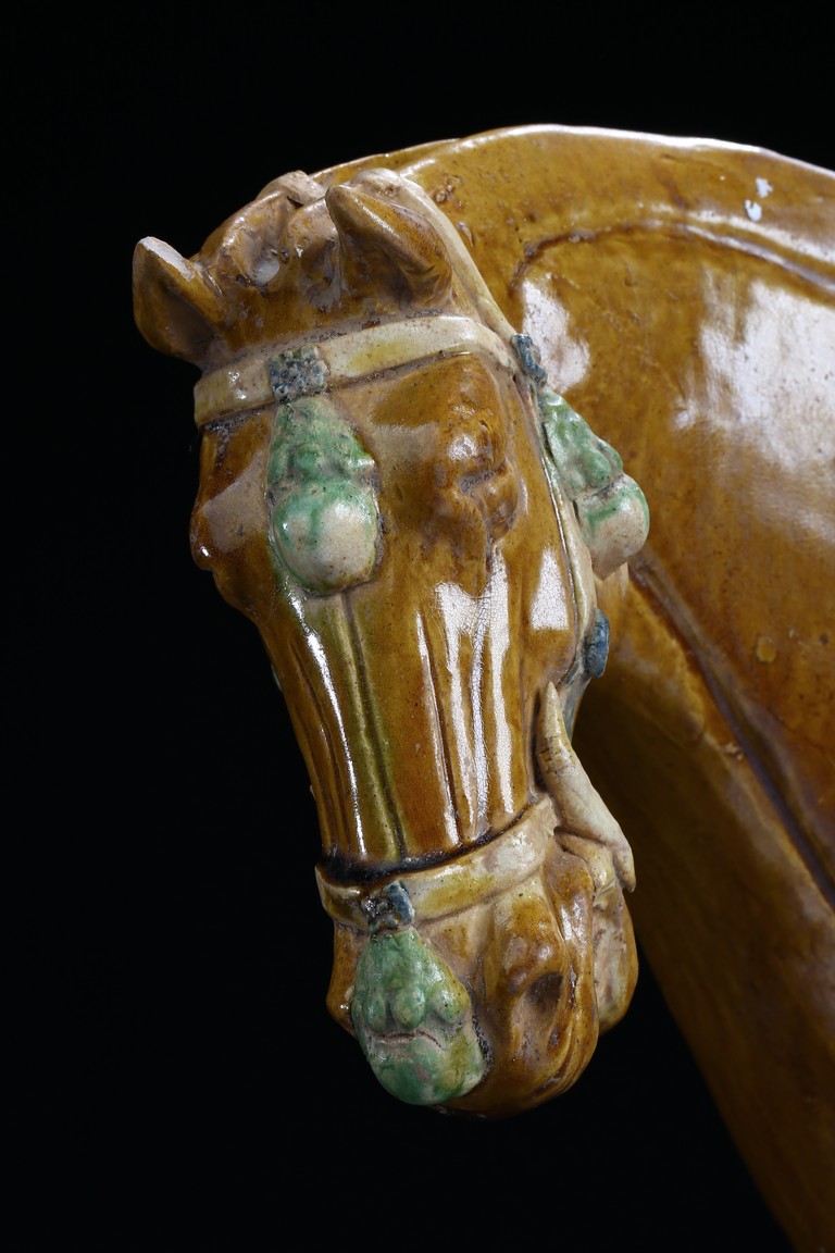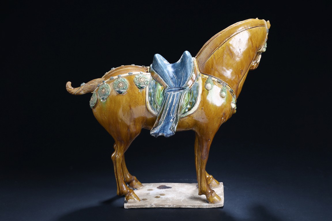 Well-modeled, standing foursquare on a flat base, the head slightly lowered and turned leftward with crisply modeled features including bulging eyes, open mouth, flared nostrils, strapped in a bridle with green, blue and amber floret trappings on the forehead, nose and flanking the jaw continuing around the neck and resting on the rump, finished with a pleated blue painted saddle resting on a mottled green, blue and amber glaze saddle blanket on the back. Tang Dynasty period.