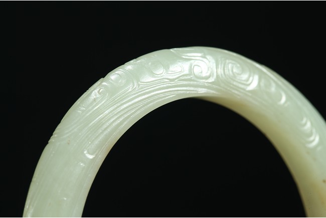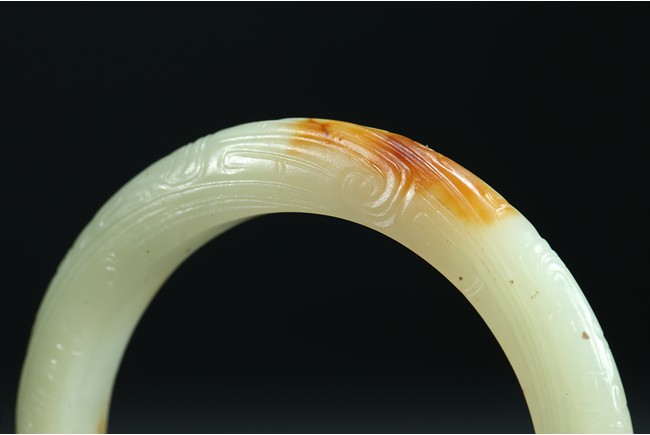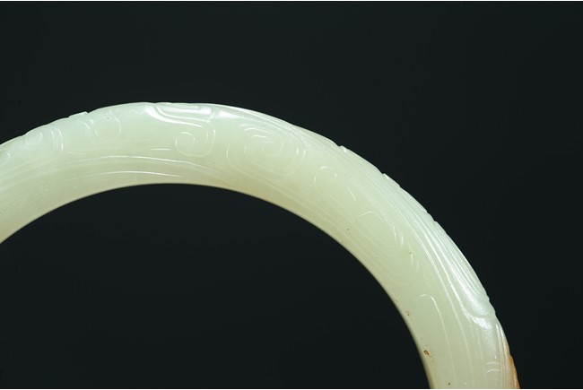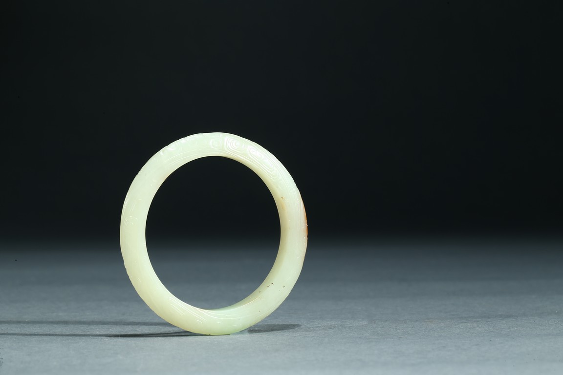 The rounded bangle finely carved in shallow relief with archaistic pattern, the stone in light yellow tone with russet inclusion. Ming Dynasty period.