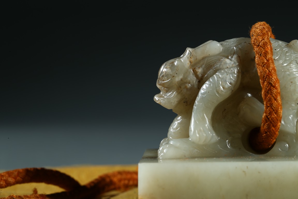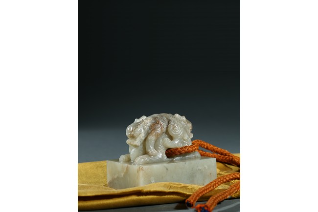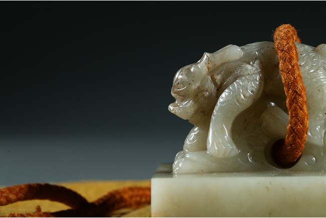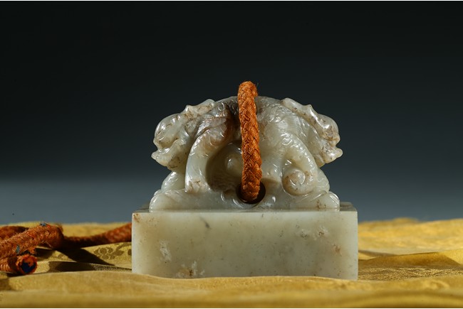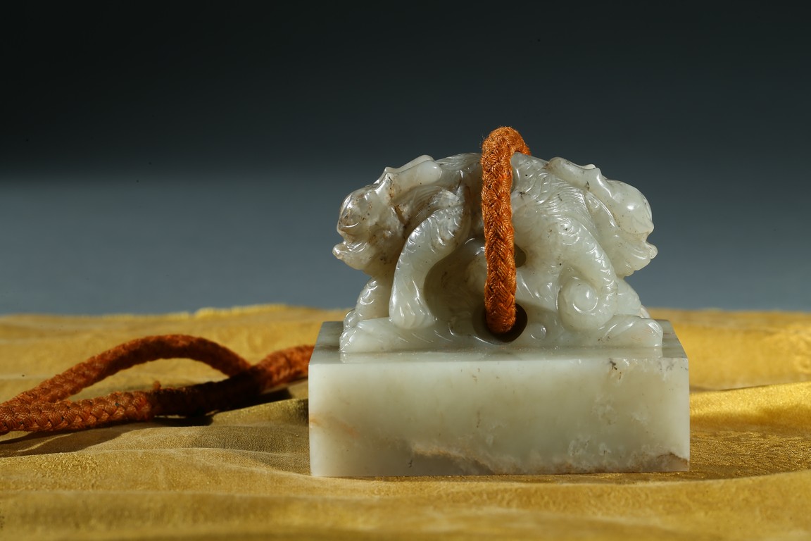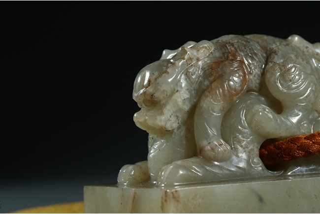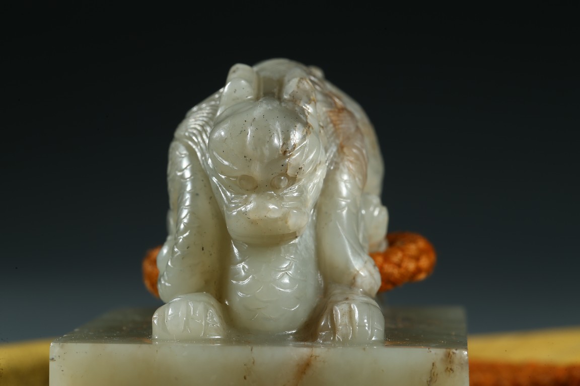 Of large rectangular form, surmounted by a pair of recumbent dragons, each powerfully carved with eyes bulging and nostrils, the mouth slightly opened to reveal its tongue, with two long horns extending back over its head along a combed mane with finely incised details, the stone of white celadon tone with veins of russet inclusions, the seal face deeply carved with six character. Qing Dynasty period.
