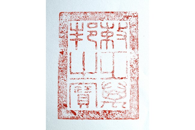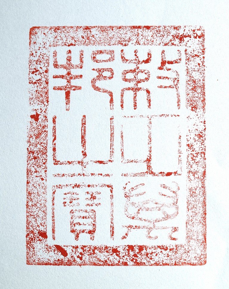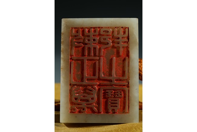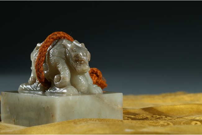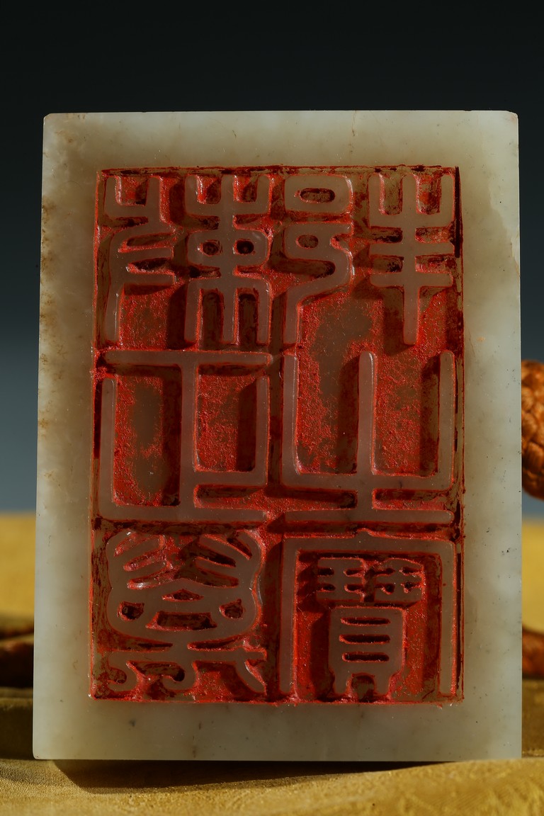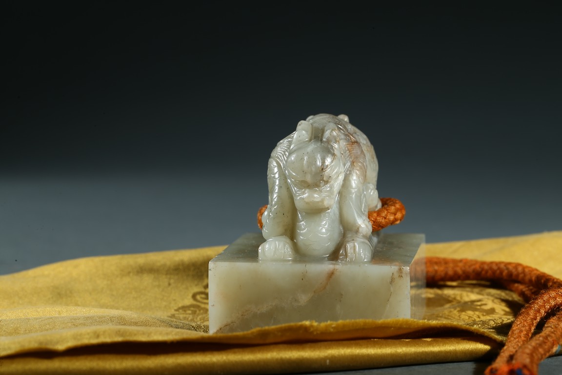 Of large rectangular form, surmounted by a pair of recumbent dragons, each powerfully carved with eyes bulging and nostrils, the mouth slightly opened to reveal its tongue, with two long horns extending back over its head along a combed mane with finely incised details, the stone of white celadon tone with veins of russet inclusions, the seal face deeply carved with six character. Qing Dynasty period.