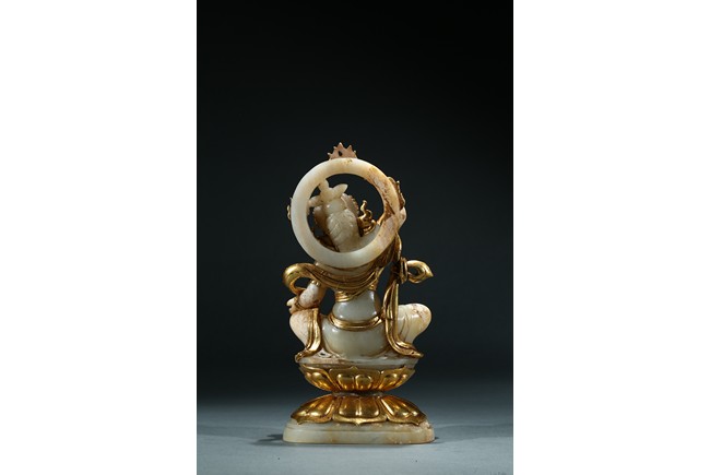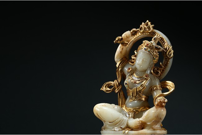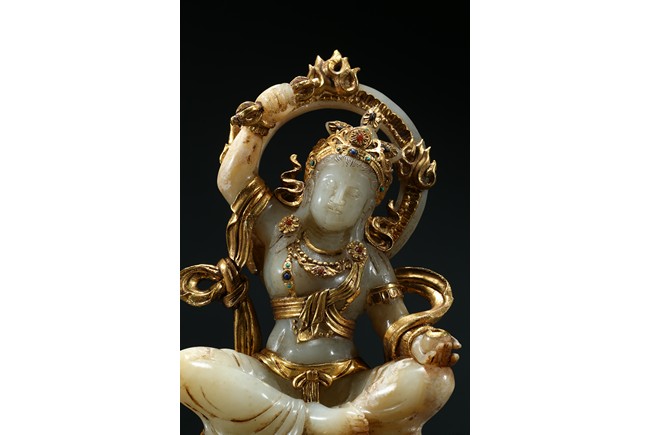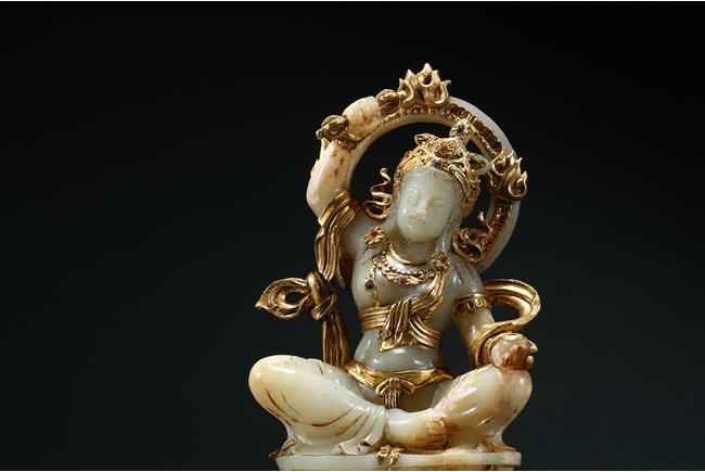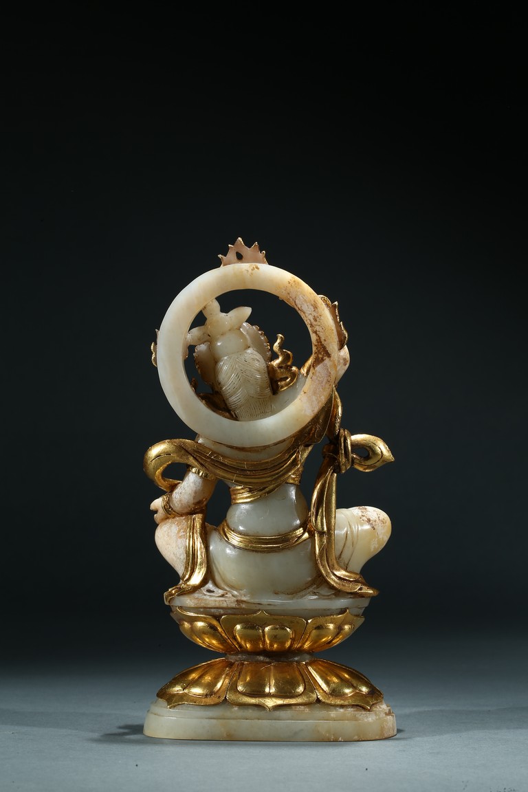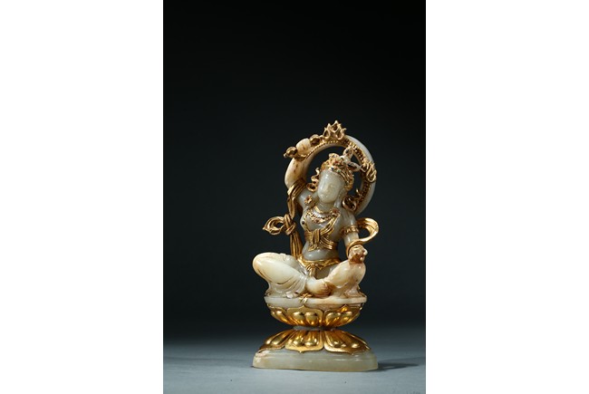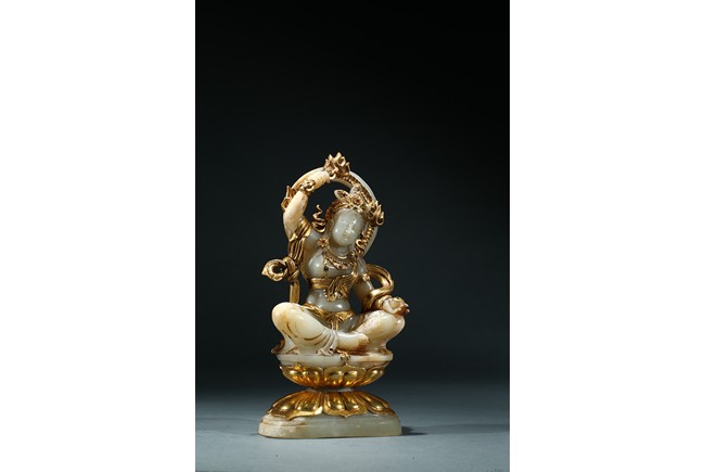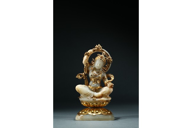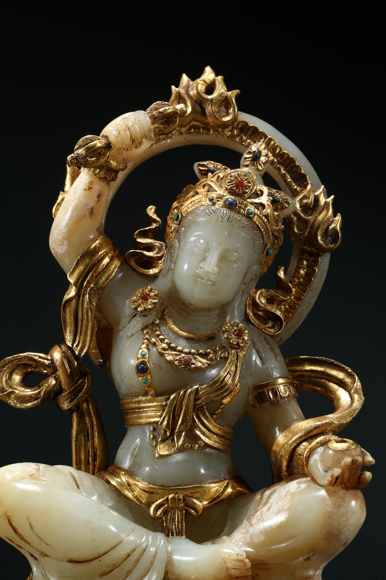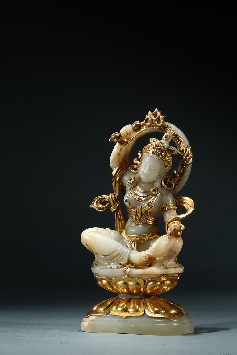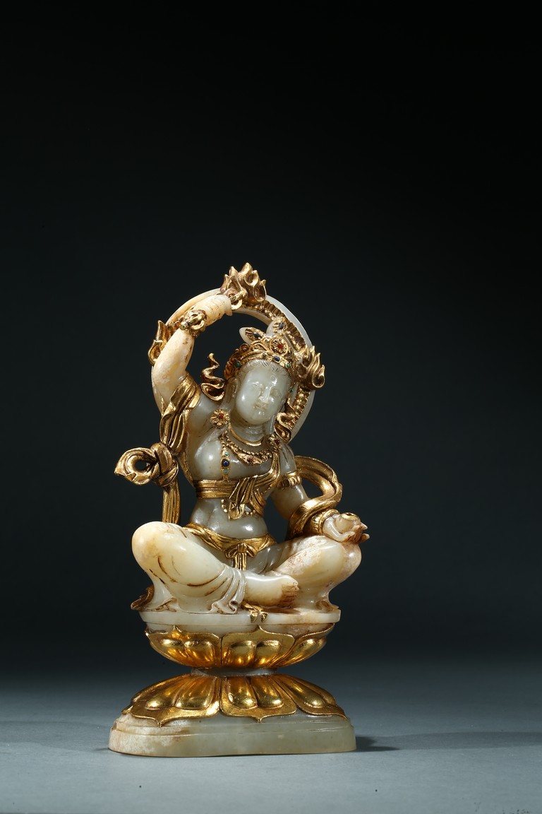 Shown seated upon a double lotus throne inlaid with gilt or gold lotus petal, the bodhisattva with right hand raised above head holding a vajra, left hand resting upon knee with palm open, wearing elaborate gilt or gold flowing ribbon across shoulder and arm, wearing elaborate crown embellished with gems.