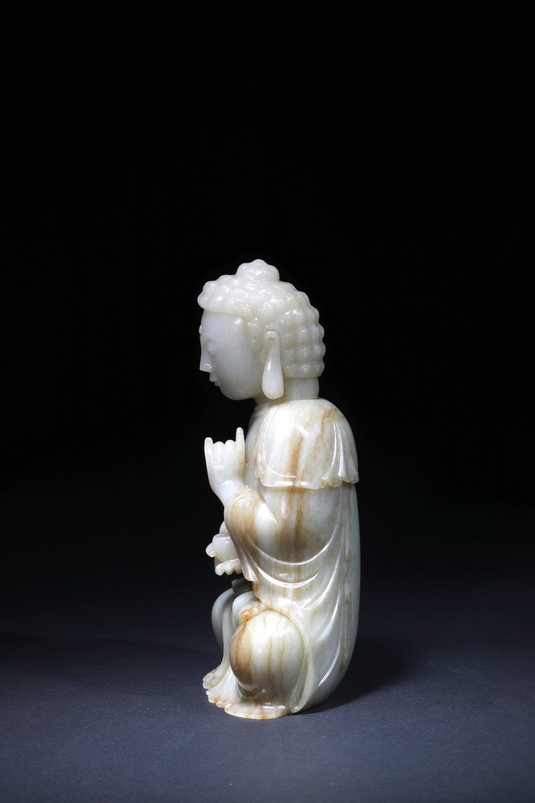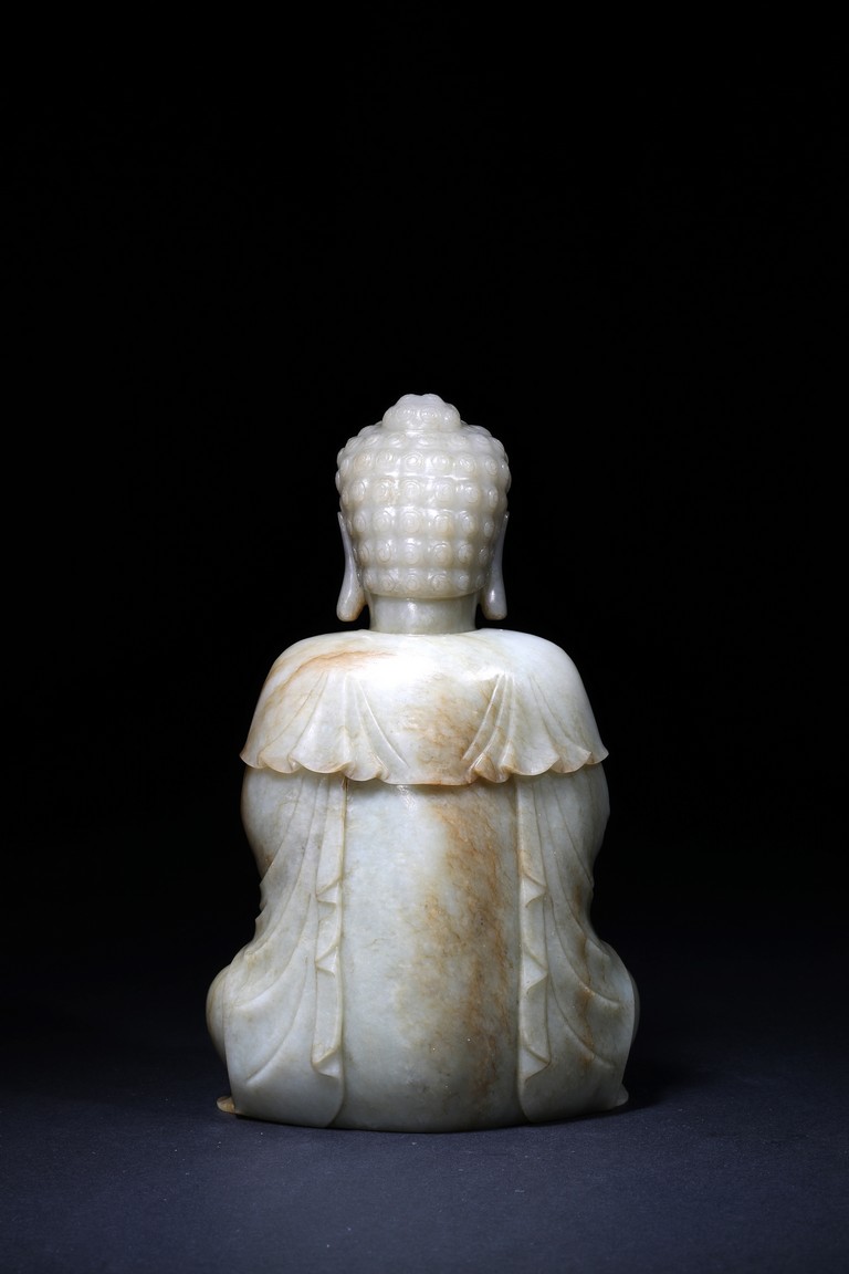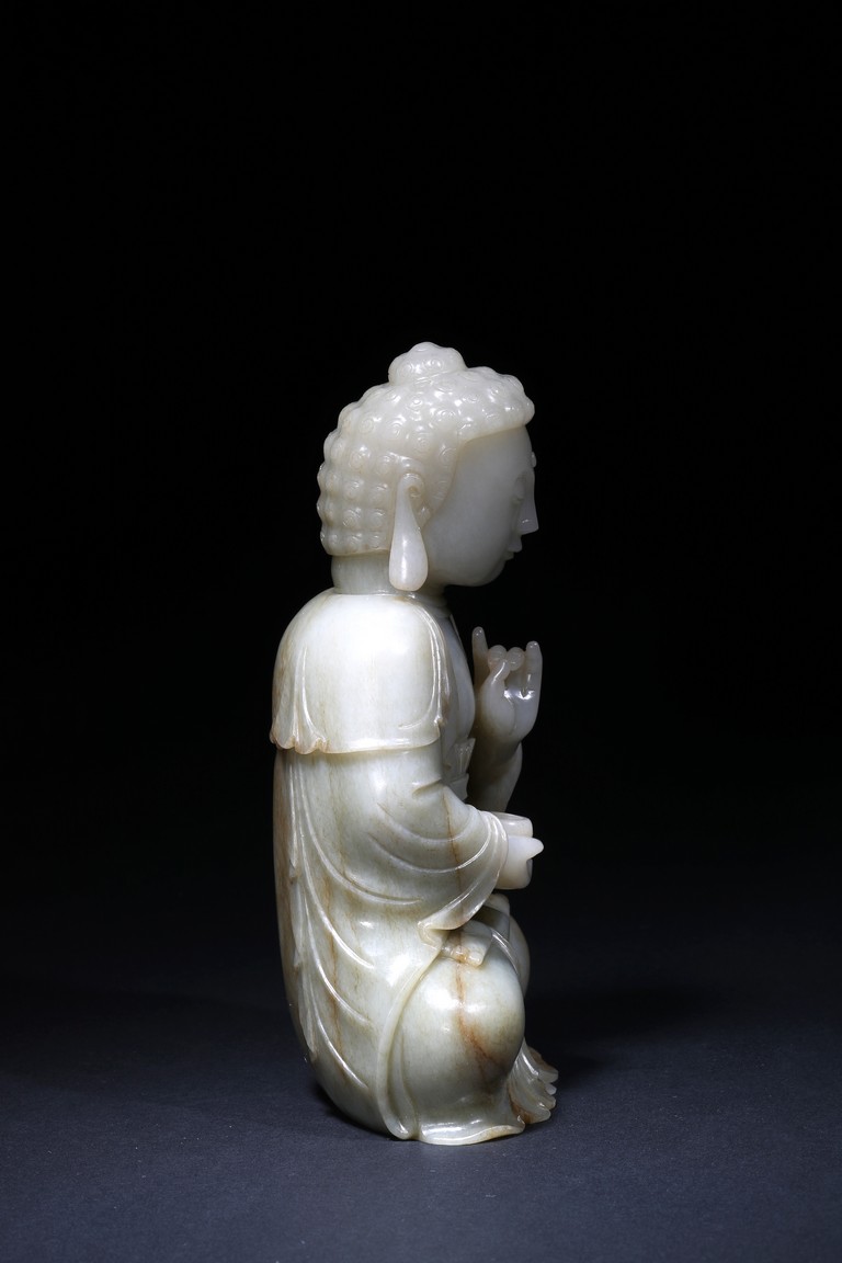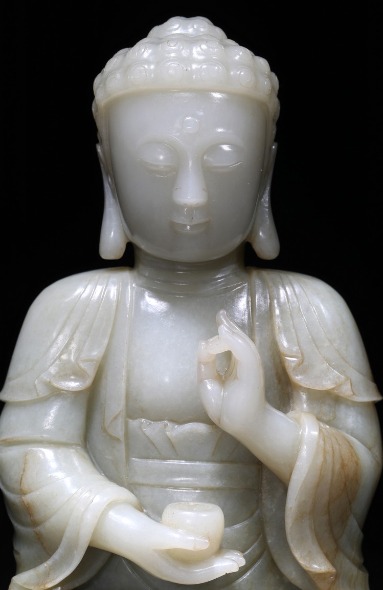 Seated in dhyanasana, the right hand holding a vase, wearing long flowing robes at the chest, the hair tightly curled around the protuberant ushnisha, the face with downcast eyes and a gentle smile, the stone of translucent white tone with minor russet inclusions. Late Qing Dynasty period.