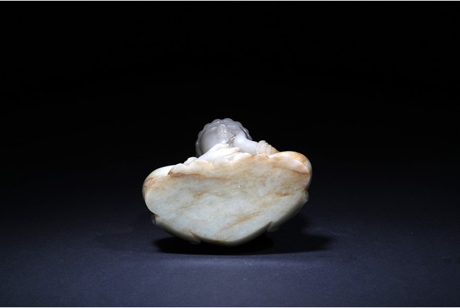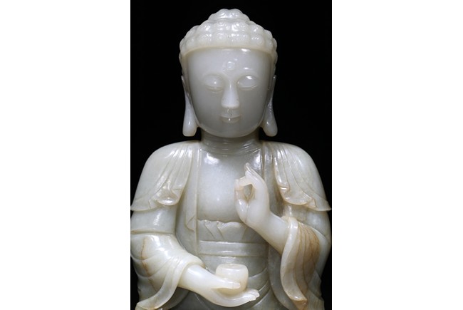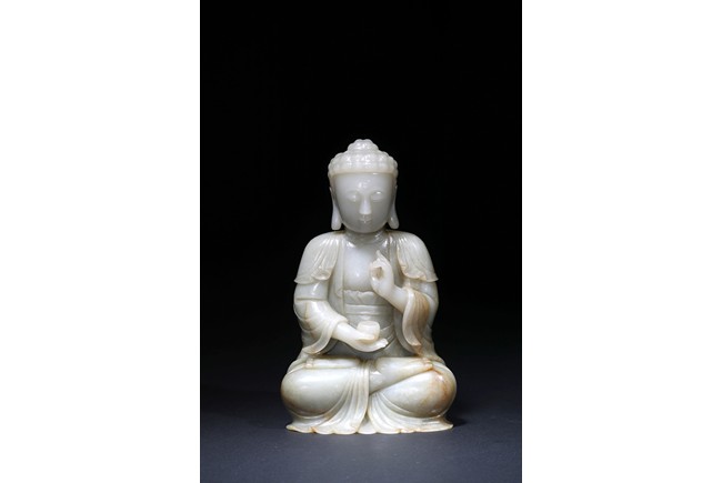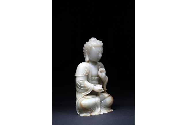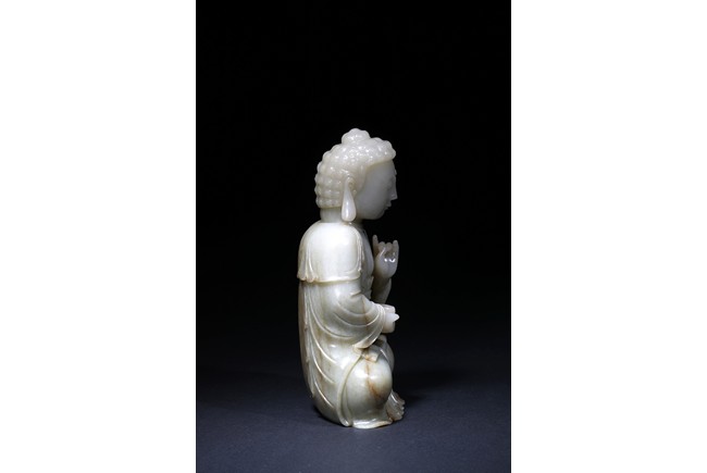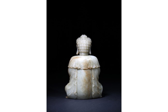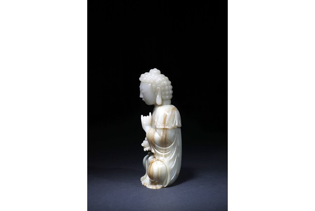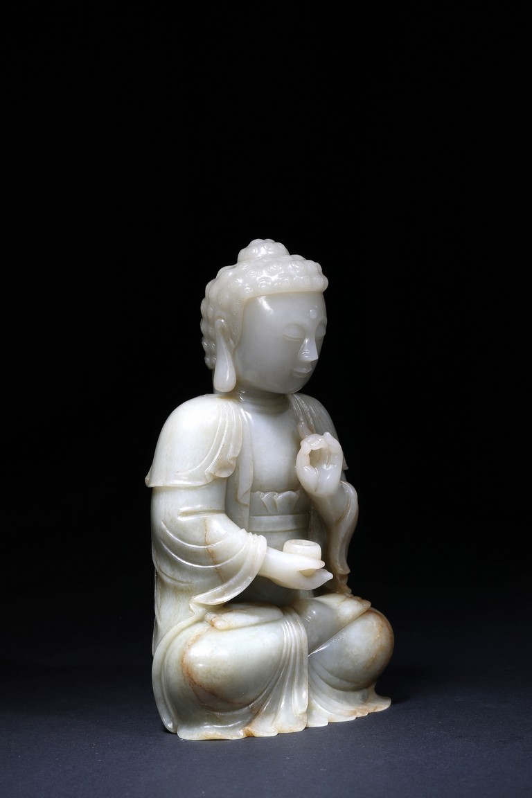 Seated in dhyanasana, the right hand holding a vase, wearing long flowing robes at the chest, the hair tightly curled around the protuberant ushnisha, the face with downcast eyes and a gentle smile, the stone of translucent white tone with minor russet inclusions. Late Qing Dynasty period.