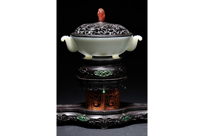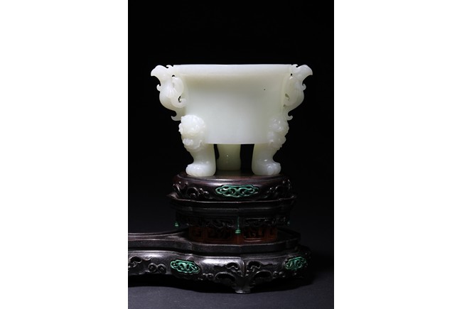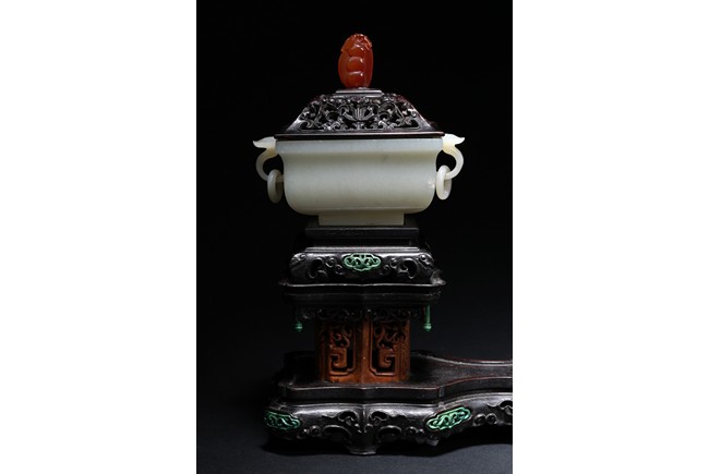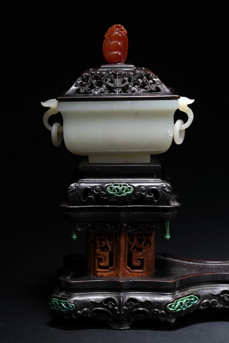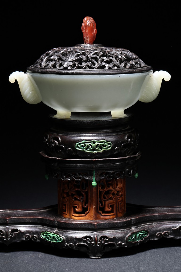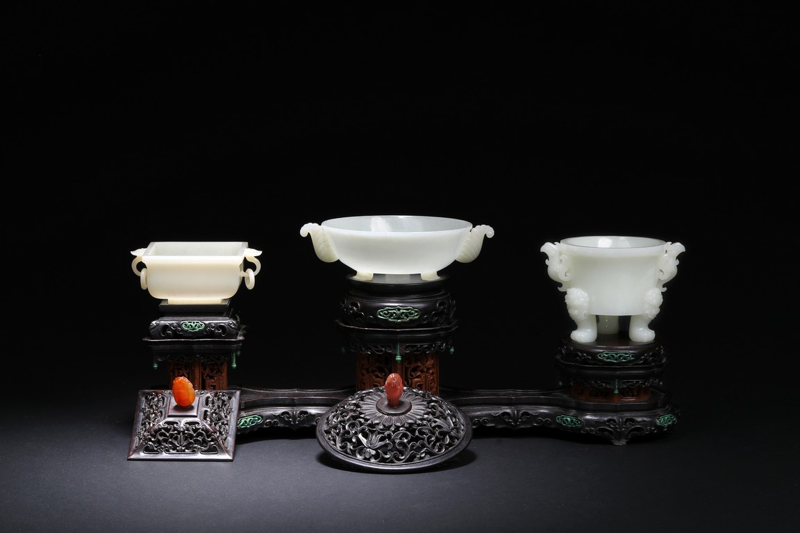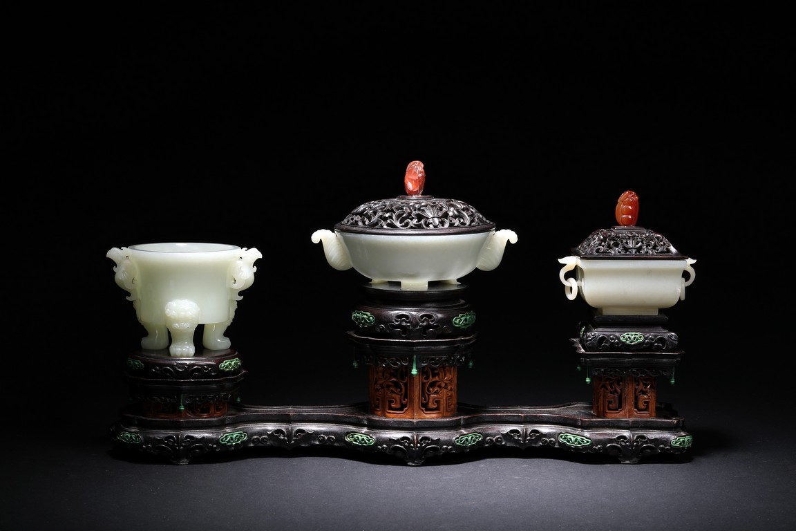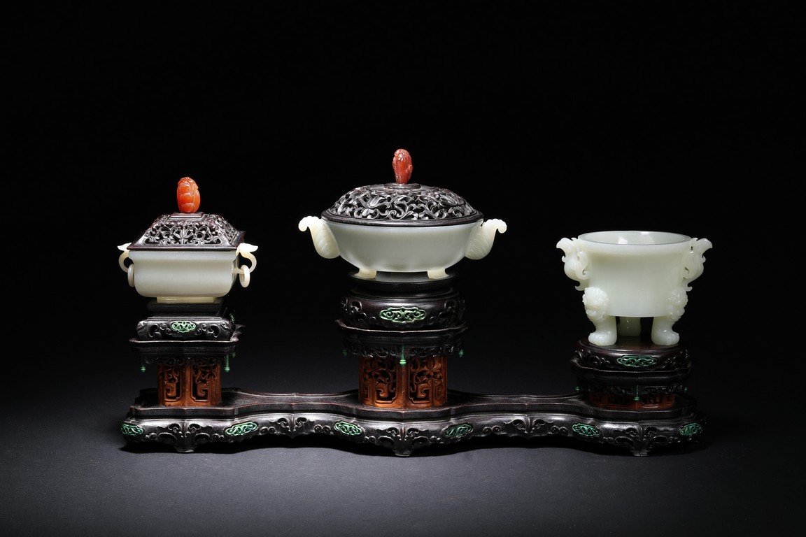 Comprising two tripod censers and a square section censer with cover, the censer of compressed rounded form resting on three short feet, flanked by a pair of S-shaped handles, the domed cover surmounted by an agate finial; the taller censer raised on three powerful beast shaped feet decorated with beast mask, flanked by pair of phoenix form handles; the square sectioned censer and cover with deep sides on a short foot, with pair of slender s-shaped handles with loose rings and fitted cover; all three of translucent white tone supported on a finely carved zitan stand.