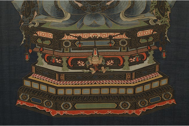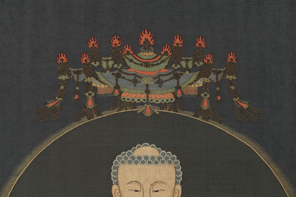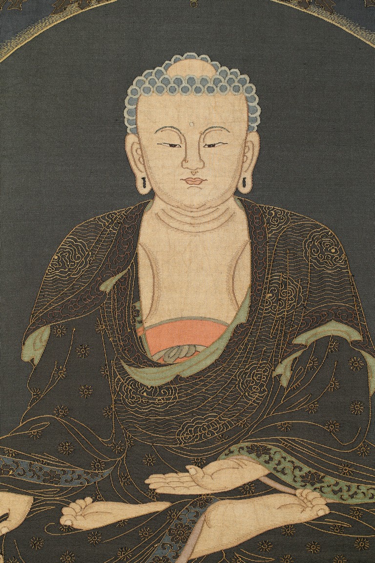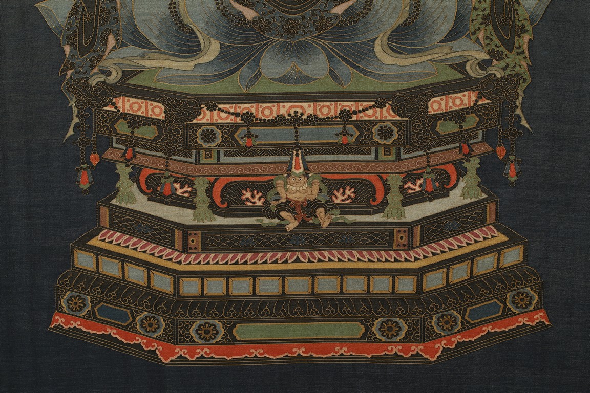 The central figure of Shakyamuni is shown seated in dhyanasana upon a lotus throne supported on an elaborate pagoda-like stand, his hands in dhyana mutra and bhumisparsha mutra, wearing flowing robe delicately decorated with gold threads, backed by large mandorla topped with a lantern. Framed. Qing Dynasty period.