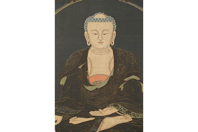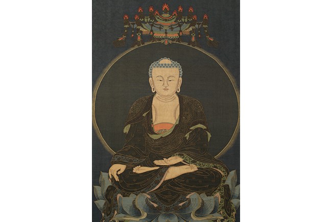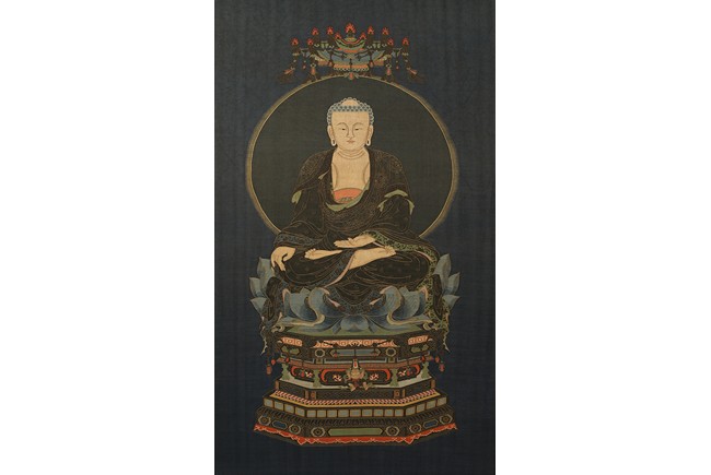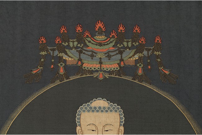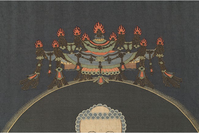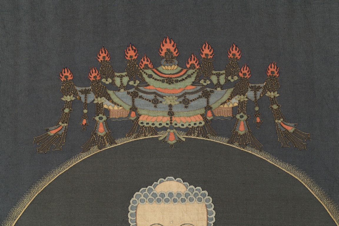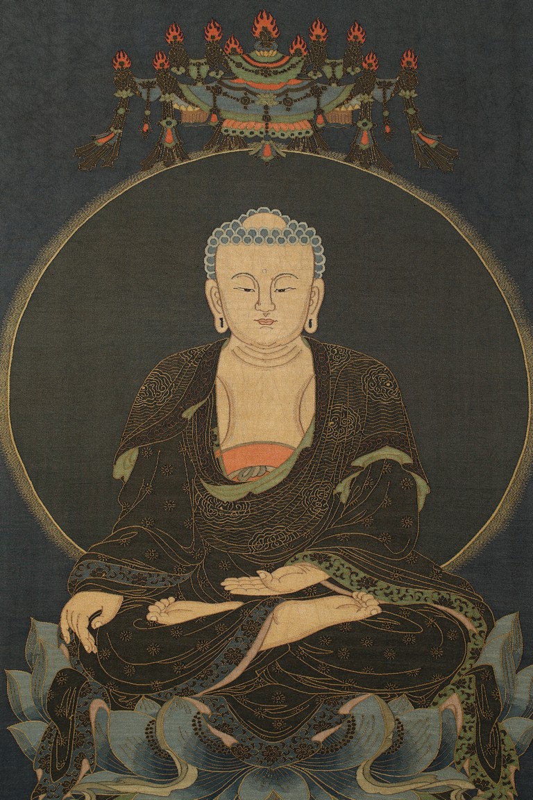 The central figure of Shakyamuni is shown seated in dhyanasana upon a lotus throne supported on an elaborate pagoda-like stand, his hands in dhyana mutra and bhumisparsha mutra, wearing flowing robe delicately decorated with gold threads, backed by large mandorla topped with a lantern. Framed. Qing Dynasty period.