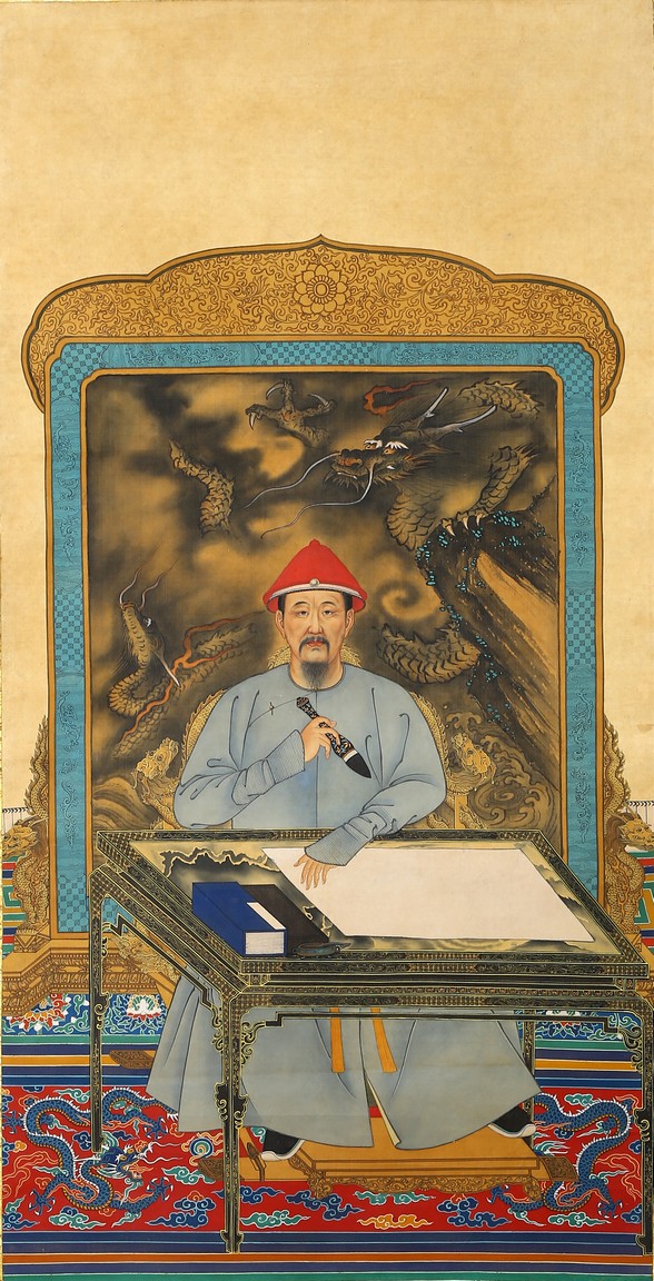 Color and ink on silk. Anonymous. Emperor Kangxi writing calligraphy. Hanging scrolling.