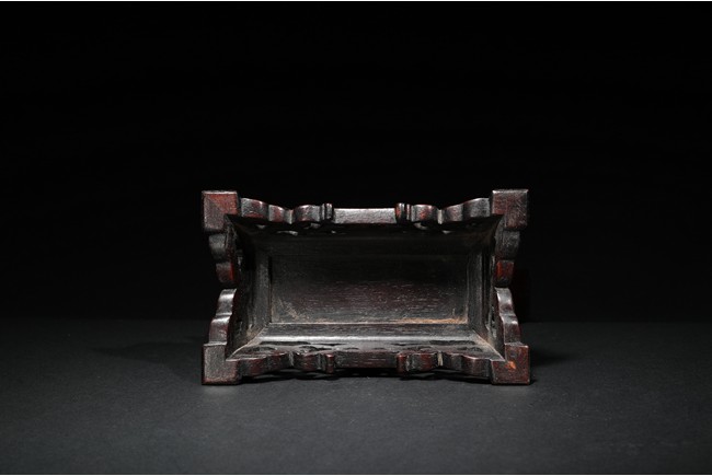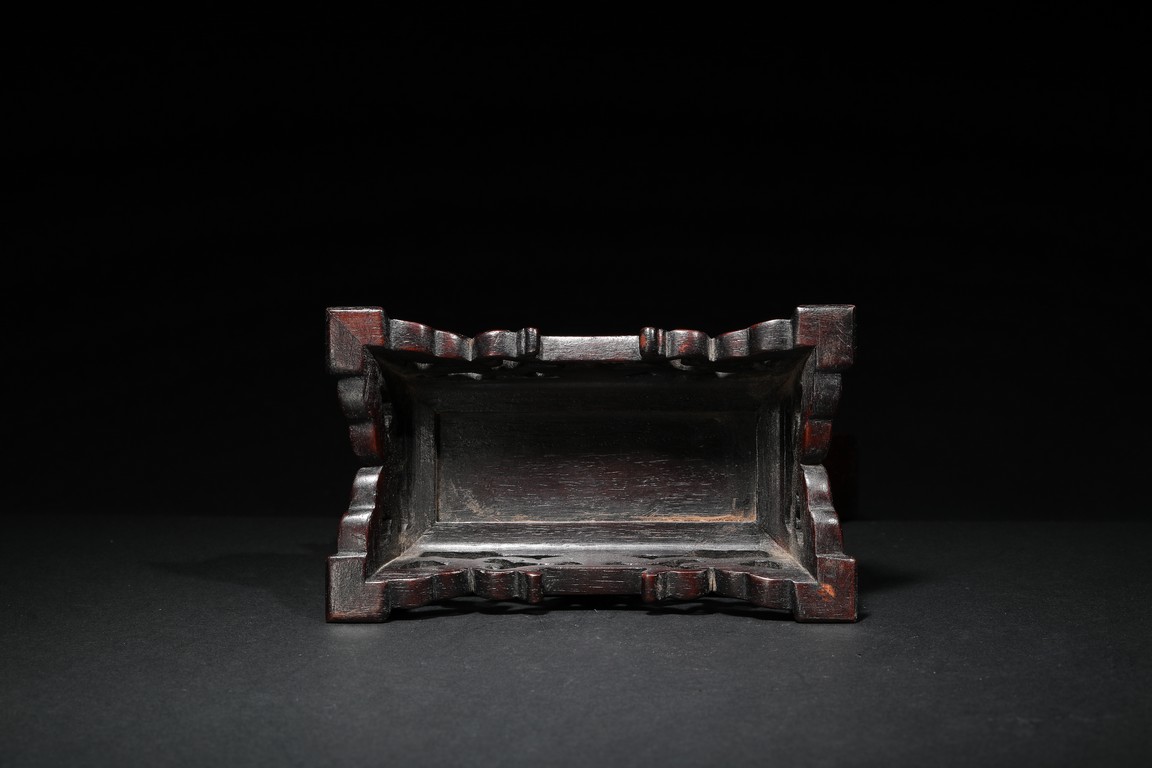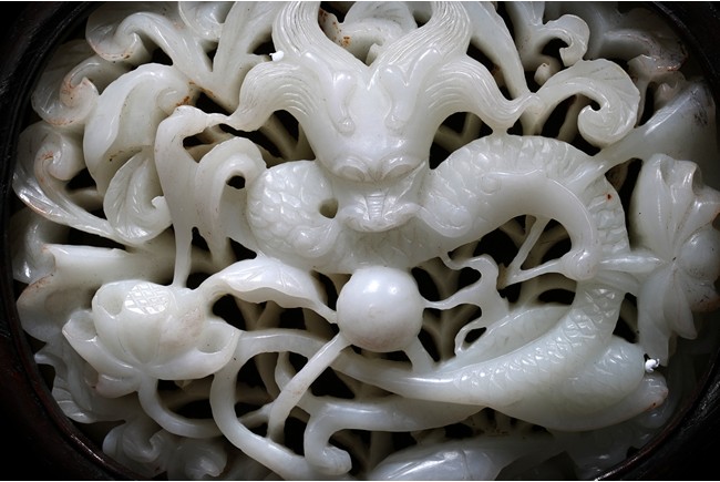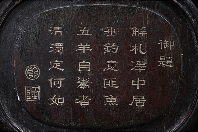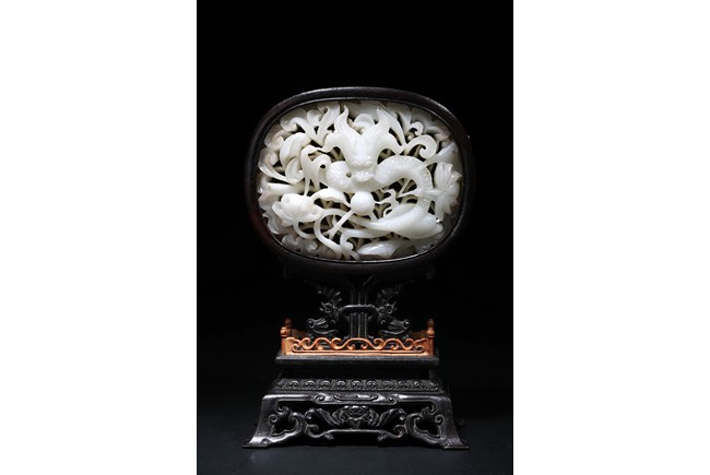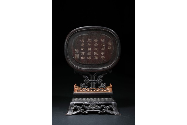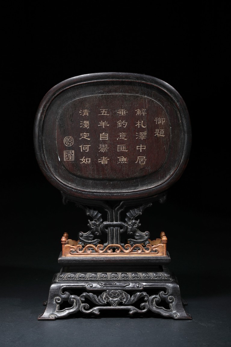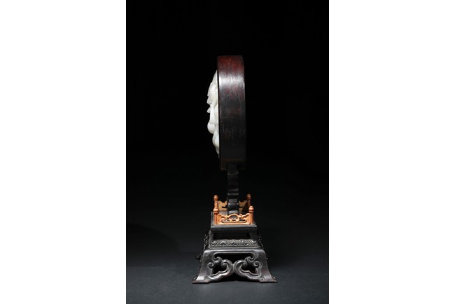 The white jade plaque of oval form, finely carved and pierced with a dragon shown in full frontal position encircling a flaming pearl, reserved on a background decorated with enclosing feathery lotus scrolls, the reverse with an poem inscription, all within a fitted rounded zitan wood, supported on a elaborately carved stand with an apron carved with archaistic scrolls and ruyi pattern.