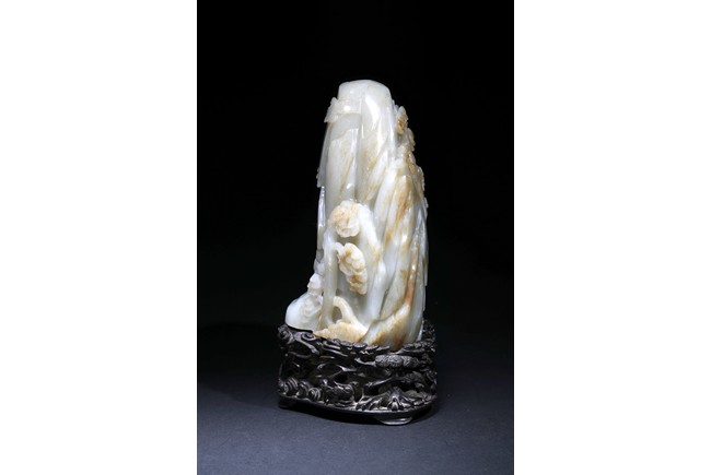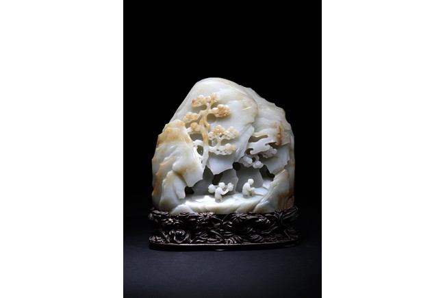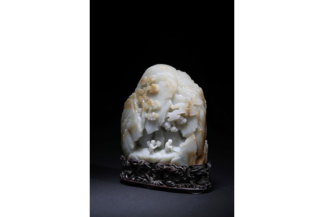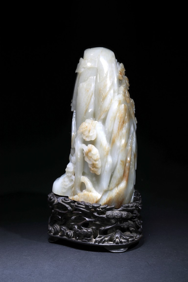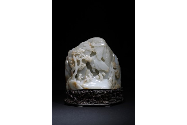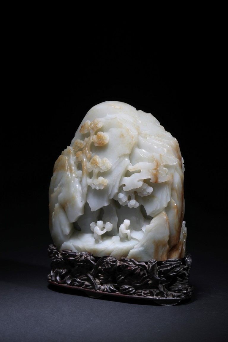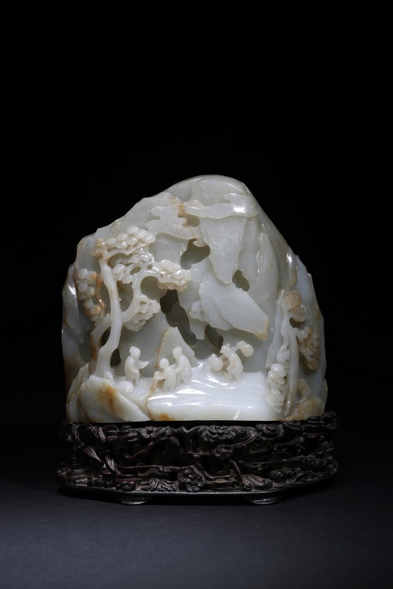 Of irregular shape, deeply and deftly carved on one side in varying depths of relief with an elderly woman under pine trees accompanied by an attendant to climbing the mountain, the reverse with an elderly scholar chatting with attendants under a tall gnarled pine tree, all within a landscape of craggy rock faces, the stone of even white tone with russet inclusion, with fitted wood stand. Qing Dynasty period.