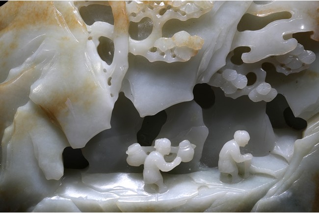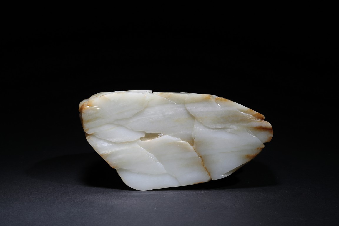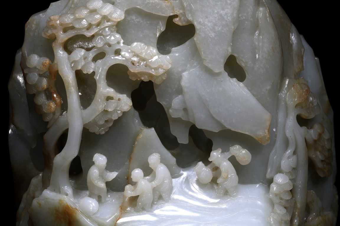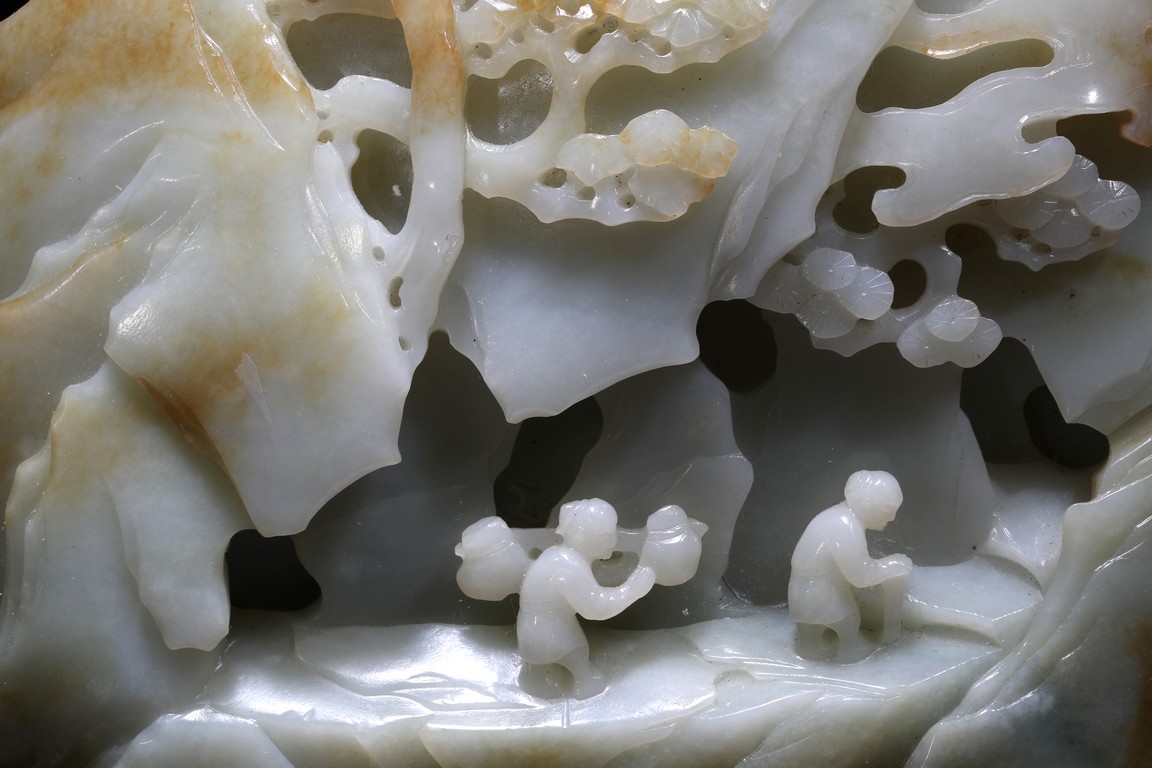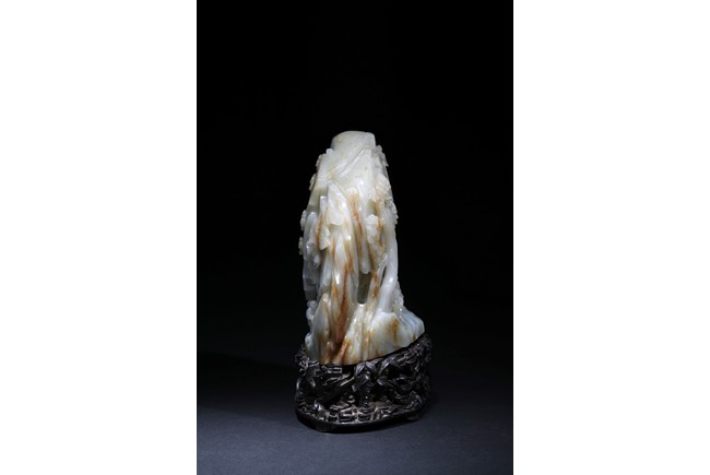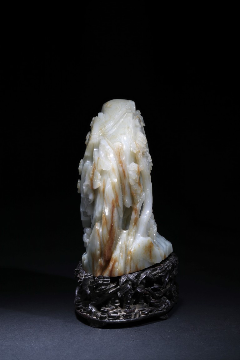 Of irregular shape, deeply and deftly carved on one side in varying depths of relief with an elderly woman under pine trees accompanied by an attendant to climbing the mountain, the reverse with an elderly scholar chatting with attendants under a tall gnarled pine tree, all within a landscape of craggy rock faces, the stone of even white tone with russet inclusion, with fitted wood stand. Qing Dynasty period.
