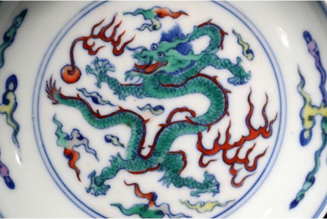 With shallow rounded sides rising from a tapered foot to a flared rim, the interior deftly painted in vivid tones of cobalt blue with a central medallion enclosing a green five-clawed dragon writhing amongst wucai scrolling clouds, the rim bordered by a colorful classic-scrolling band, the base with a six-character reign mark within a double circle. Qing Dynasty period.