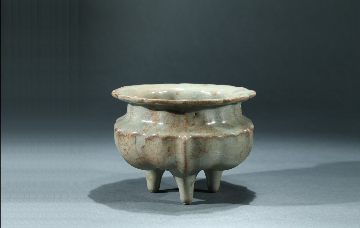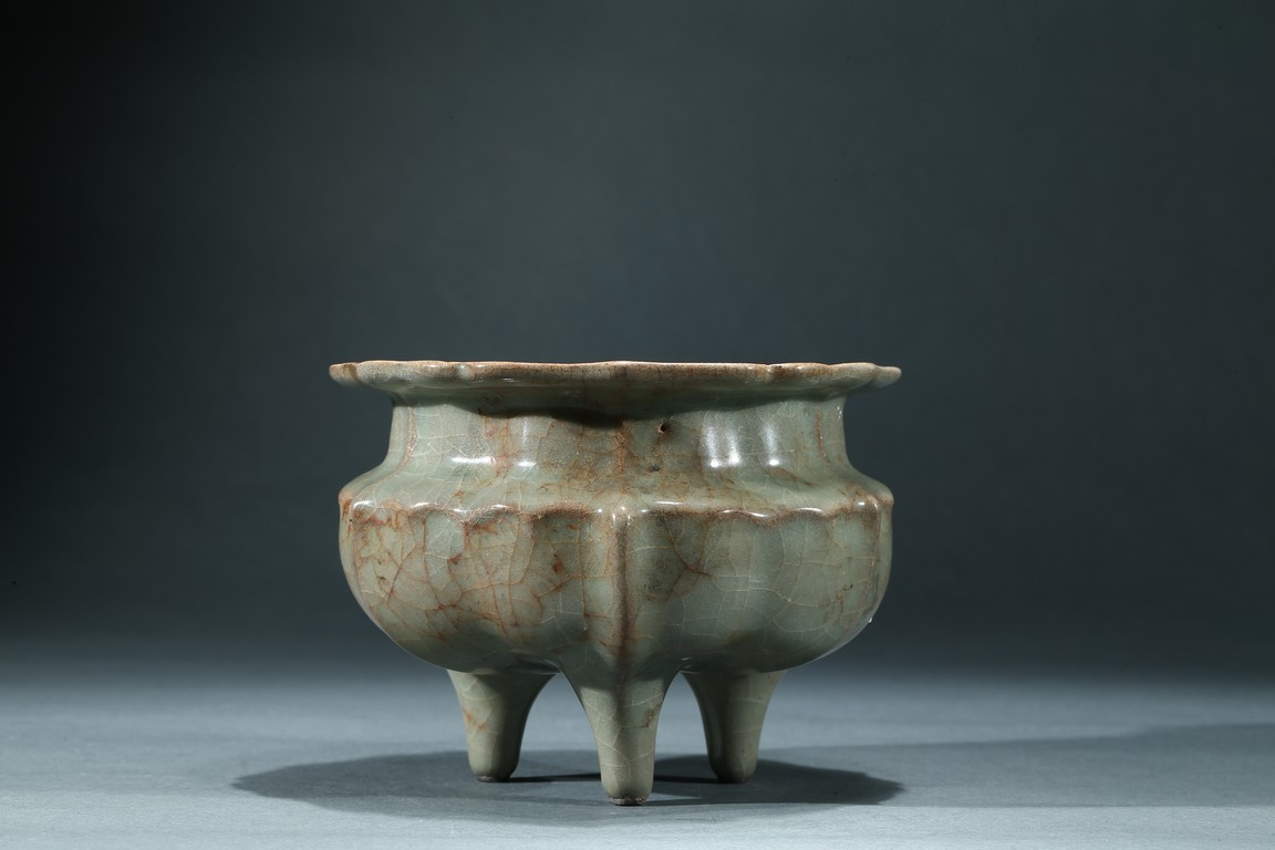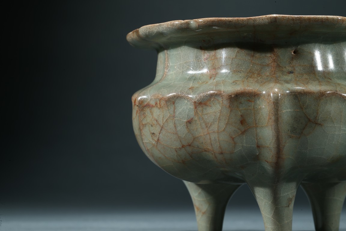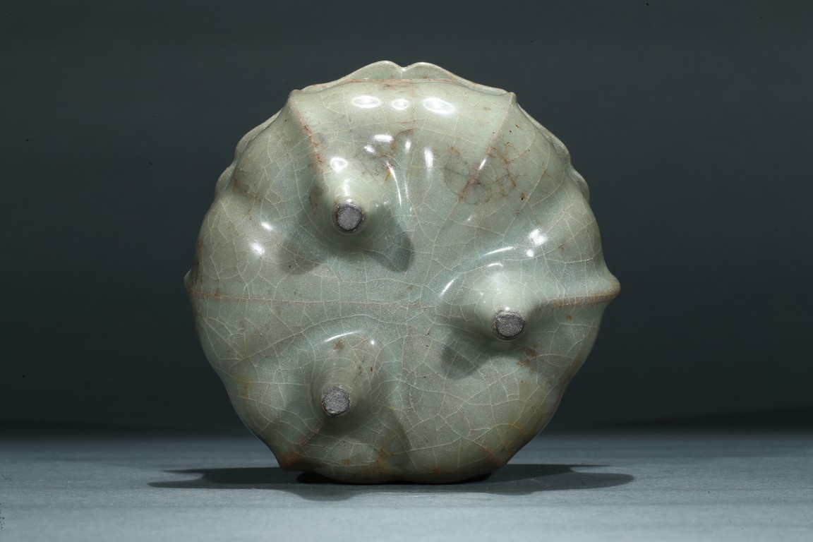 Of compressed lobed globular form with short neck and broad lobed-form everted rim, supported on three conical feet, modelled on th sides with several prominent ribs extending close to the foot and applied overall with a pale green glaze suffused with russet crackles. Song Dynasty period.