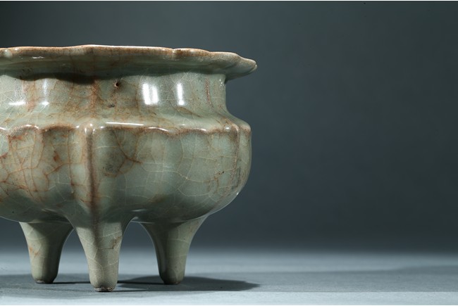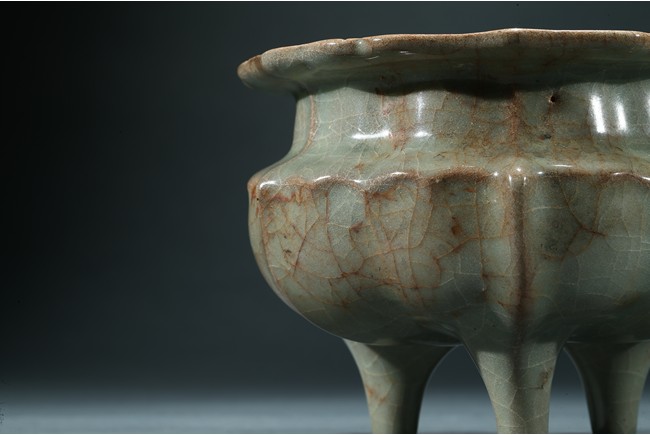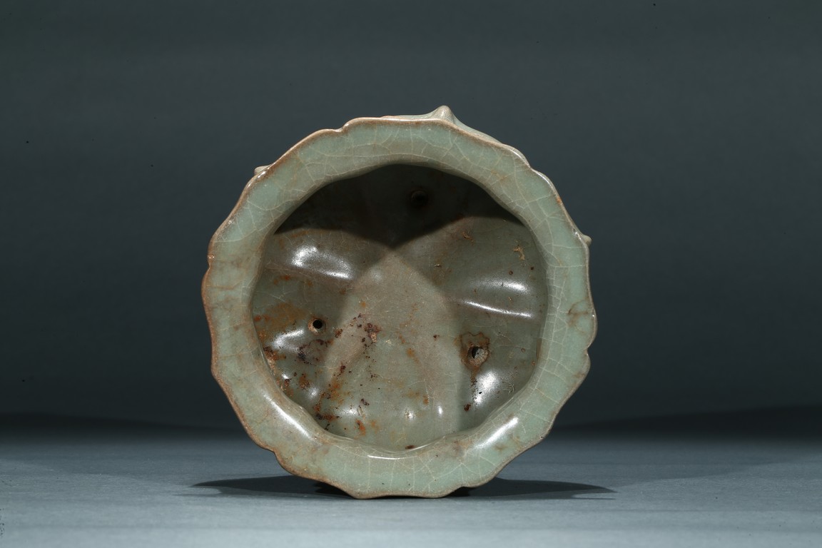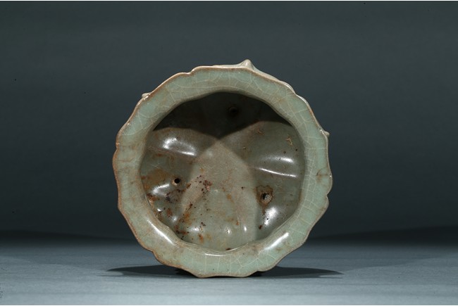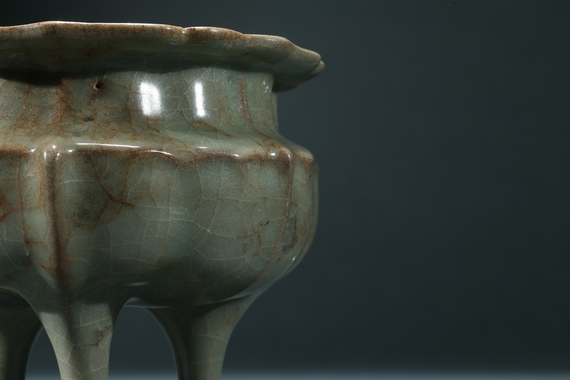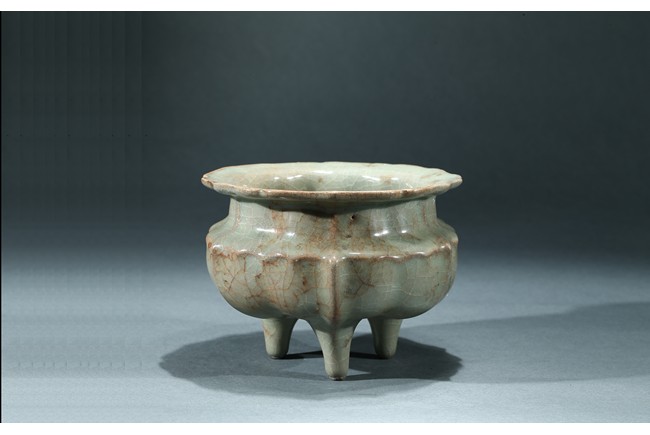 Of compressed lobed globular form with short neck and broad lobed-form everted rim, supported on three conical feet, modelled on th sides with several prominent ribs extending close to the foot and applied overall with a pale green glaze suffused with russet crackles. Song Dynasty period.