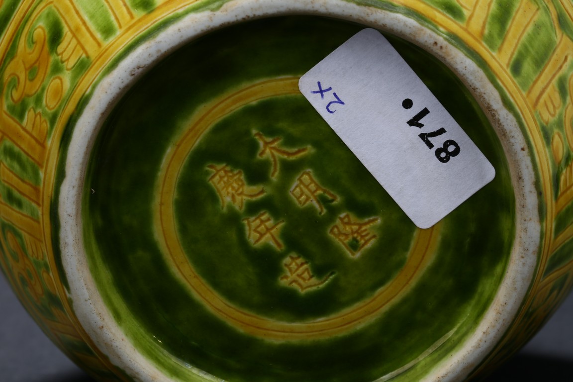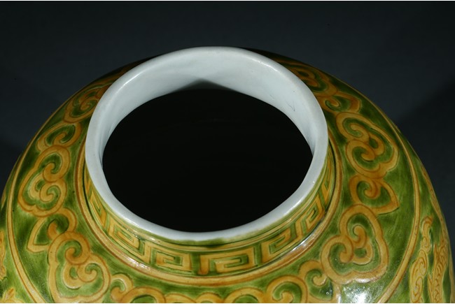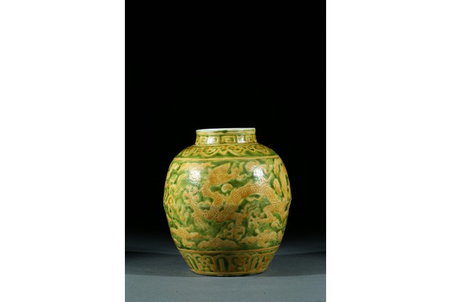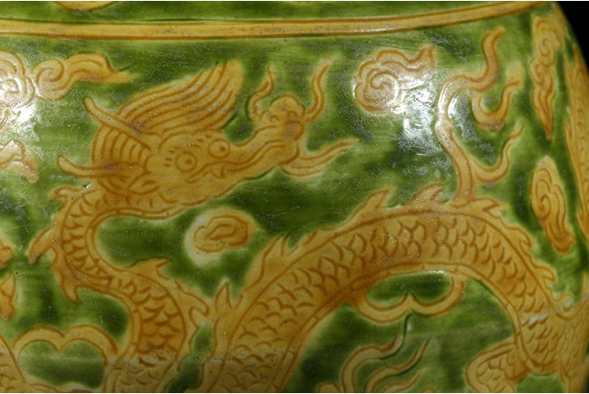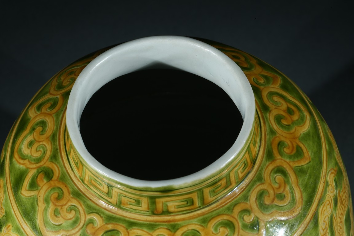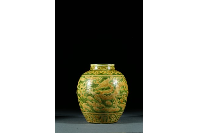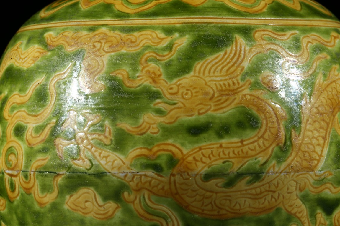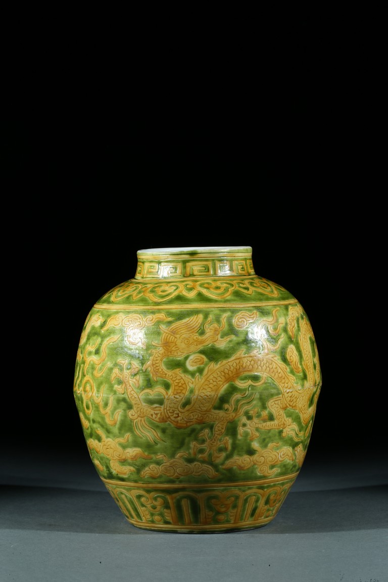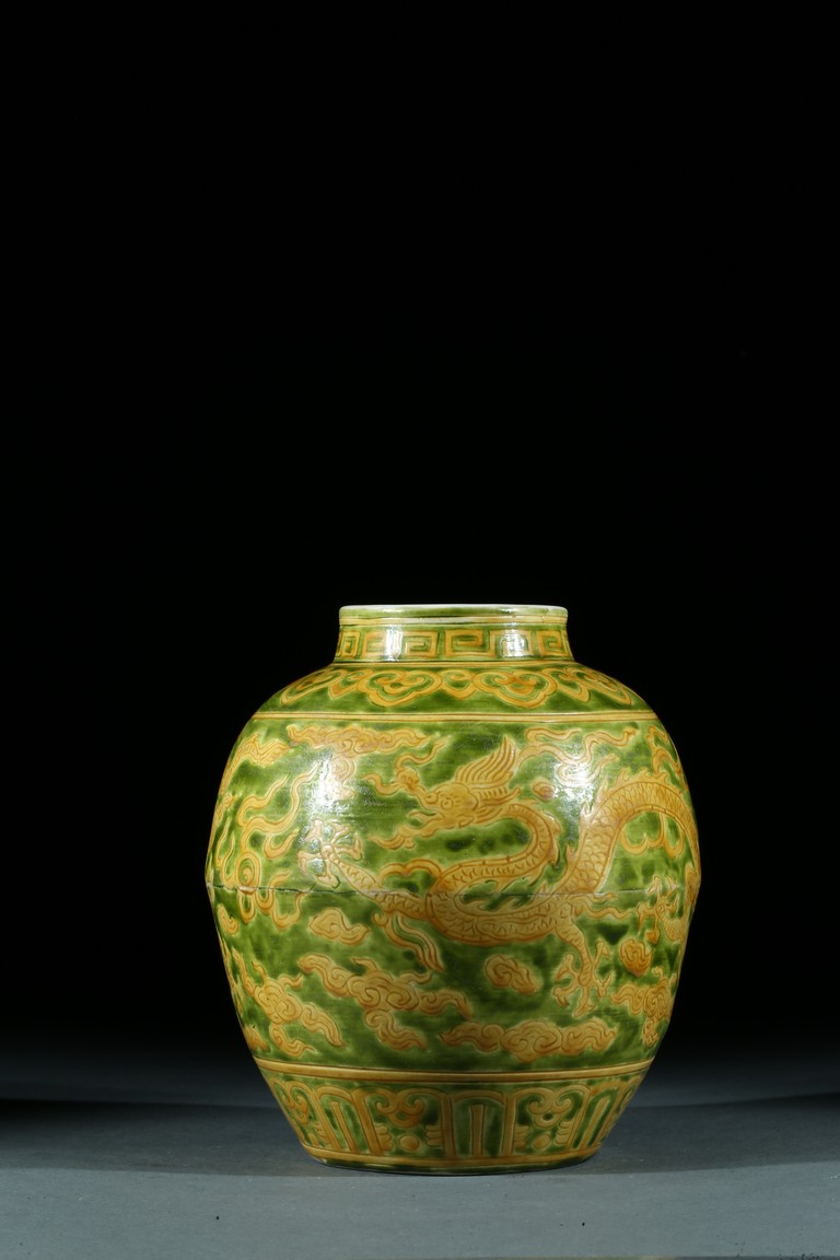 Of ovoid form, incised around the body and painted in yellow glaze against bright green ground with five-clawed dragons with wide open mouth, horns curved and mane upswept, writhing amidst clouds, all below a bands of ruyi head and and above a border of stylized floral pattern around the foot. Ming Dynasty period.