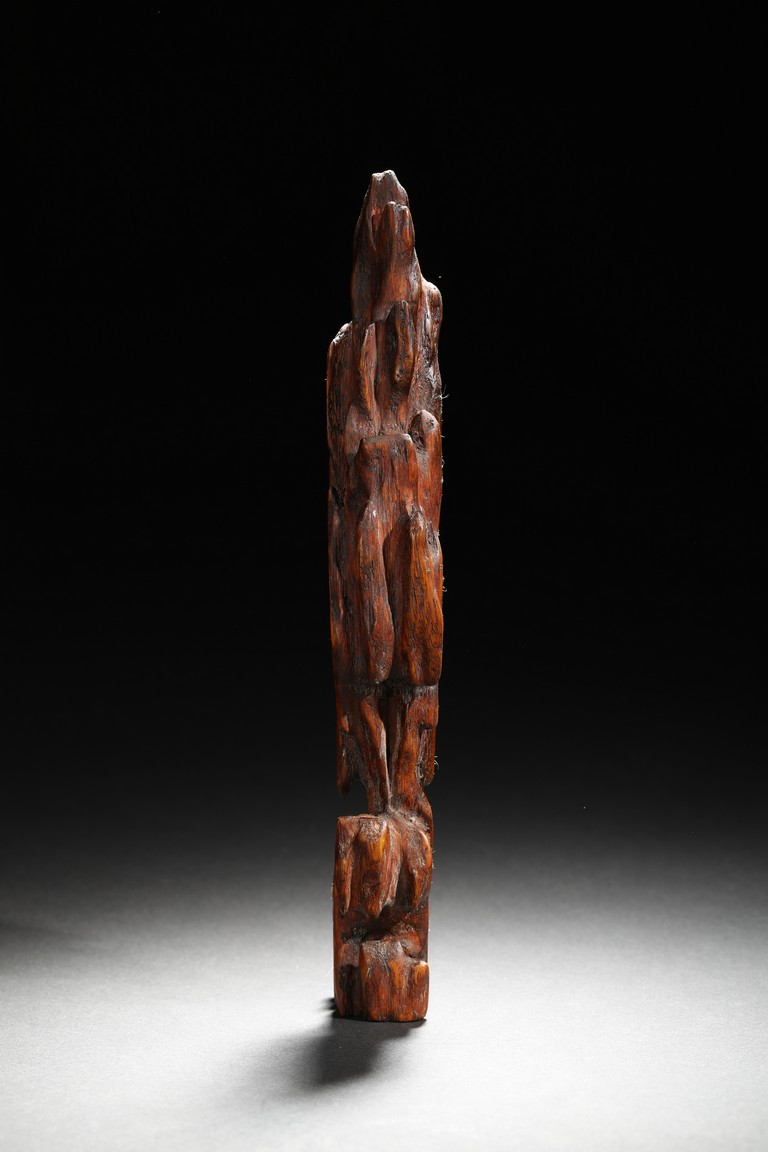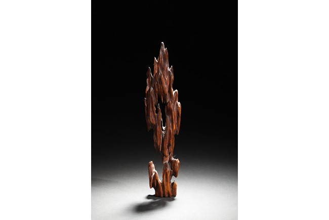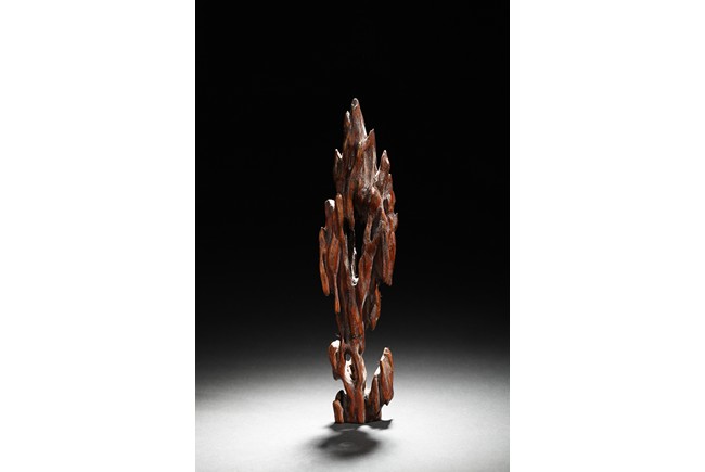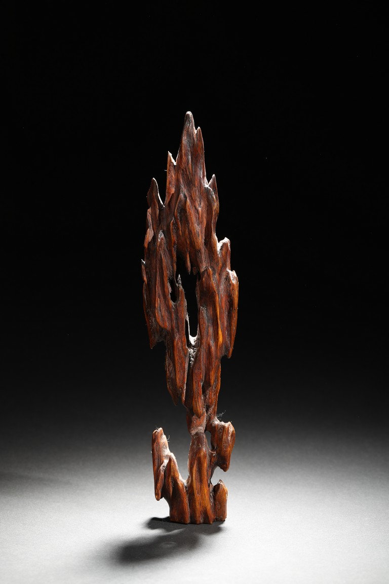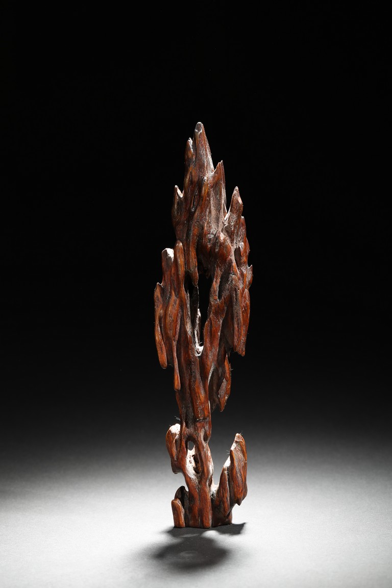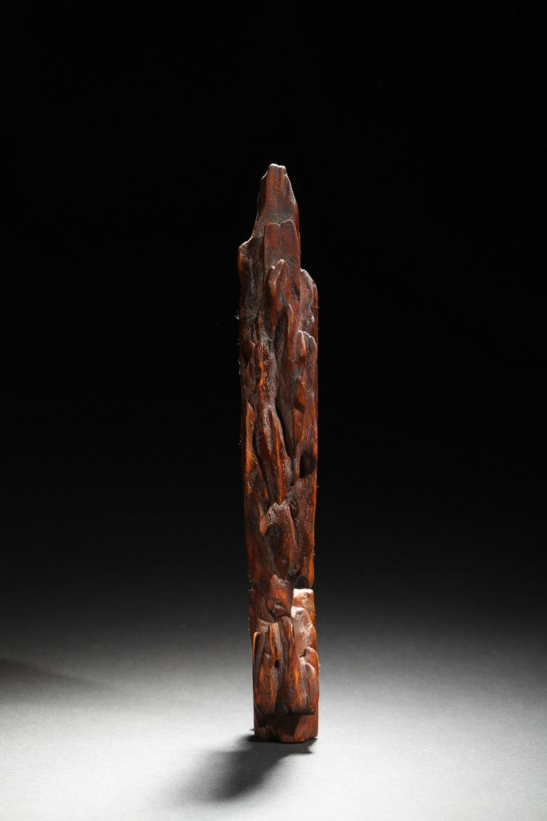 Of naturalistic slender upright form that resembles mountain boulder with numerous peaks and valleys, with slight aroma characteristic of agarwood. Qing Dynasty period.