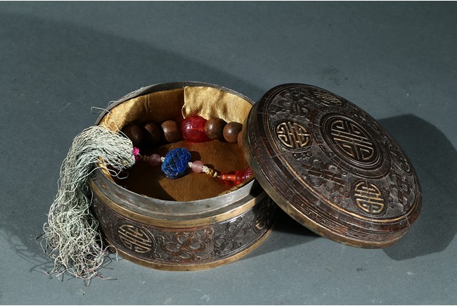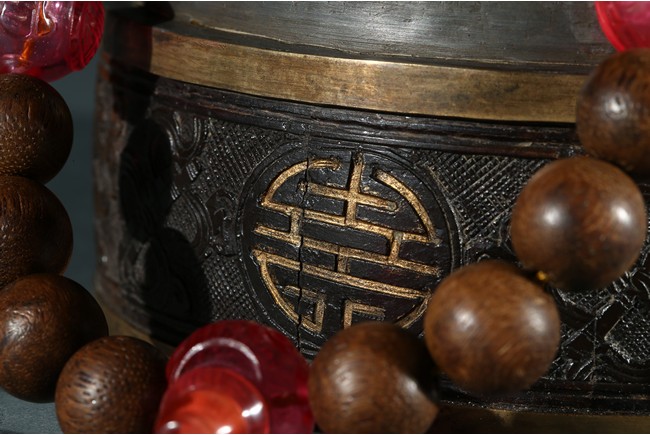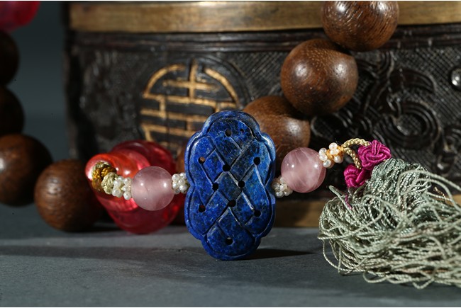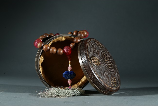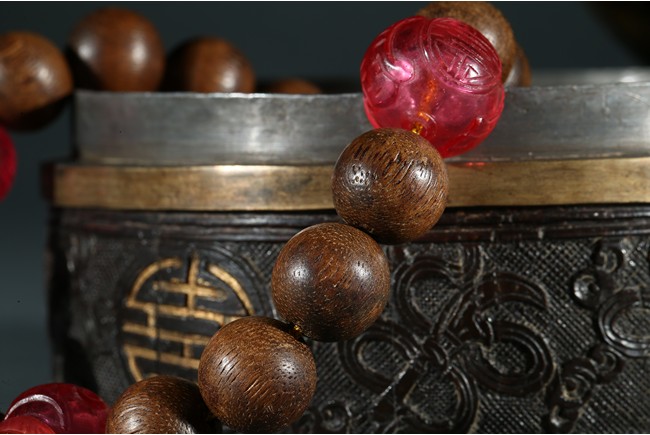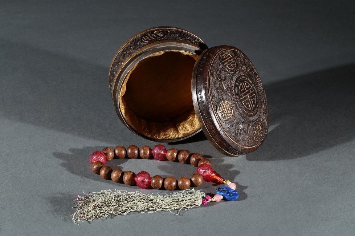 Composed of sixteen well-polished rounded agarwood beads, in the quartering confronted spaced by four rounded carved red beads, one of them joined by a decorated strand composed of a lapis lazuli chinese-knot shaped pendant, tiny white pearl cluster beads and two small pink quartz beads. Qing Dynasty period.