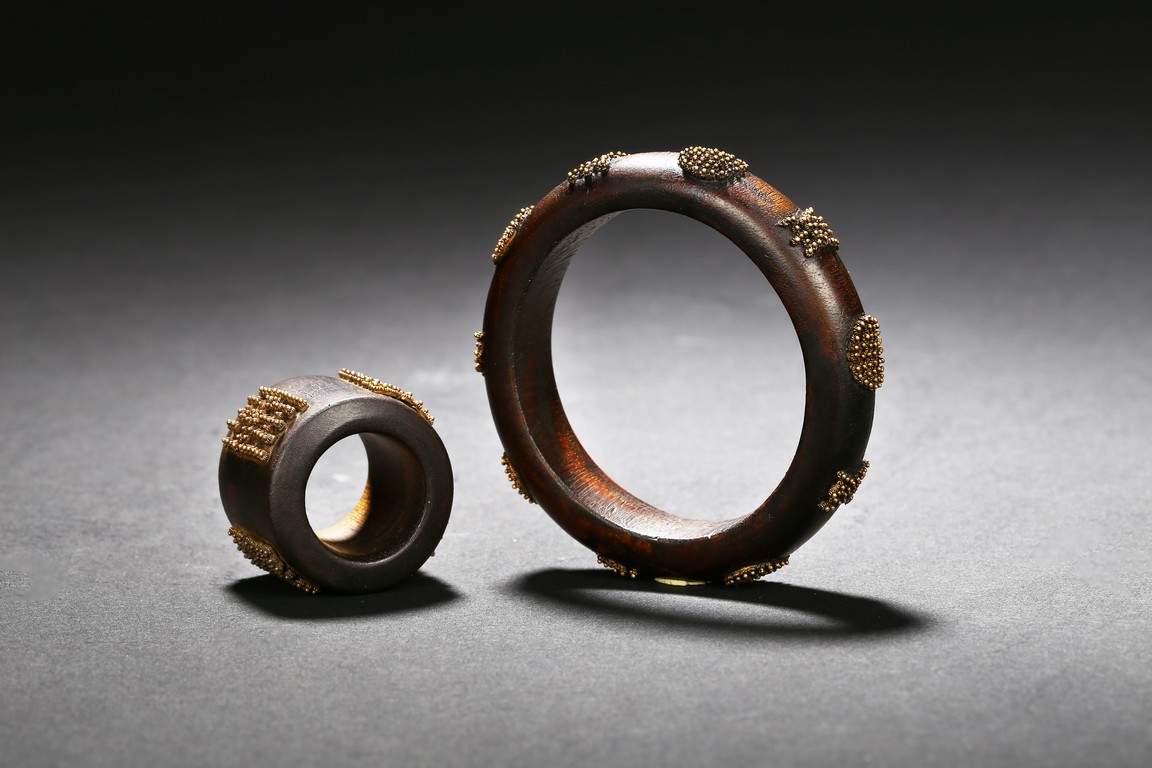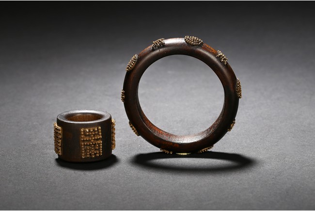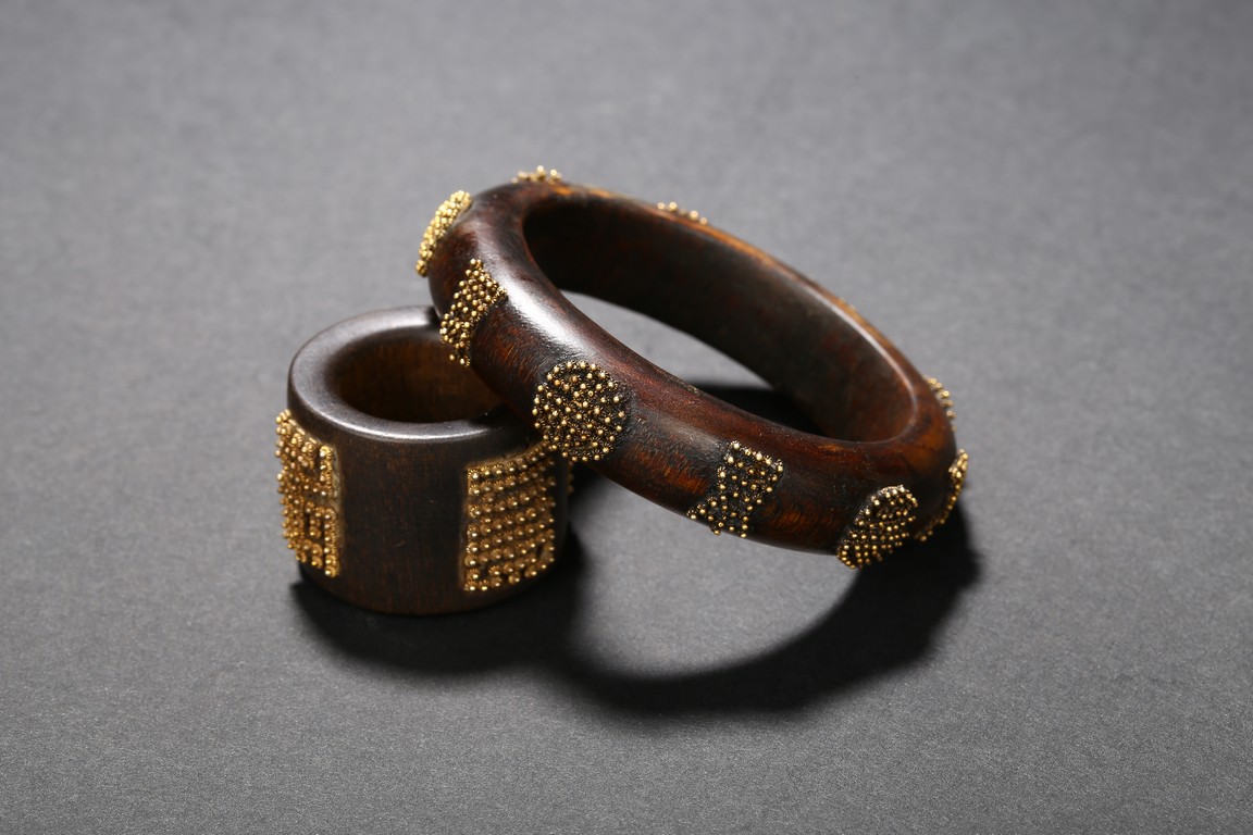The set comprising of an agarwood bangle and an agarwood archer's ring , each exterior is finely inlaid in tiny gold or gilt beads with stylized character and auspicious symbols. Qing Dynasty period.