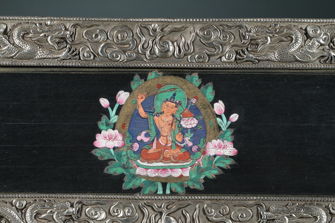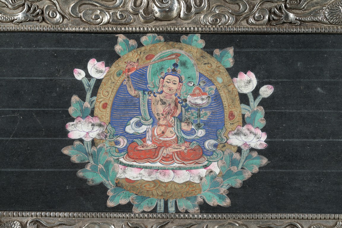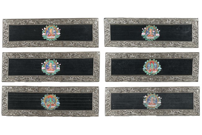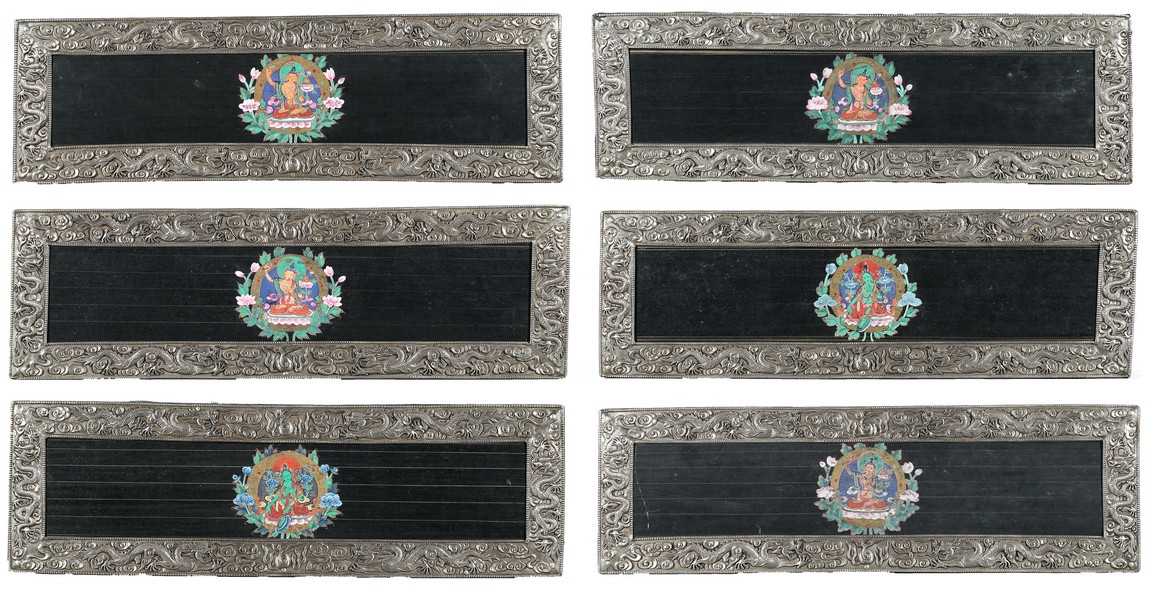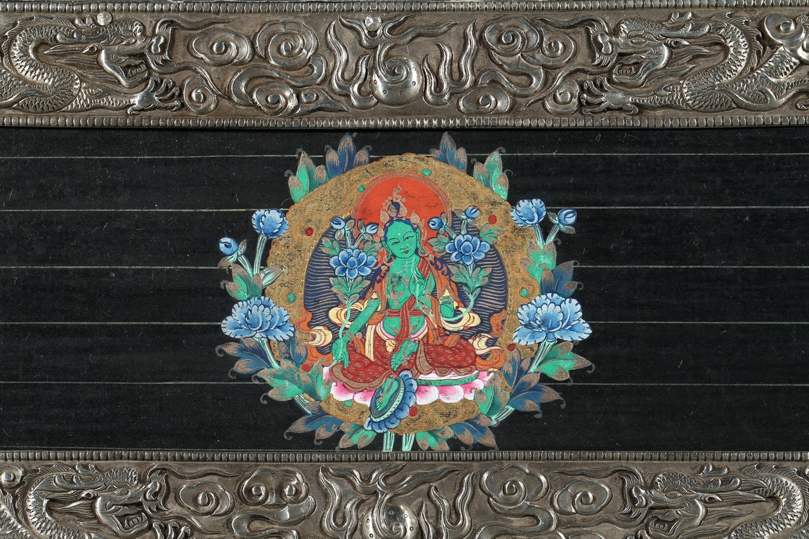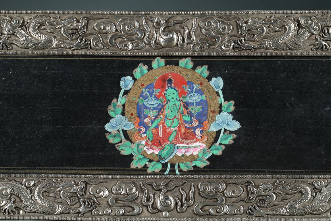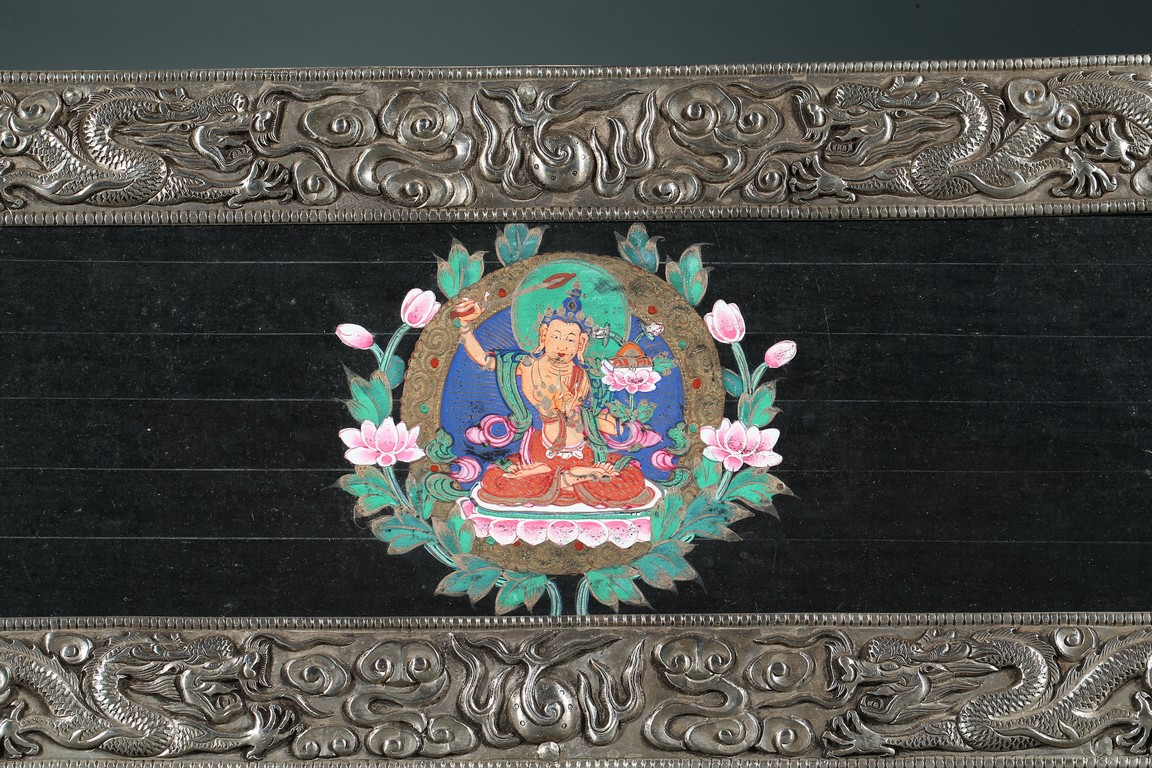 Each manuscript cover painted to the center with a bodhisattva medallion in various pigments, the silver border cast with sinuous confronted five-claw dragons chasing flaming pearl, the reverse incised with the eight buddhist emblems. Qing Dynasty period.