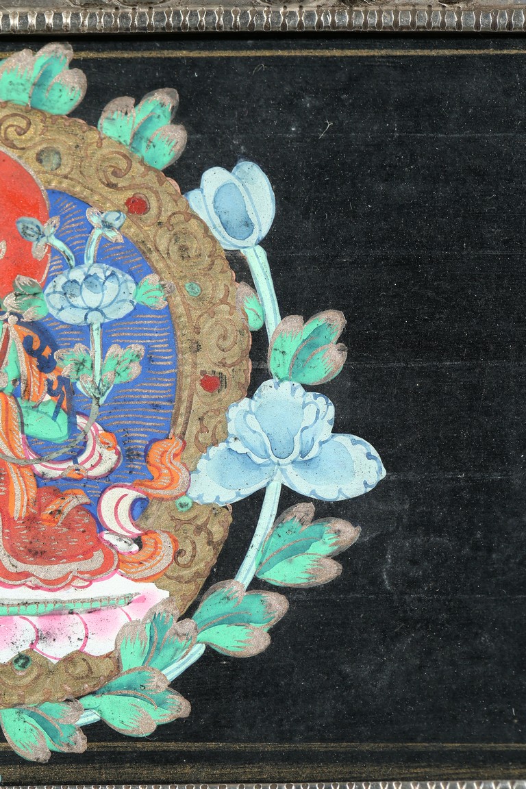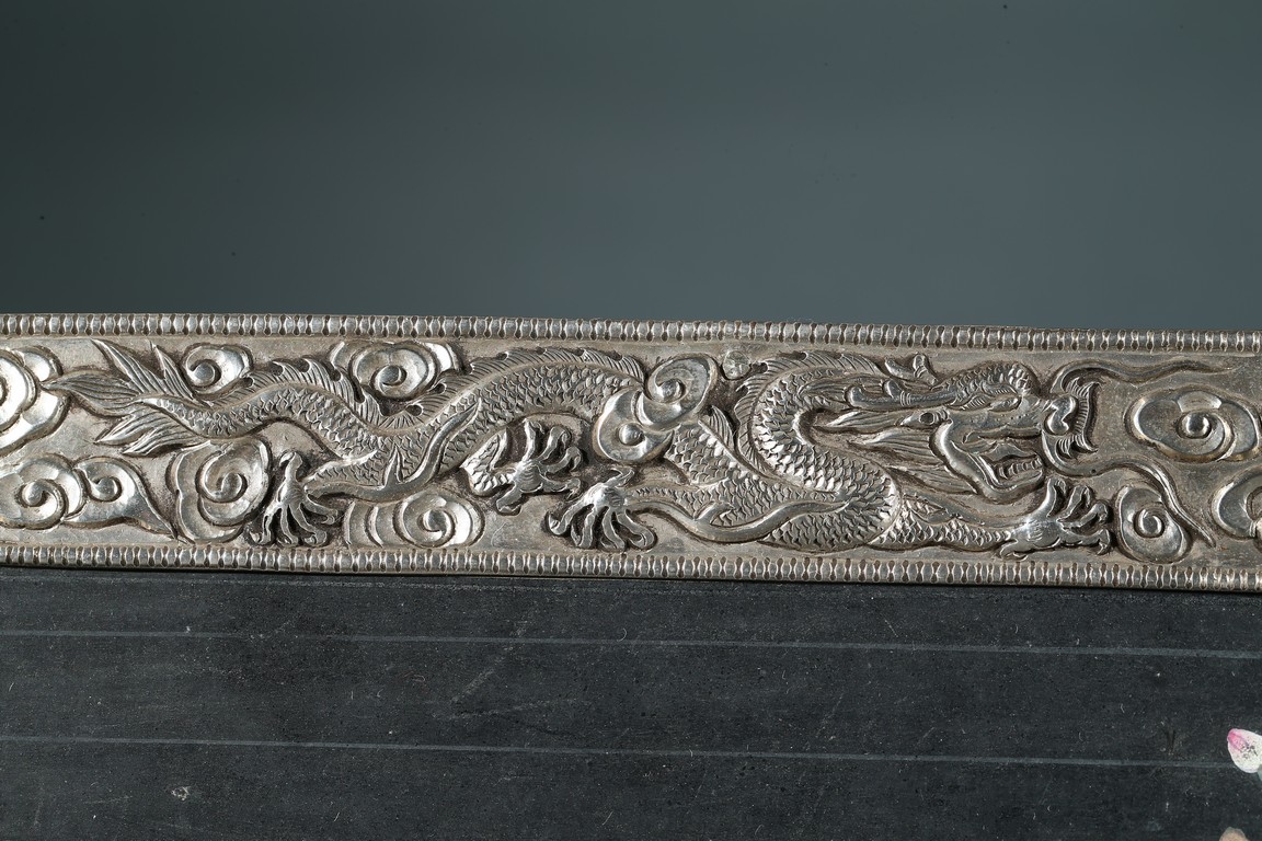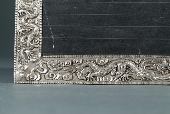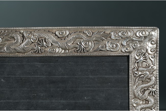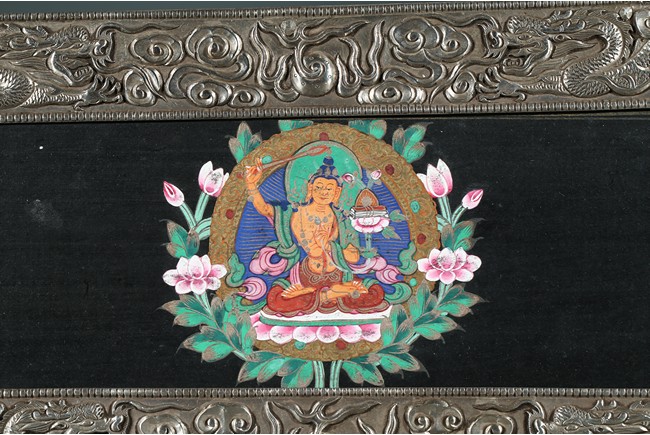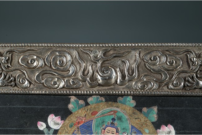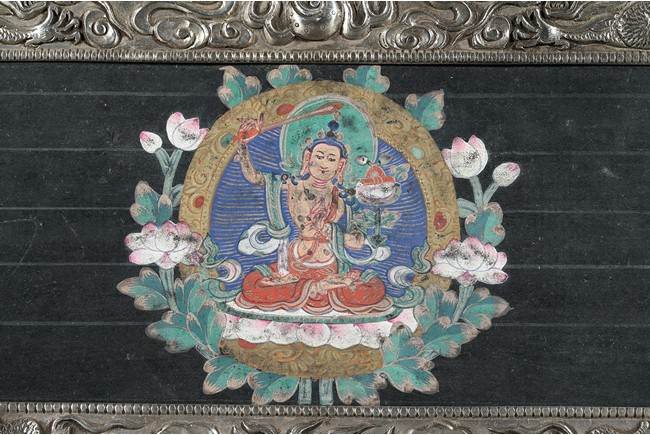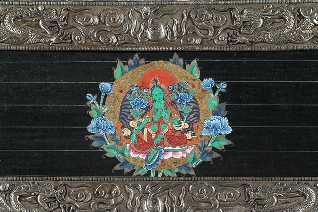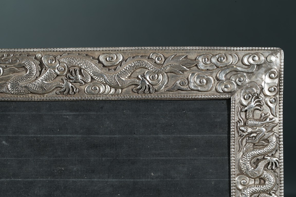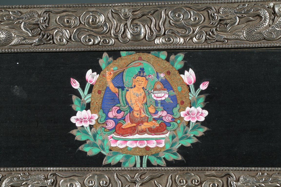 Each manuscript cover painted to the center with a bodhisattva medallion in various pigments, the silver border cast with sinuous confronted five-claw dragons chasing flaming pearl, the reverse incised with the eight buddhist emblems. Qing Dynasty period.