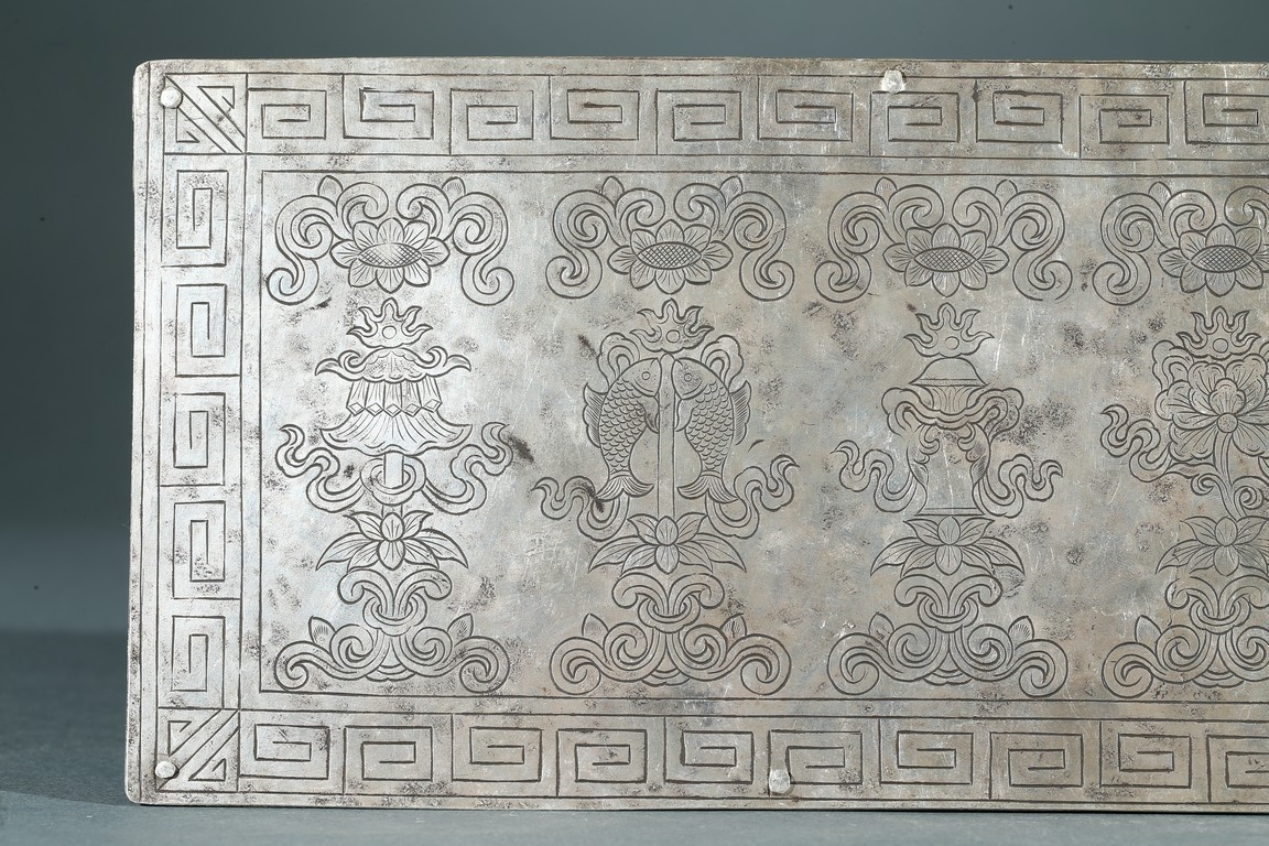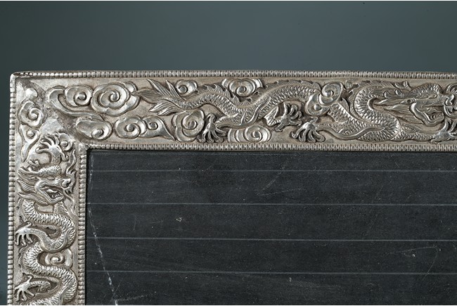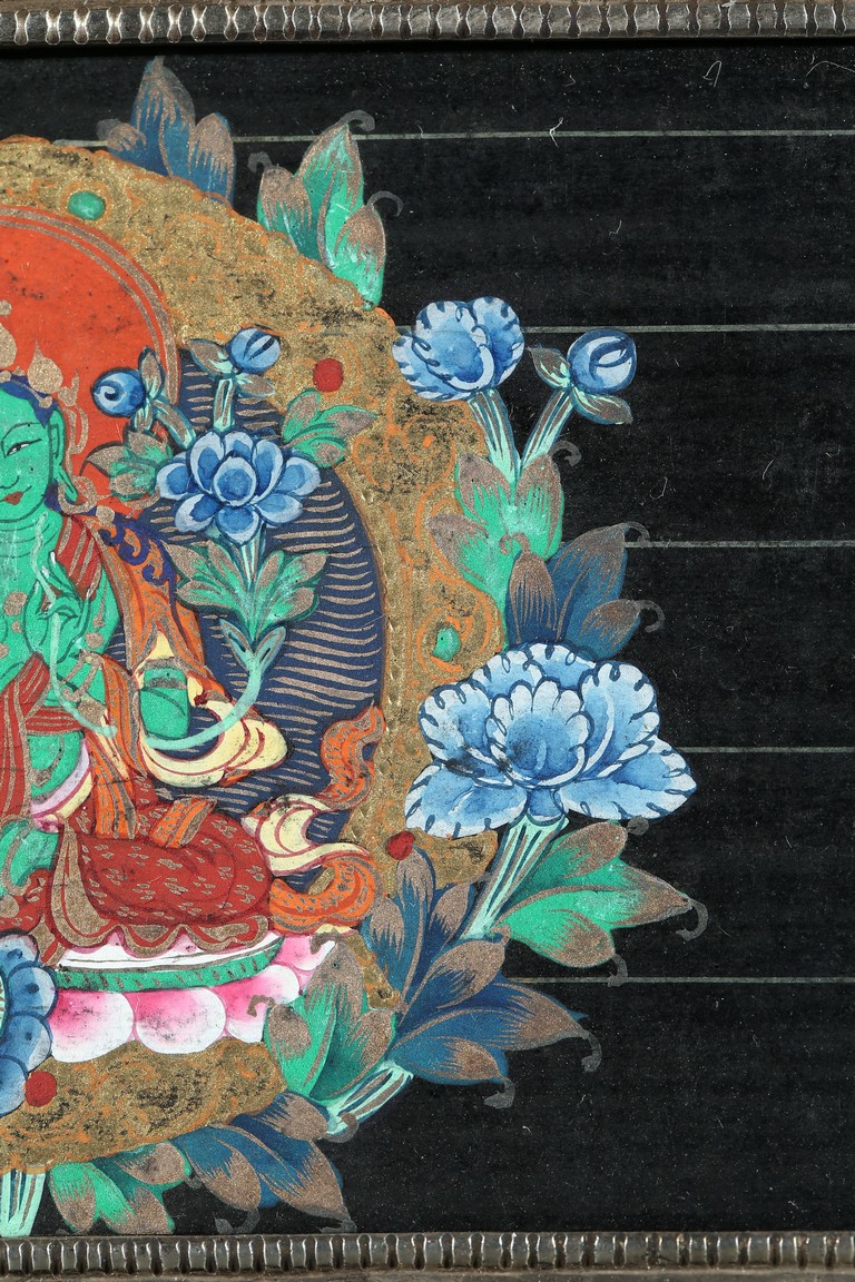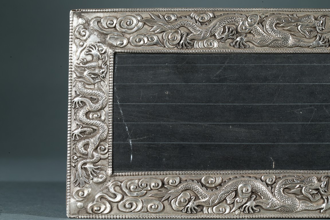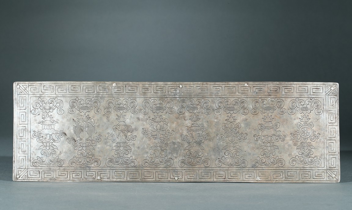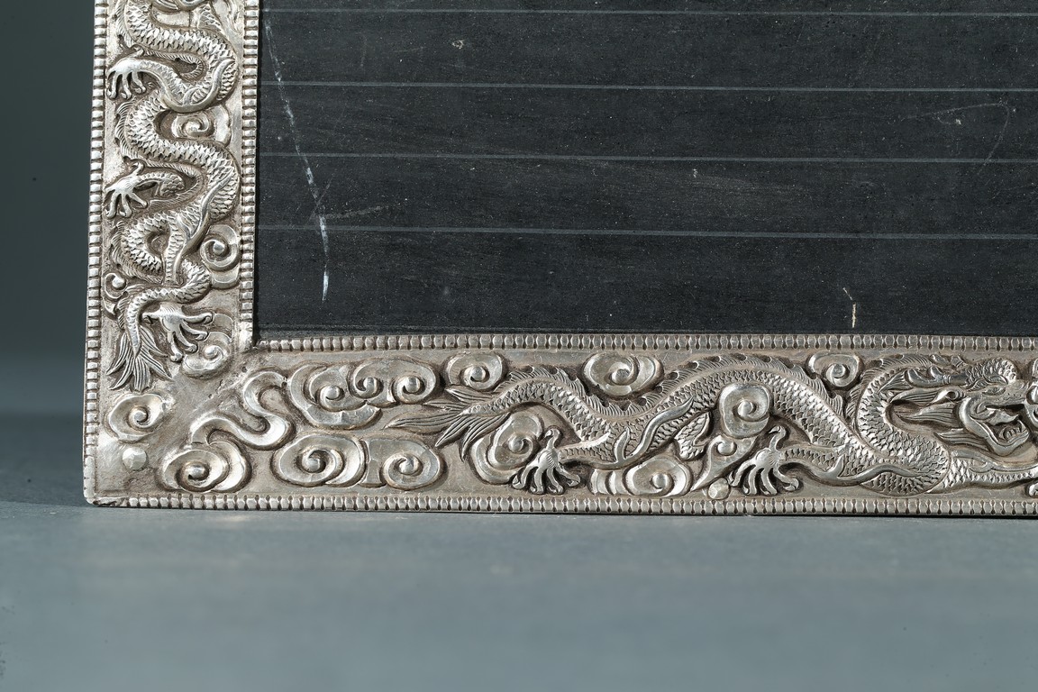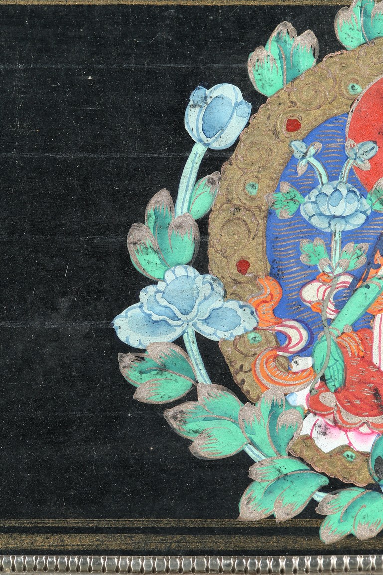 Each manuscript cover painted to the center with a bodhisattva medallion in various pigments, the silver border cast with sinuous confronted five-claw dragons chasing flaming pearl, the reverse incised with the eight buddhist emblems. Qing Dynasty period.